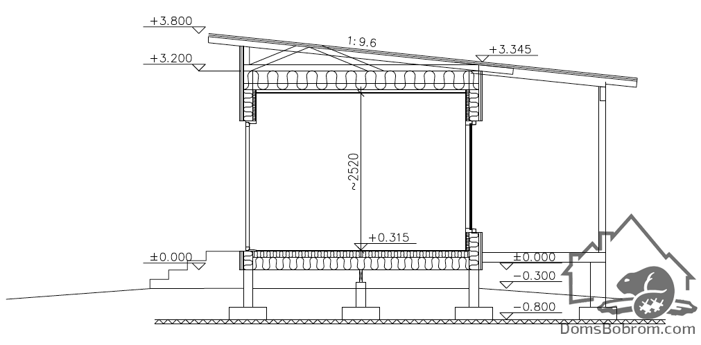 - Обвязка:Гидроизоляция по фундаменту, устройство нижней обвязки из антисептированного пакета досок 200x50x3.