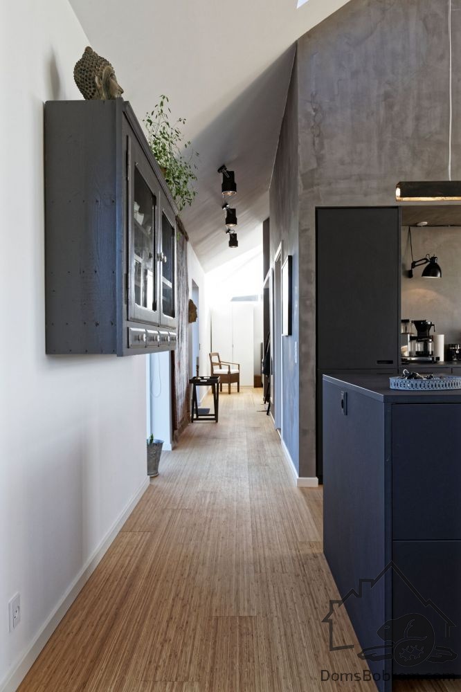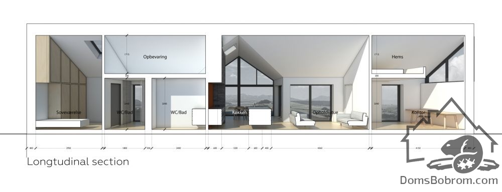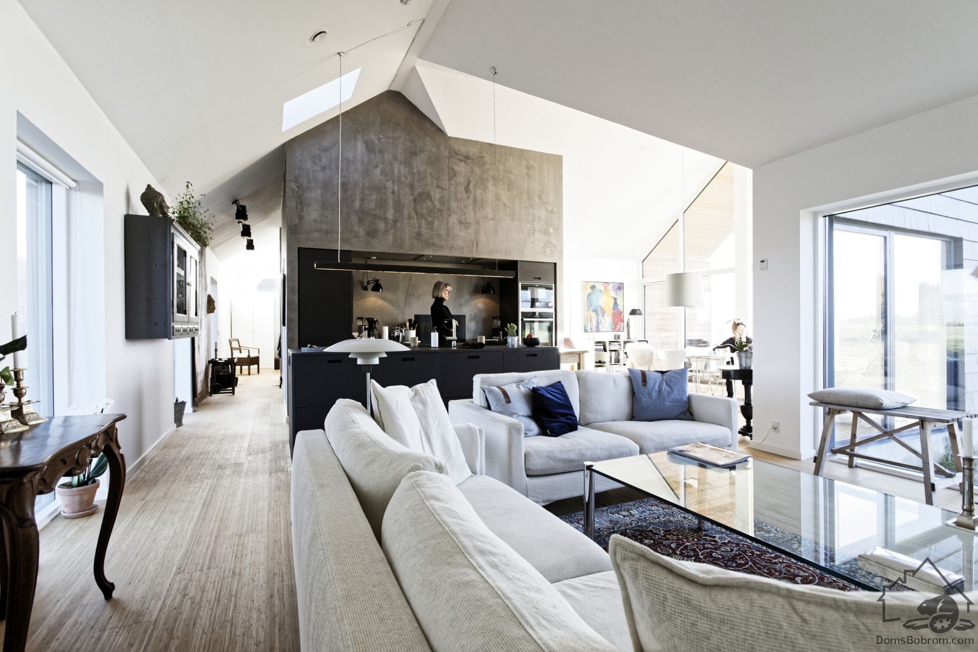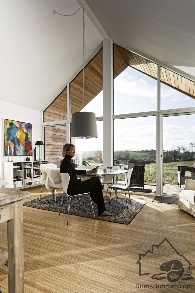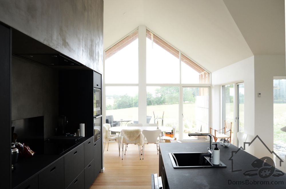 Центральная, самая светлая часть с панорамными окнами, отдана под кухню, столовую и гостиную. По обе стороны от нее есть два небольших крыла с приватными помещениями (спальными и кабинетом). За кухонным блоком расположены ванная комната, небольшой санузел и прачечная. Огромная площадь остекления позволяет сократить расходы на освещение. В зоне кухни, а также в главной спальне встроены небольшие мансардные окна, добавляющие еще больше света.