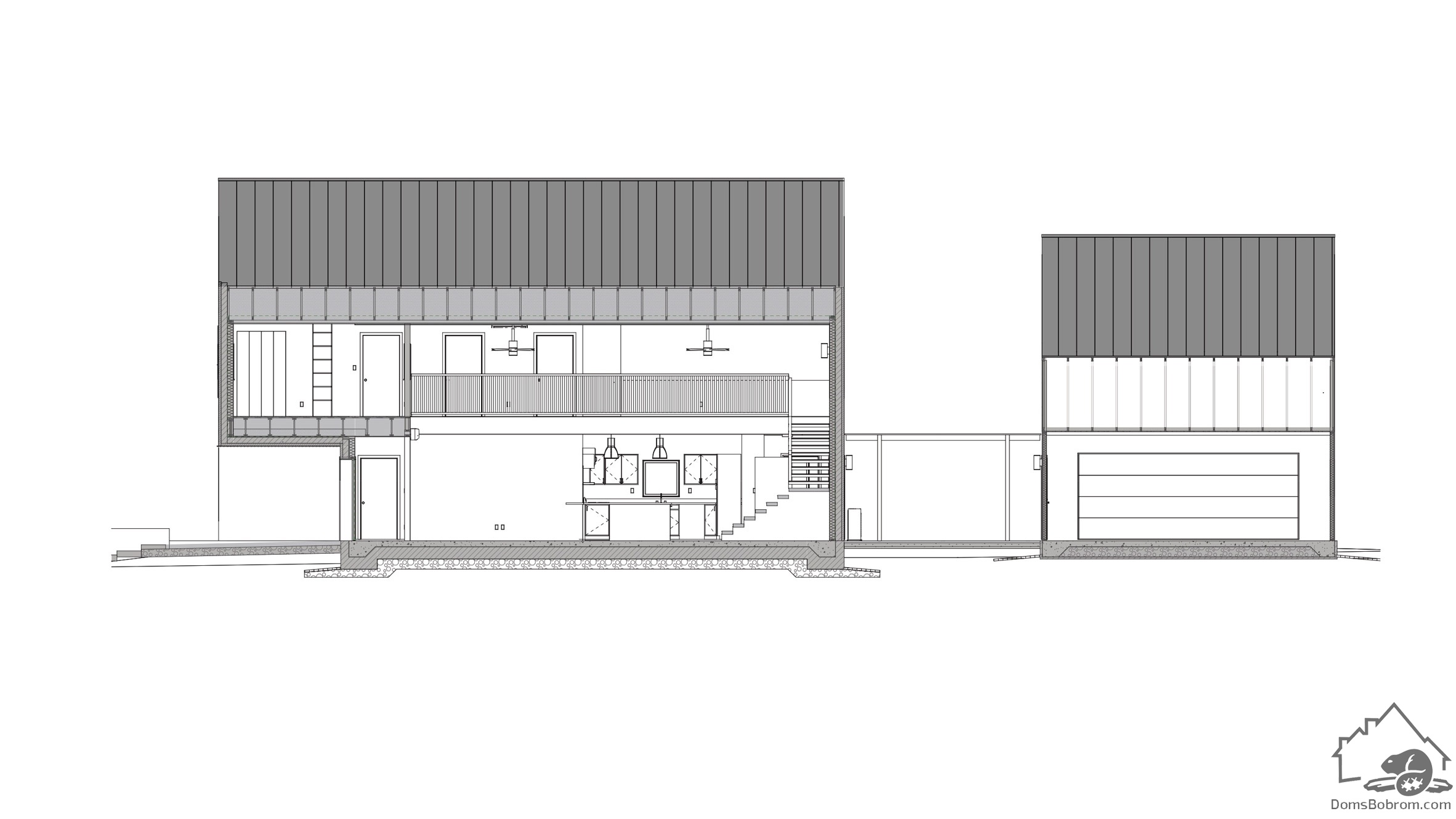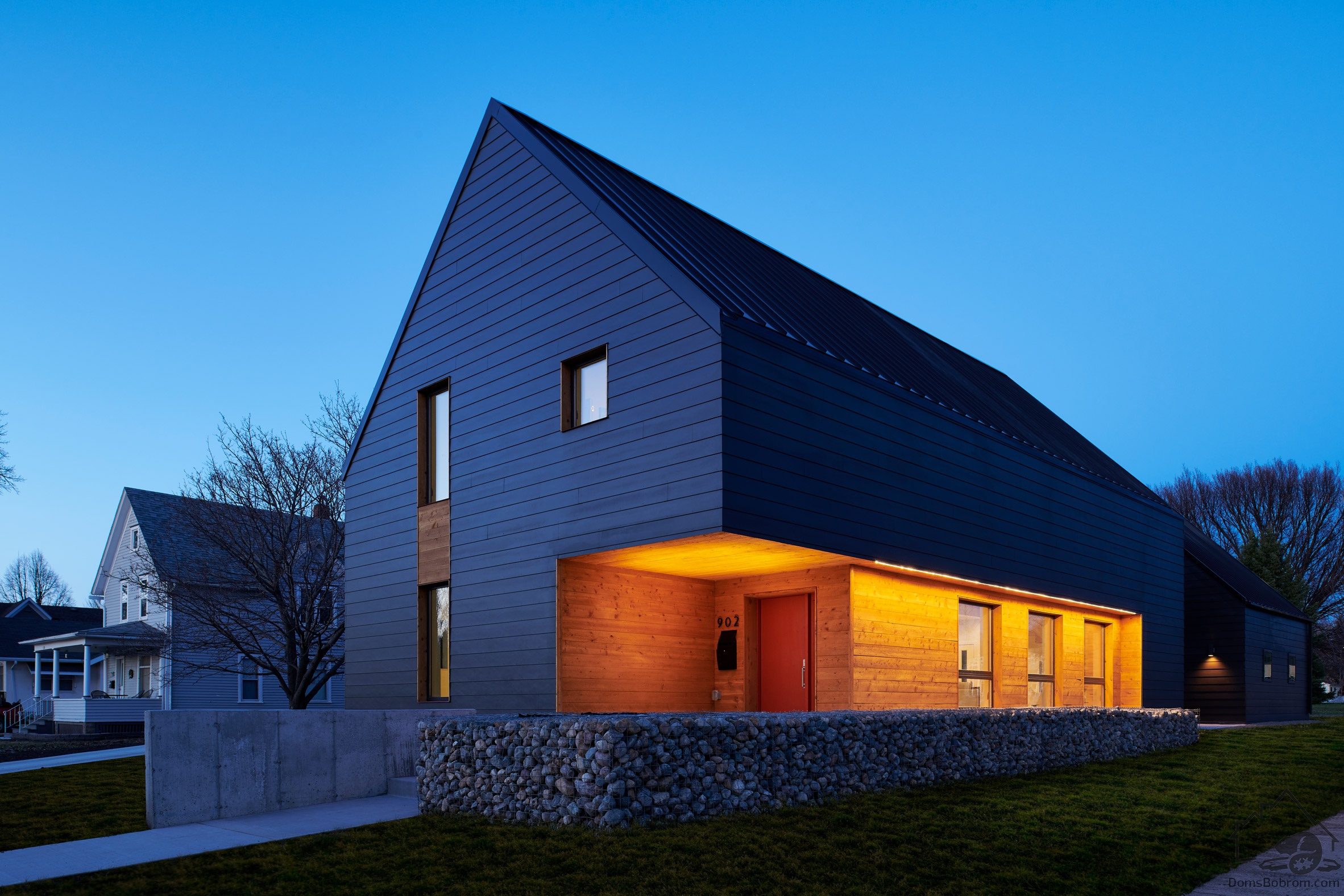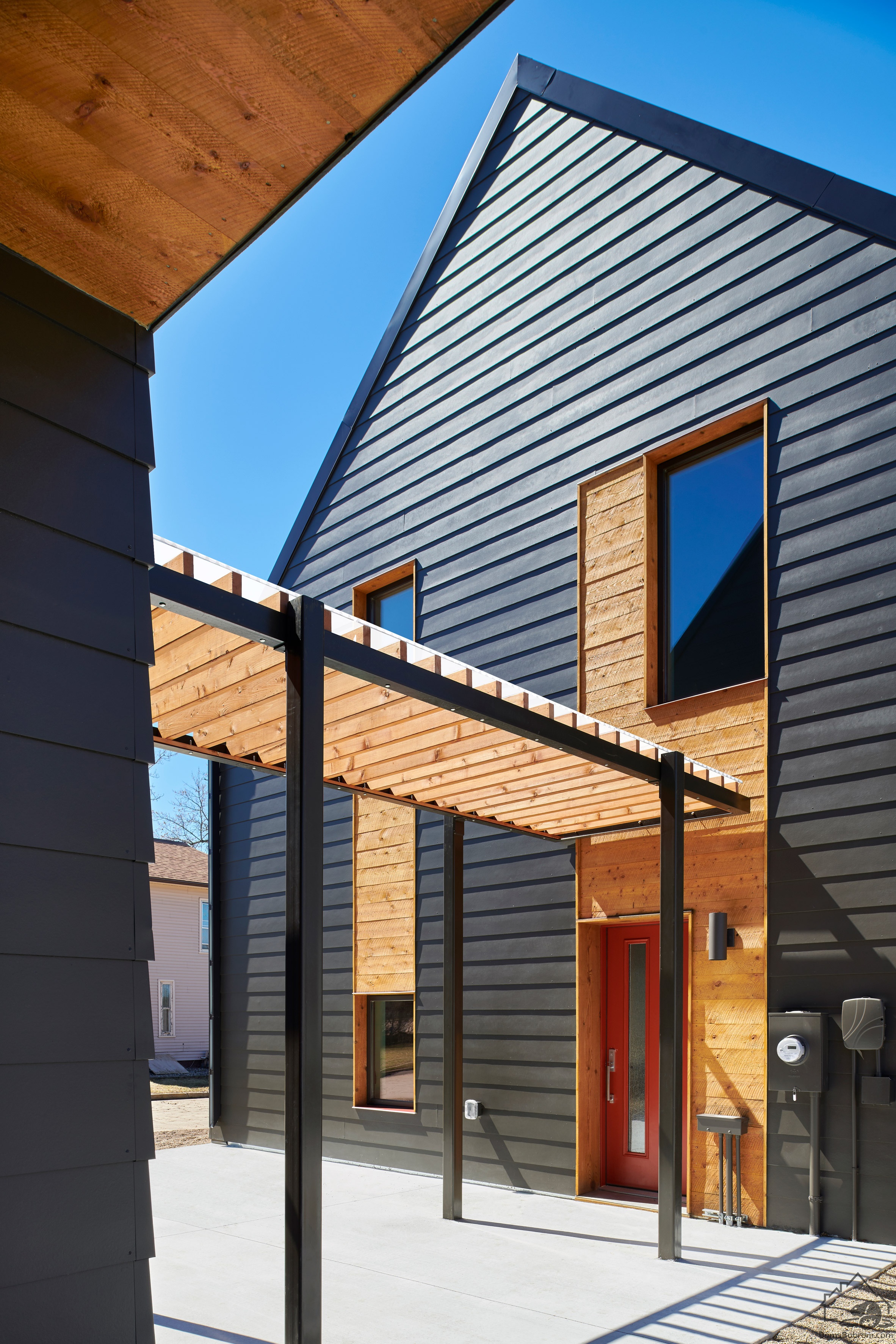 Крыша барнхауса BRK спроектирована так, чтобы нависать над проемами на южном фасаде, чтобы обеспечить затенение в теплую погоду. Часть фасада как бы отрезана и образует небольшое входное крыльцо. В задней части дома внешний двор, покрытый деревянными рейками, соединяется с отдельностоящим гаражом.