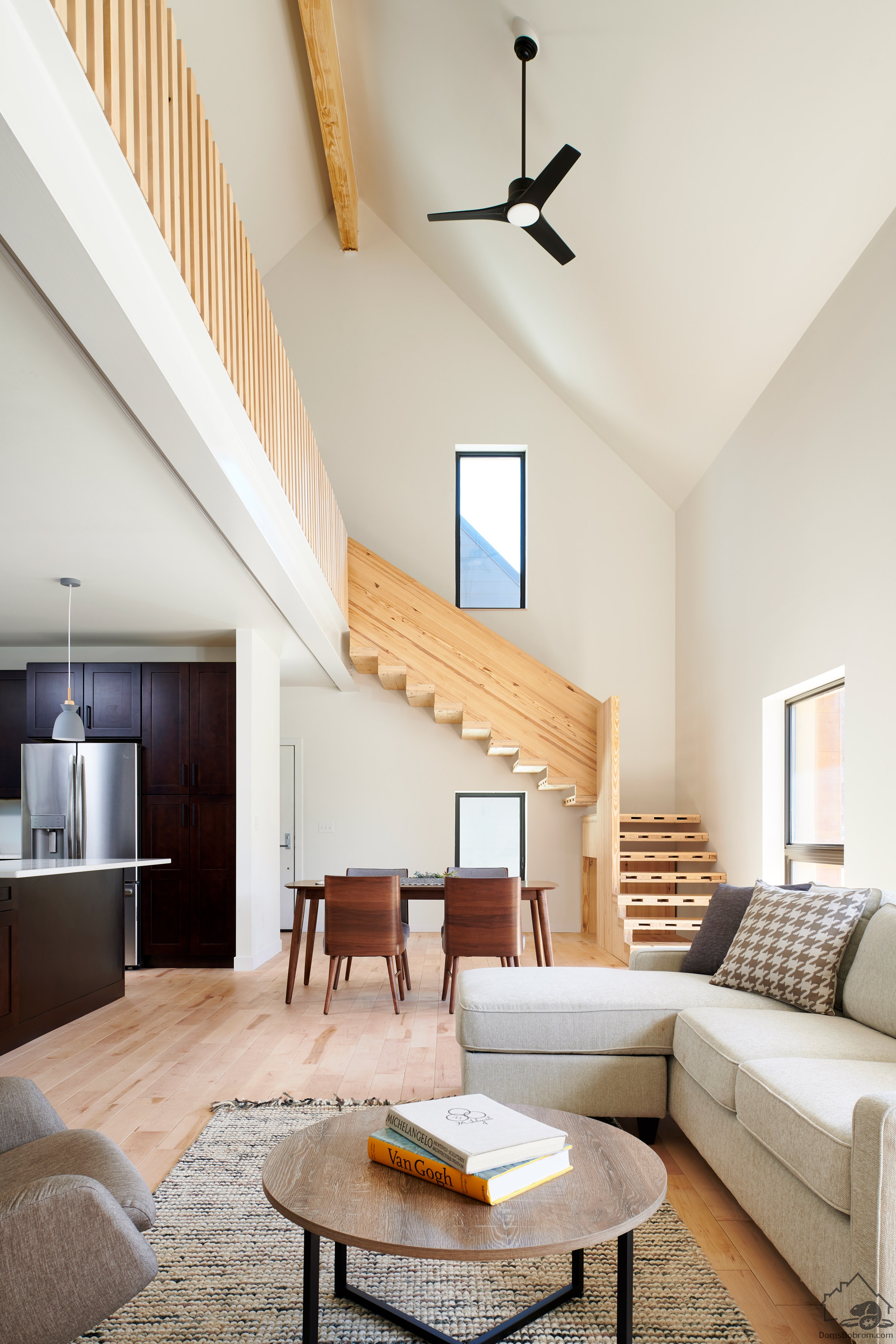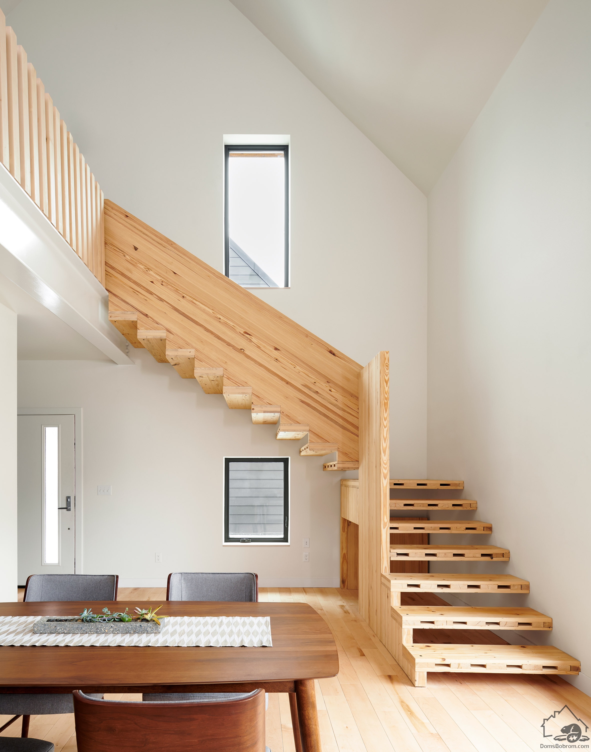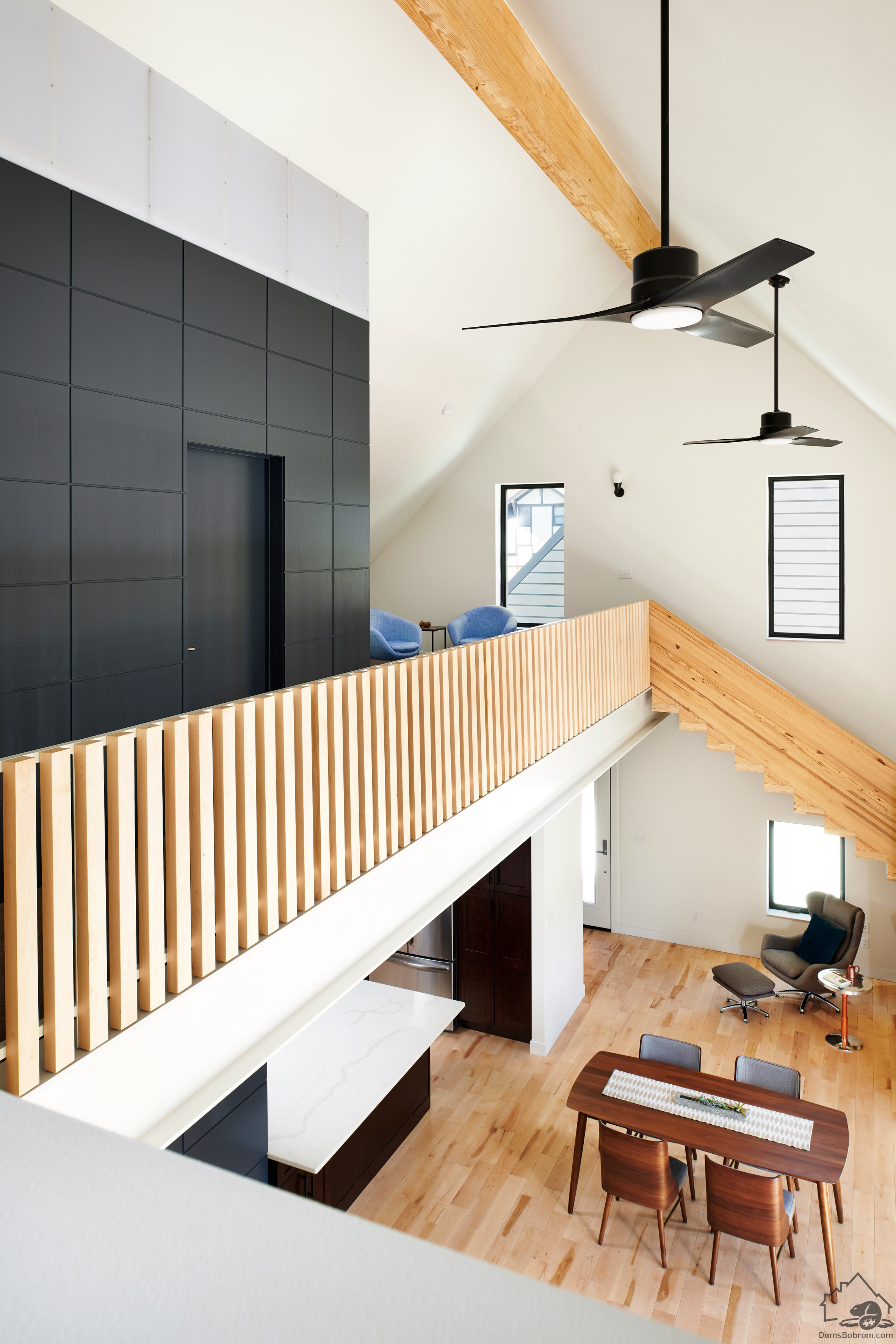 Внутри гостиная и обеденная зона имеют потолки двойной высоты, чтобы видеть верхний этаж с двумя спальнями и чердаком. Еще одна спальня находится на первом этаже. На обоих этажах есть черная акцентная группа из окрашенных панелей МДФ, которая скрывает спальню, ванные и технические помещения.