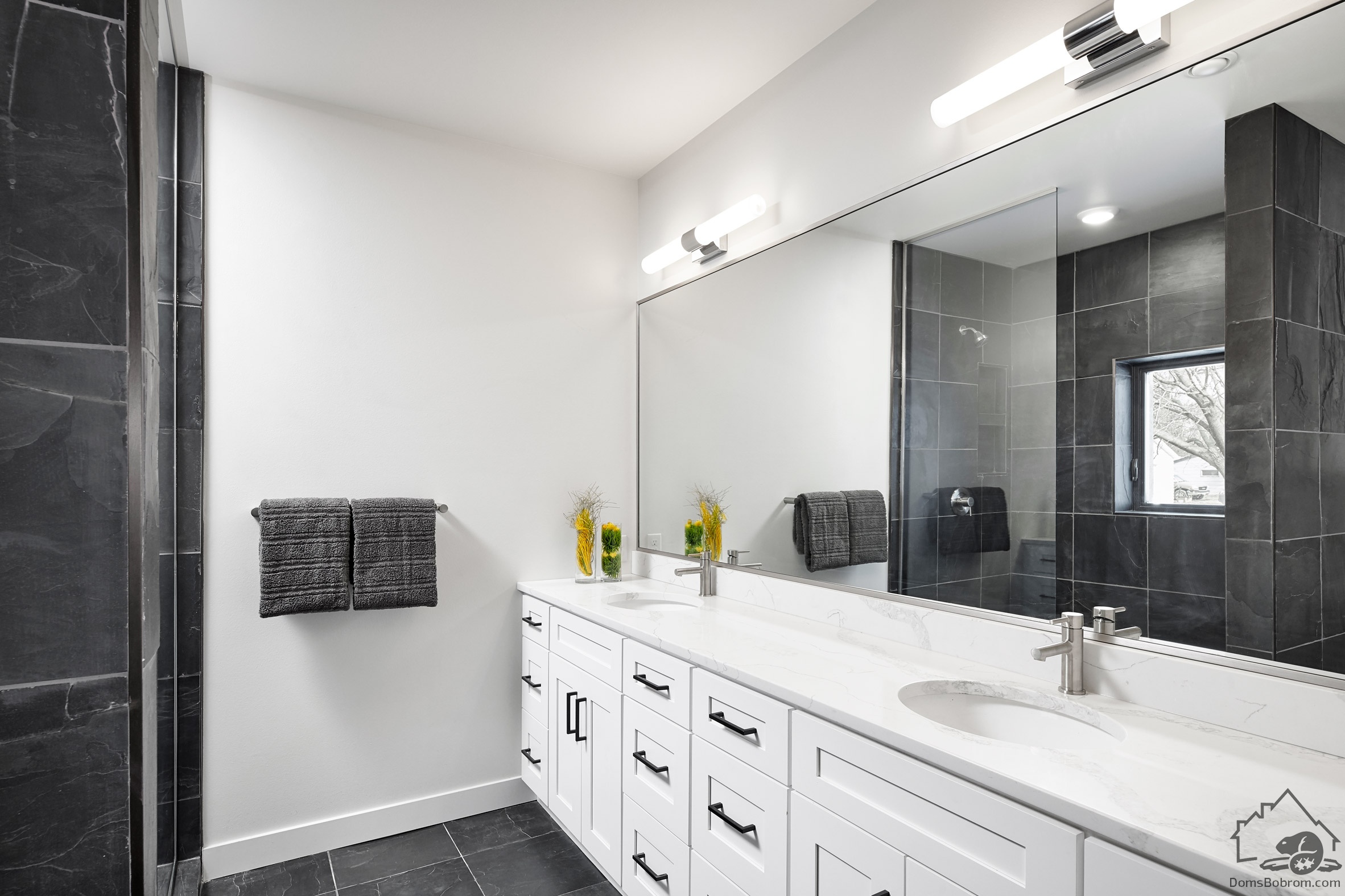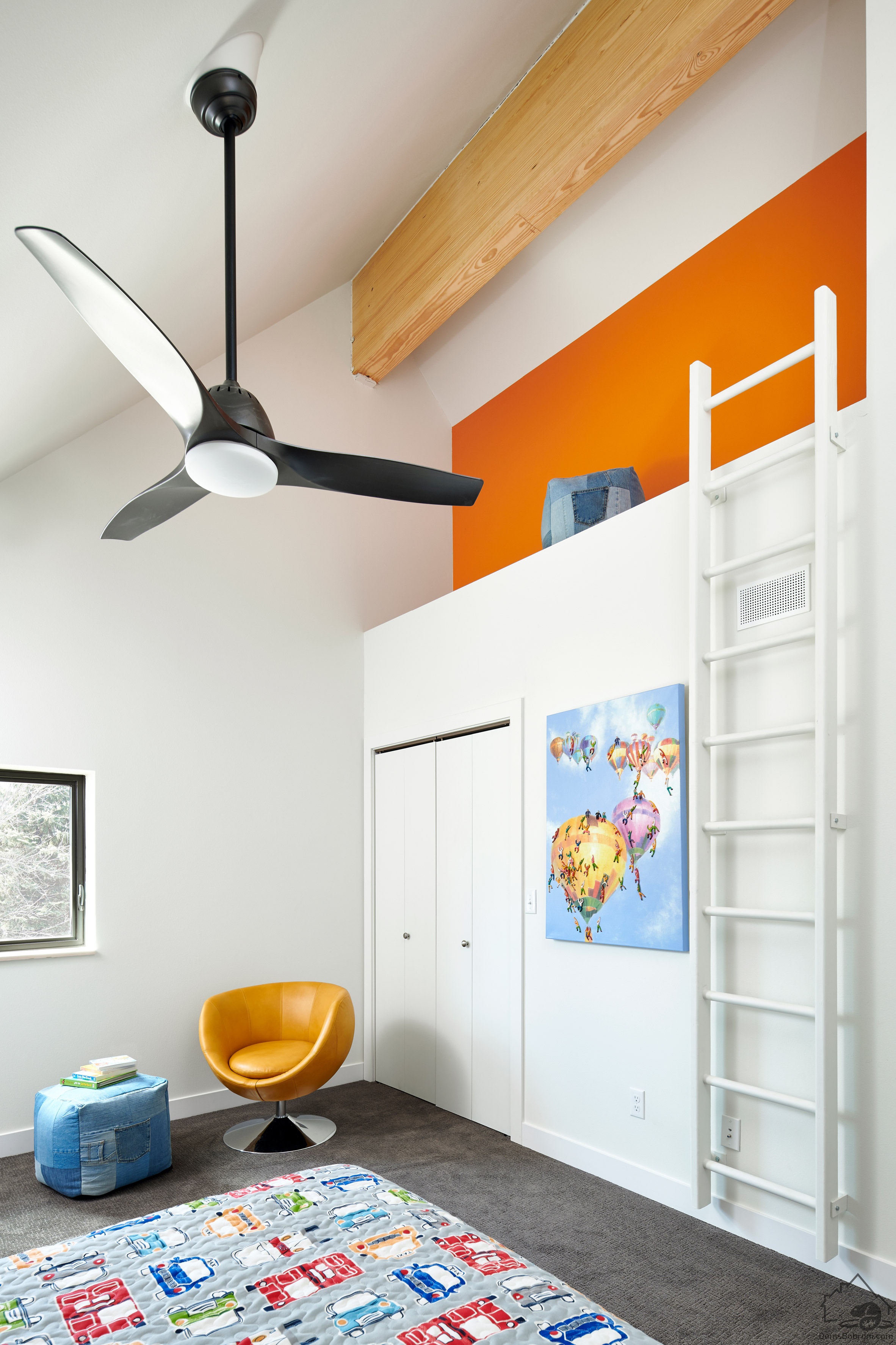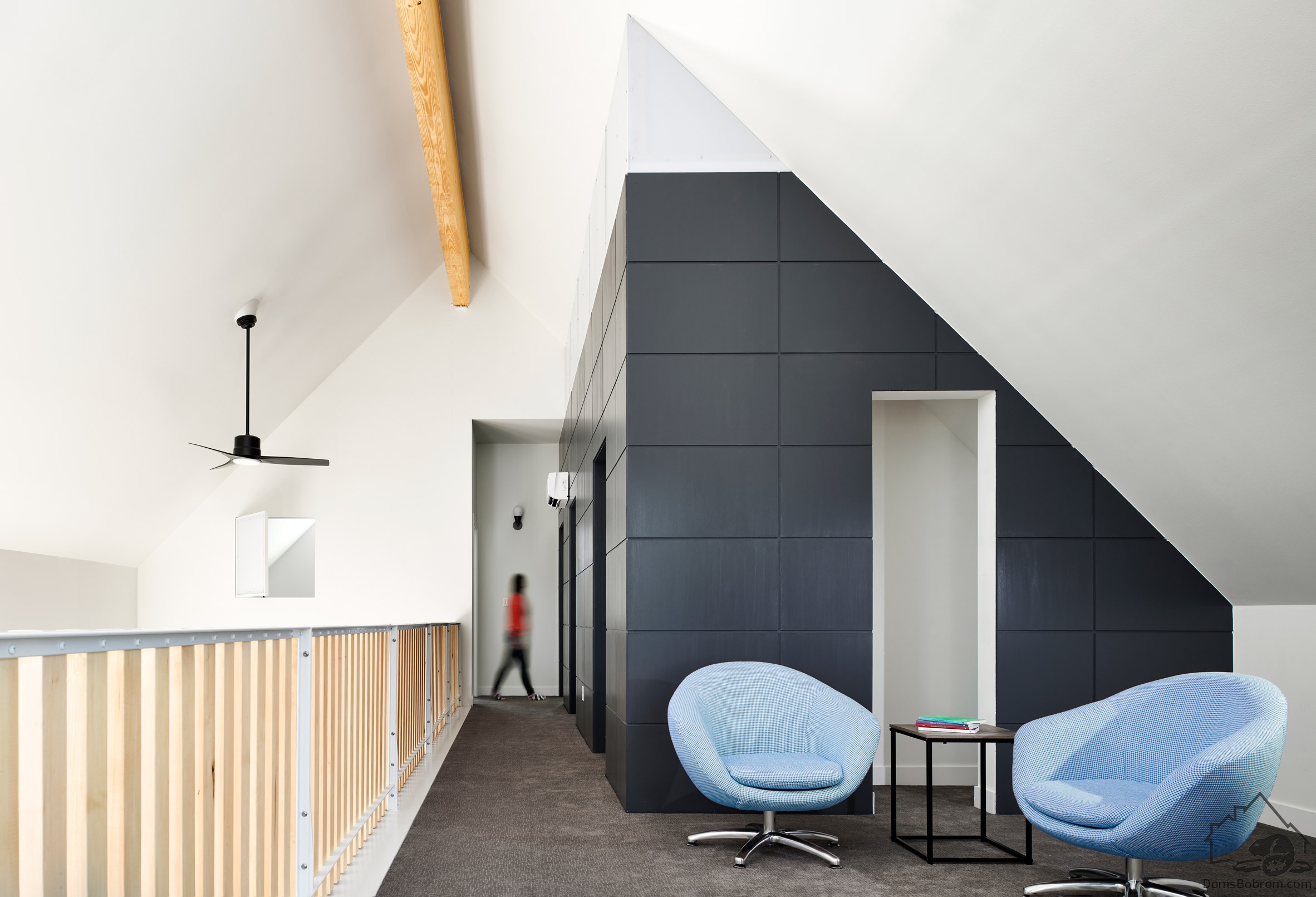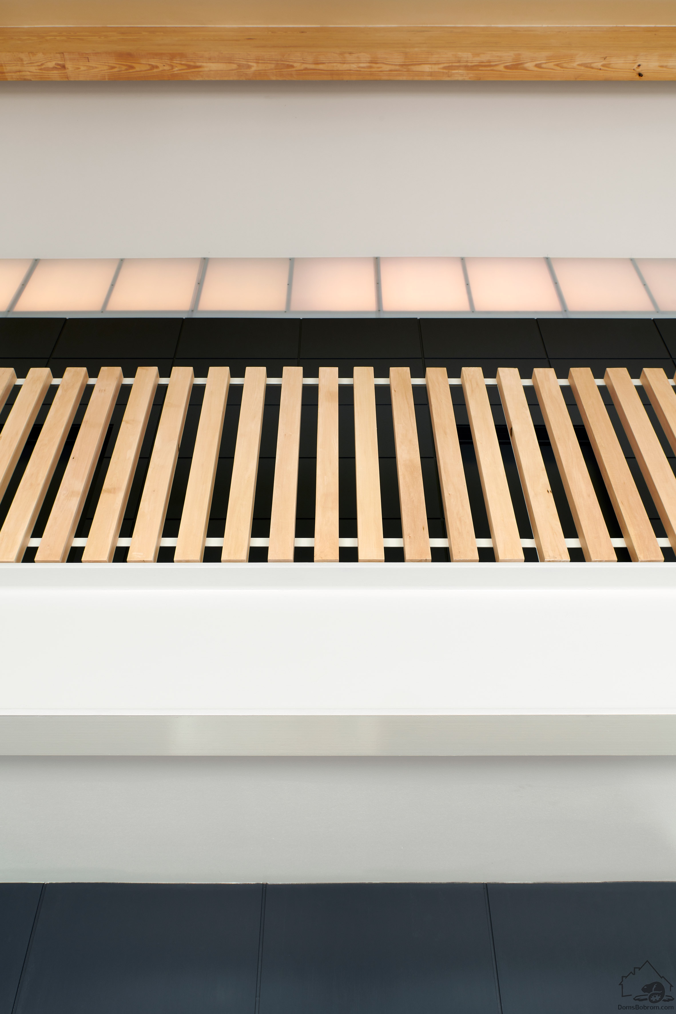 Внутри гостиная и обеденная зона имеют потолки двойной высоты, чтобы видеть верхний этаж с двумя спальнями и чердаком. Еще одна спальня находится на первом этаже. На обоих этажах есть черная акцентная группа из окрашенных панелей МДФ, которая скрывает спальню, ванные и технические помещения.