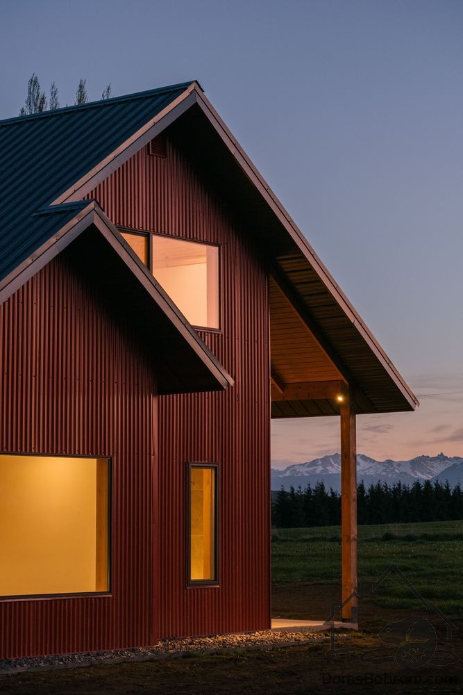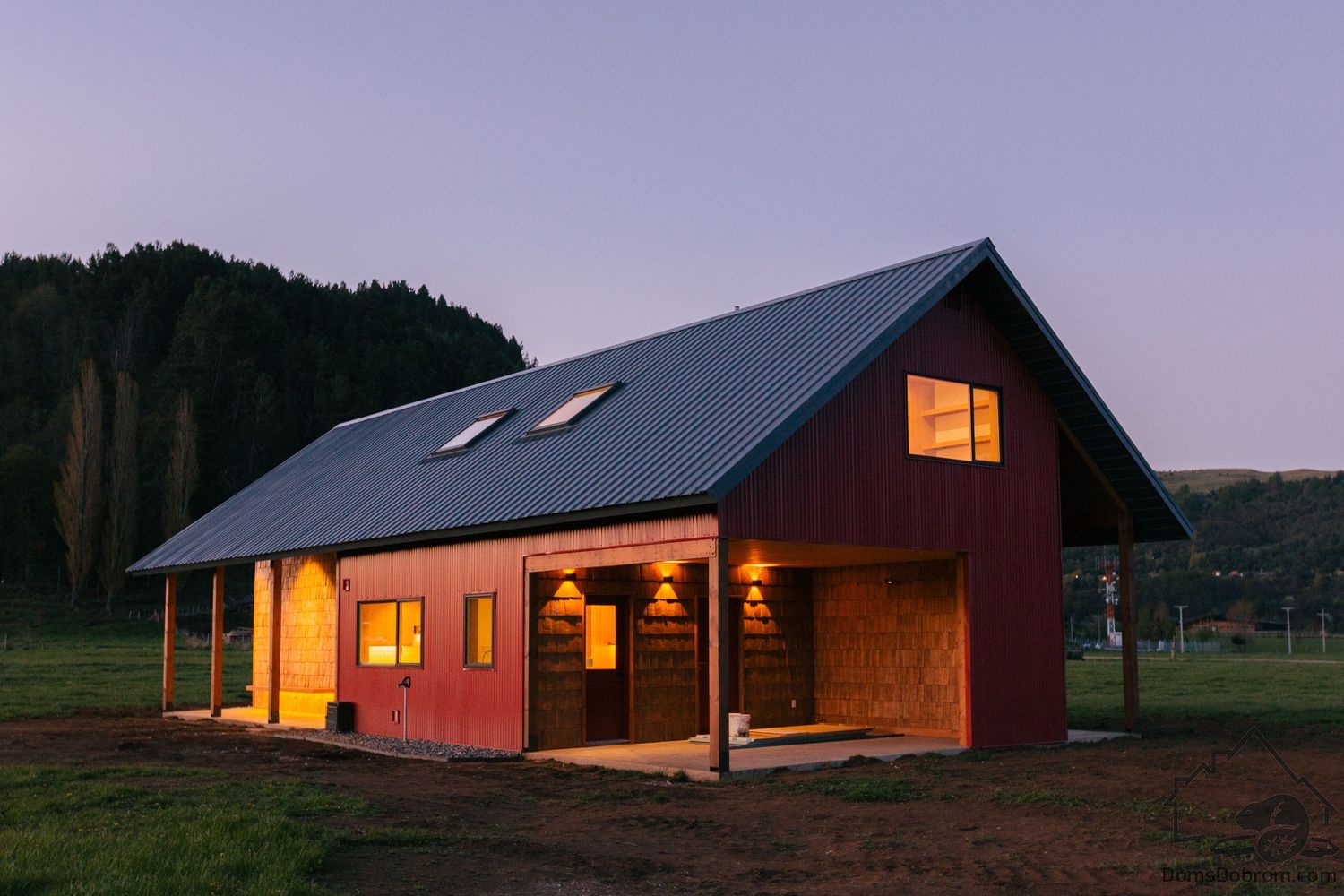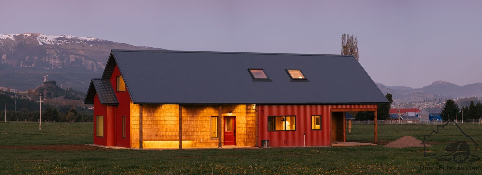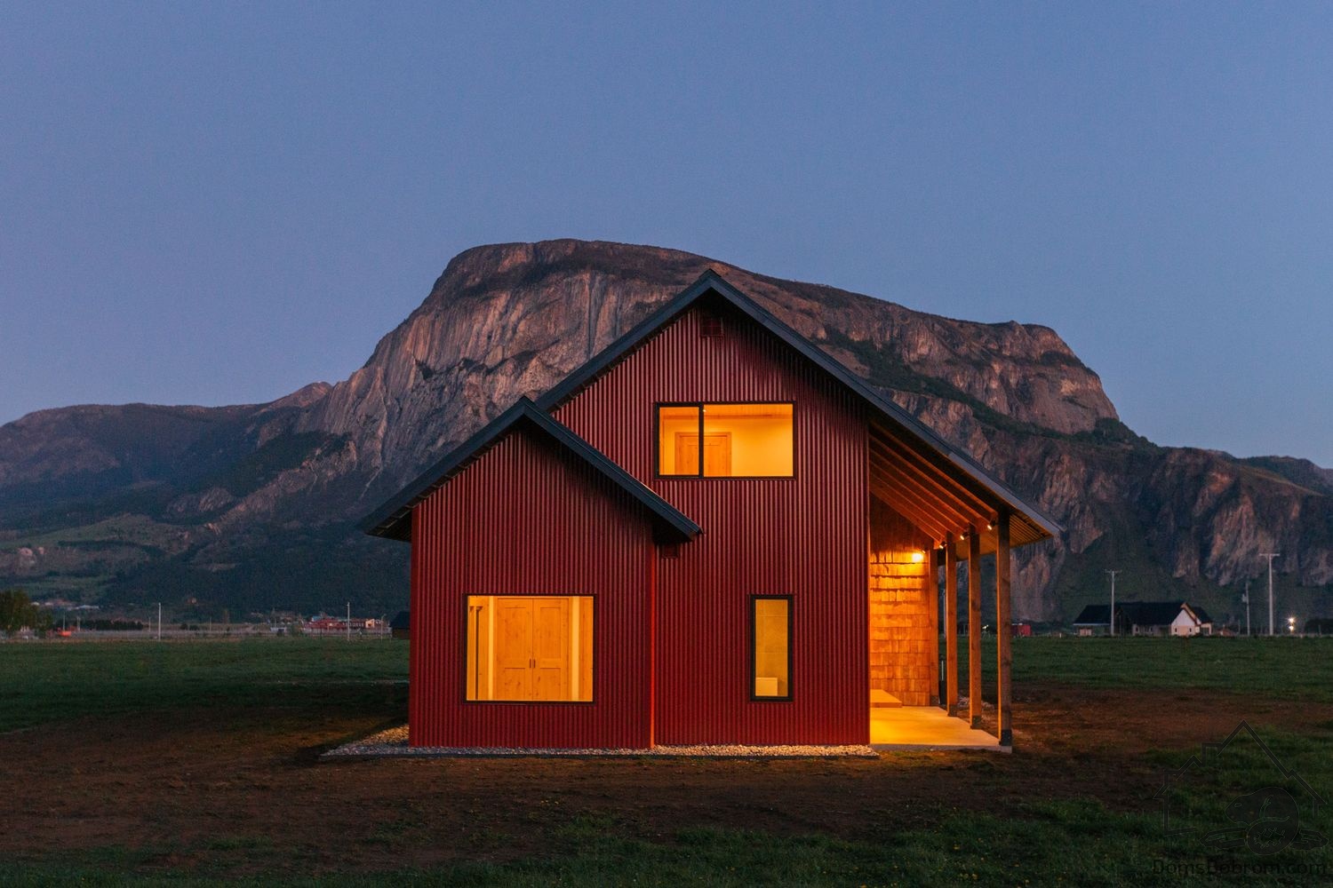 Красный силуэт барнхауса Chile создает впечатление тепла, когда освещается заходящим солнцем. Фасад отделан металлопрофилем и сайдингом щепа, которые долговечны и не требуют особого ухода. С одной стороны дома можно полюбоваться закатом, а с другой стороны, защищенной от ветра, удобно собираться компанией вокруг костра и барбекю. Внутри пространство спланировано так, что почти все помещения выходят в комнату с большими окнами.