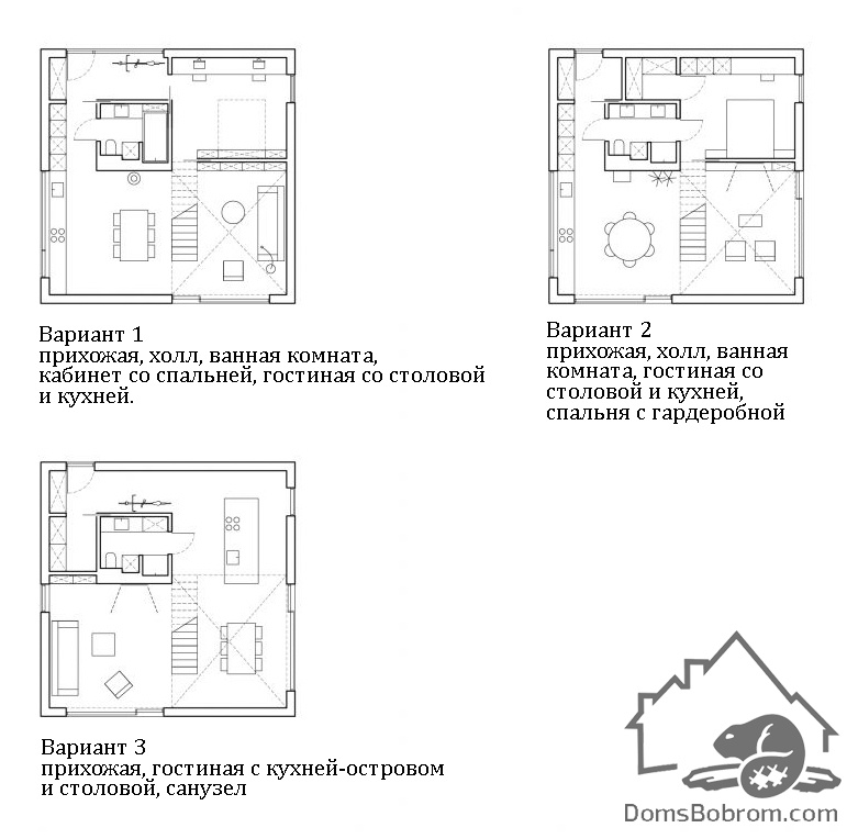Квадратный план с размерами 9х9 м позволяет разместить такой дом на любом участке земли и оптимально расположить его по отношению к сторонам света. Использование одного сантехнического стояка и освобождение интерьера от конструктивных элементов позволяет изменять планировку комнат в соответствии с индивидуальными потребностями.