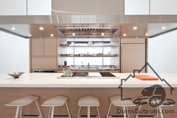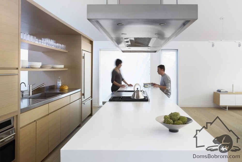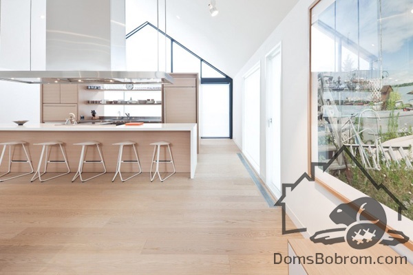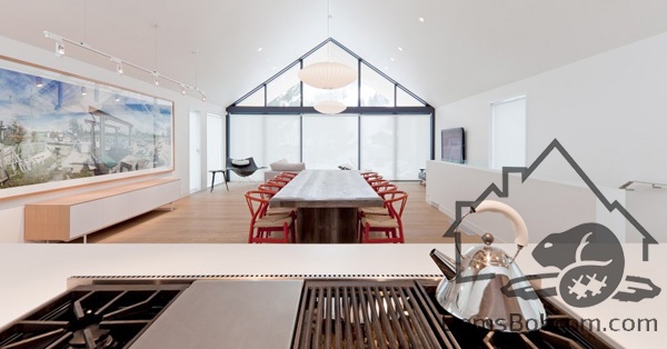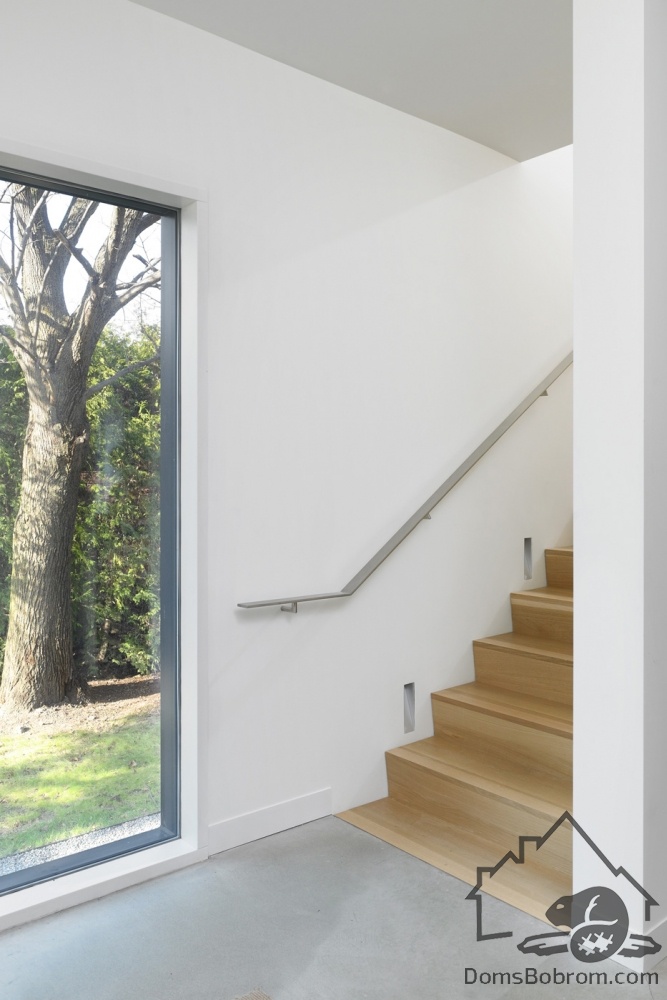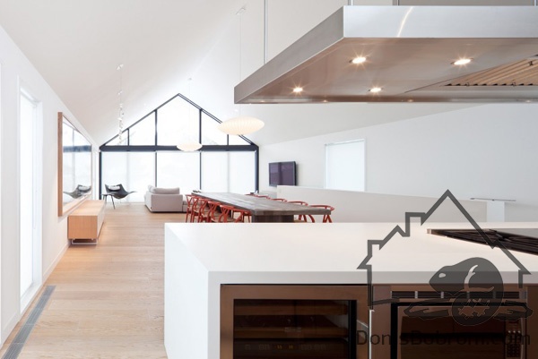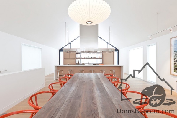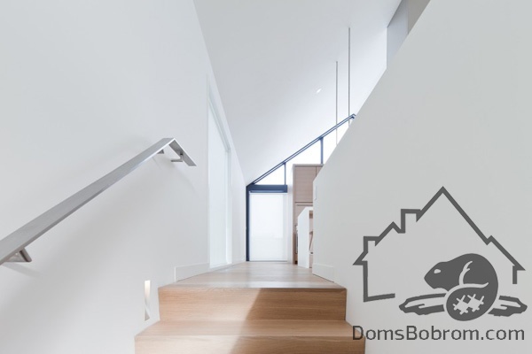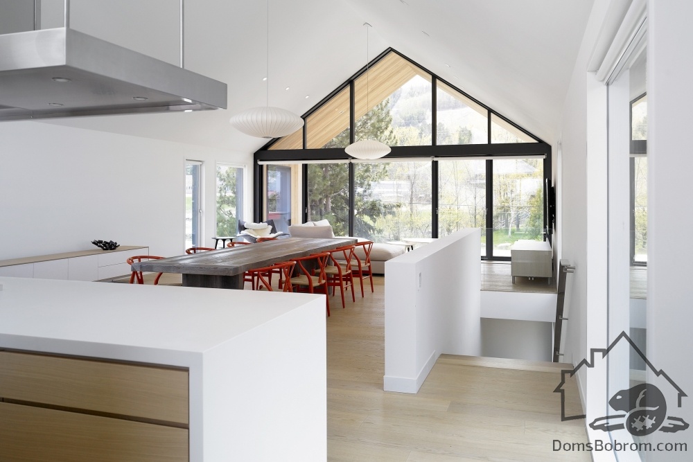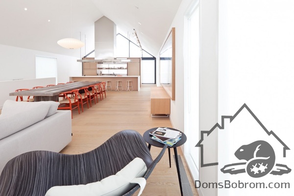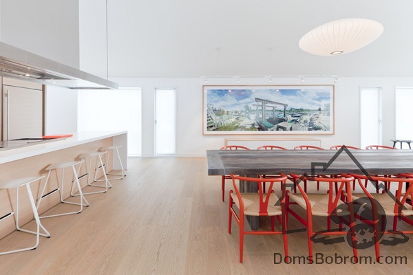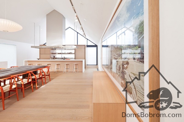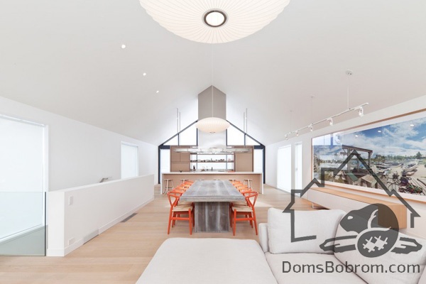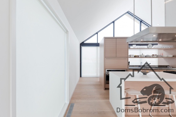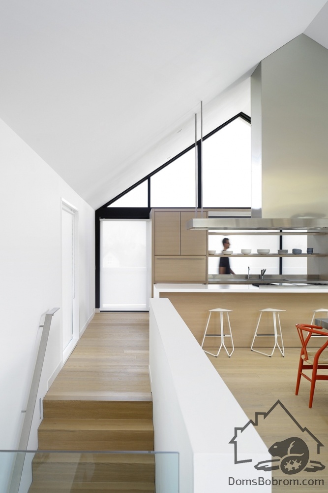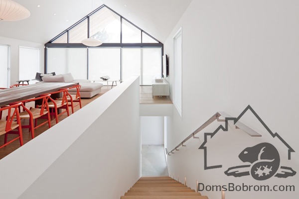 На первом этаже дома располагаются спальни, ванные комнаты и прачечная, а на верхнем этаже находятся кабинет, кухня, столовая, гостиная и внешние балконы. Все помещения наверху визуально соединены между собой. Верхний уровень застеклен с обоих сторон. Окна на боковых фасадах расположены для усиления поперечной вентиляции и естественного освещения. Кухня эргономичная и стильная. В интерьере преобладает белый цвет и дерево, которые наполняют дом особым уютом. Немного радостных ноток привносят яркие элементы, такие как картина или стулья. Массивный деревянный стол в столовой смотрится роскошно. Все комнаты в доме просторные и максимально открытые, в них так приятно спрятаться от суетливой жизни.