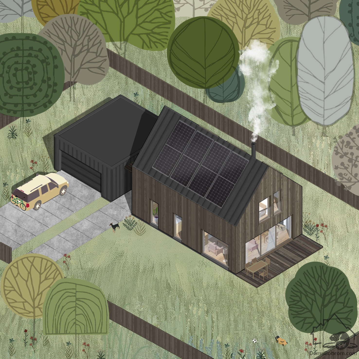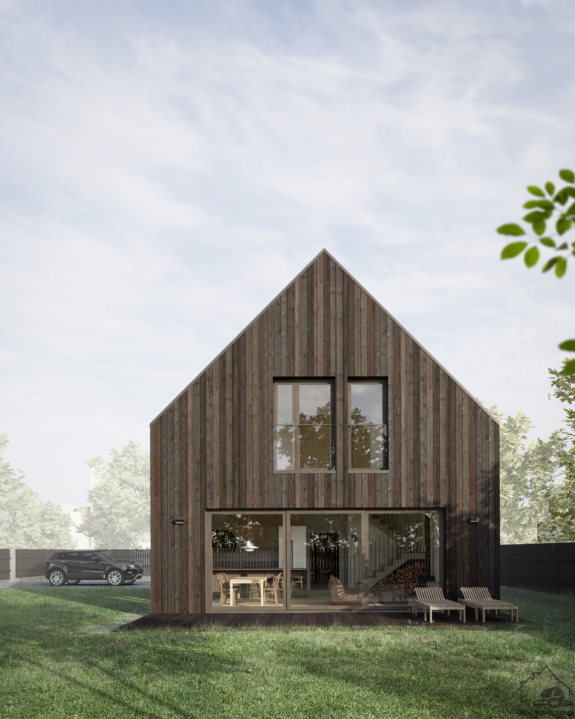 Дом Mala очень современный, но при этом теплый и уютный, благодаря большому количеству дерева внутри и снаружи. По форме напоминает сарай. Отдельно стоящий гараж снижает стоимость строительства дома и снижает потери энергии. Комфорт при перемещении между домом и гаражом обеспечивает навес.