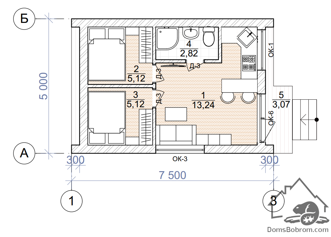 Размер дома 7,5 м х 5м