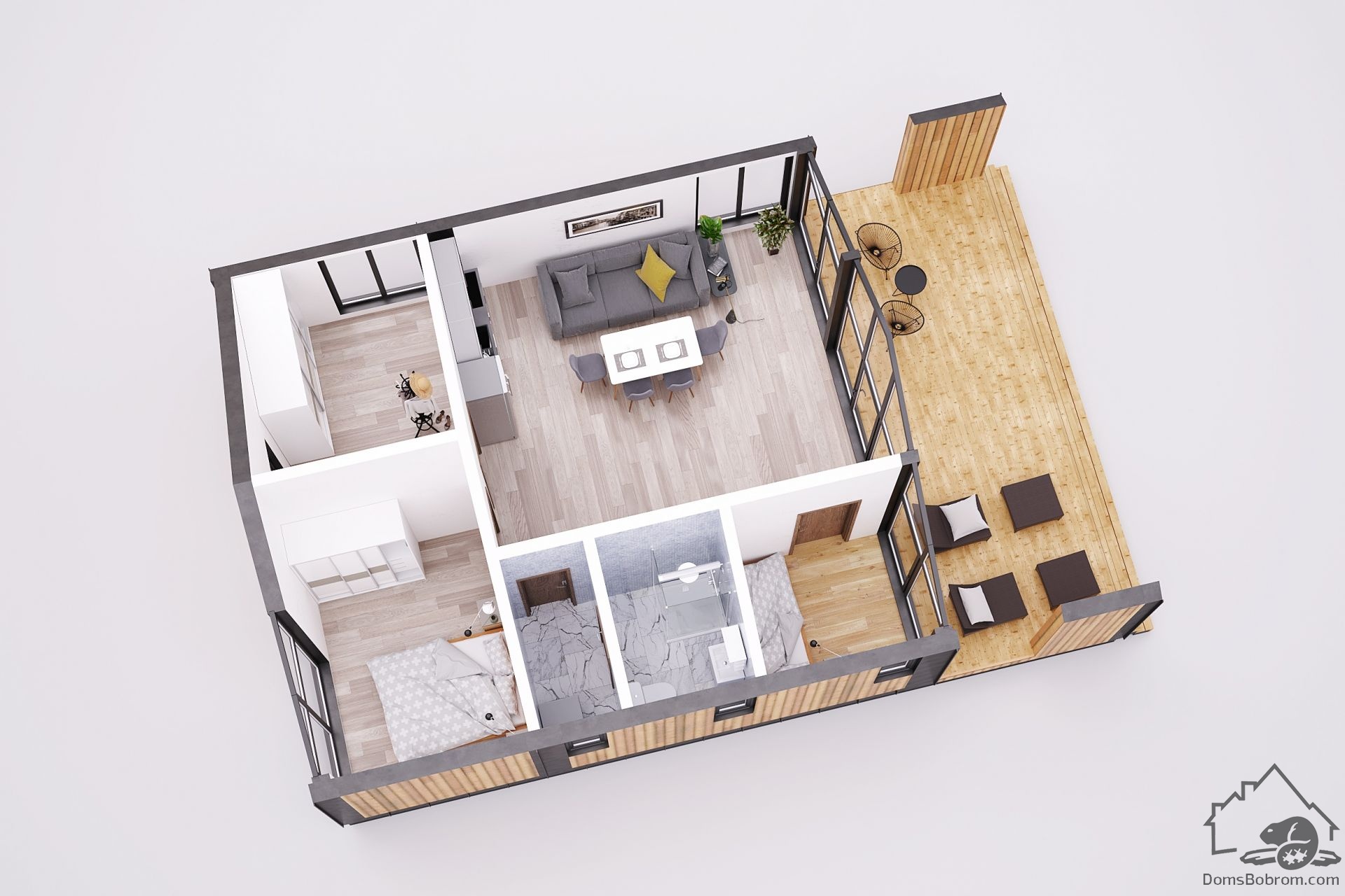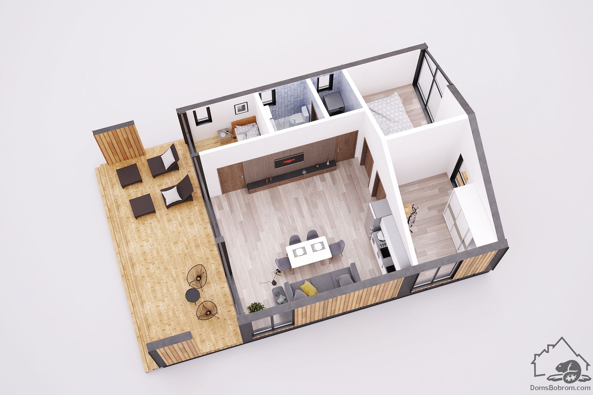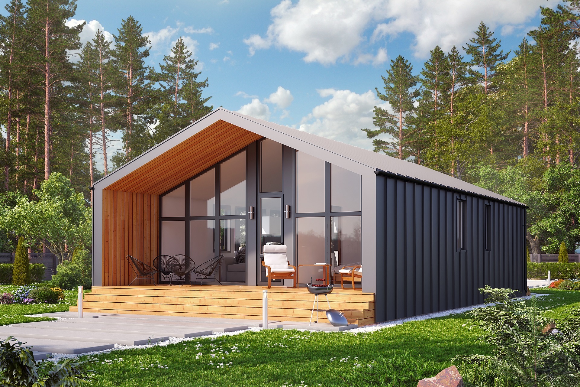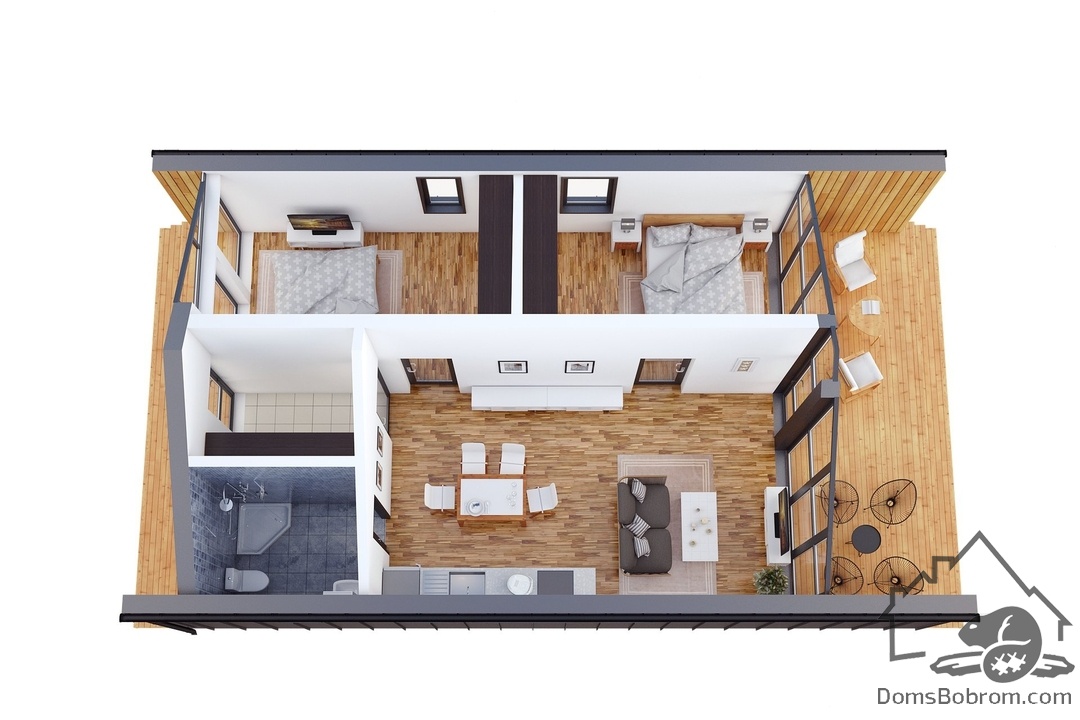 Барнхаус Modern - это эргономичный, быстровозводимый дом для небольшой, современной семьи. Панорамные окна фасада и просторная терраса позволят наслаждаться светом и пейзажами вокруг дома. Отсутствие несущих стен внутри дома дает полный простор для планировки пространства.