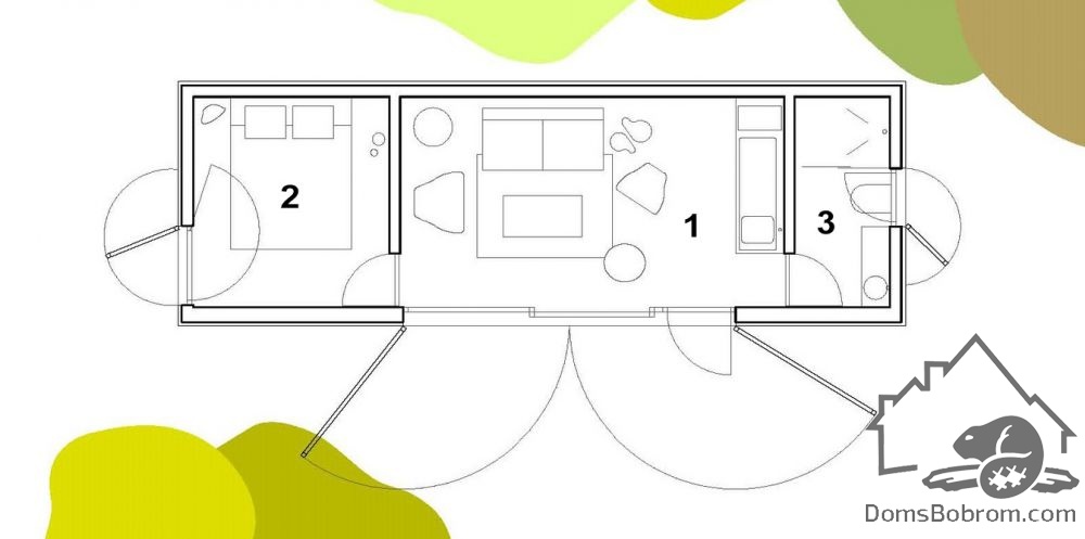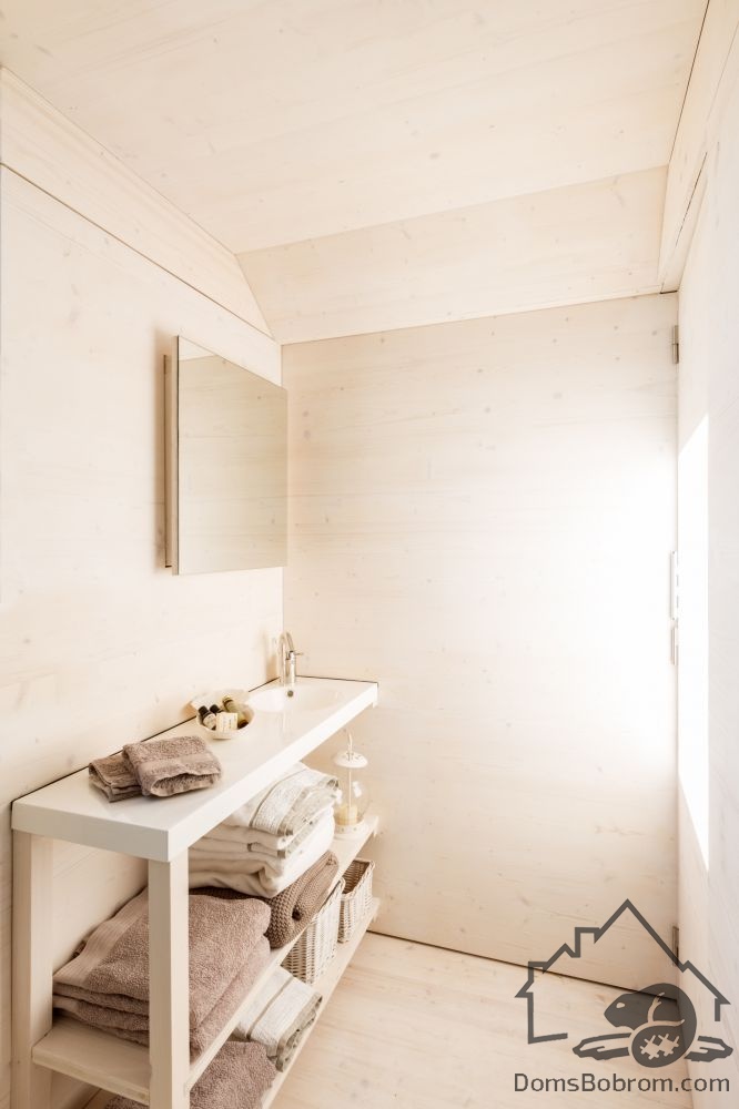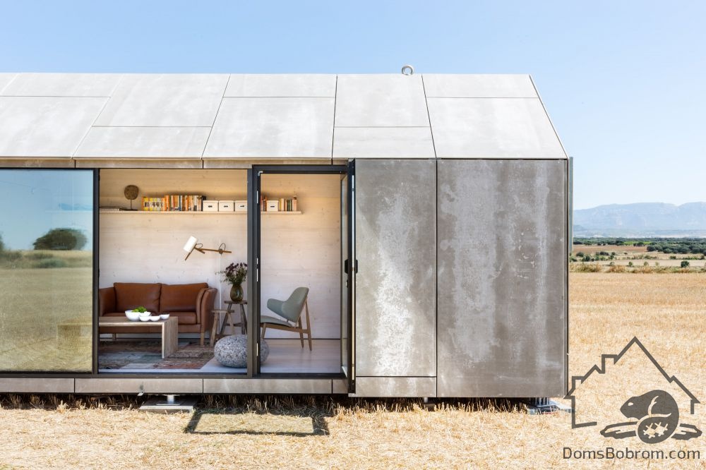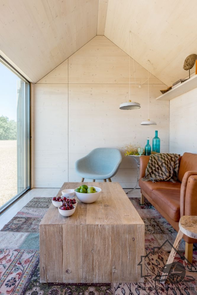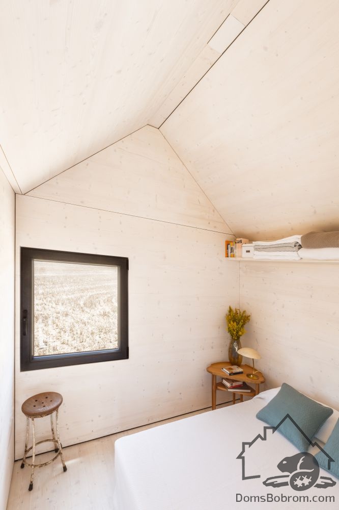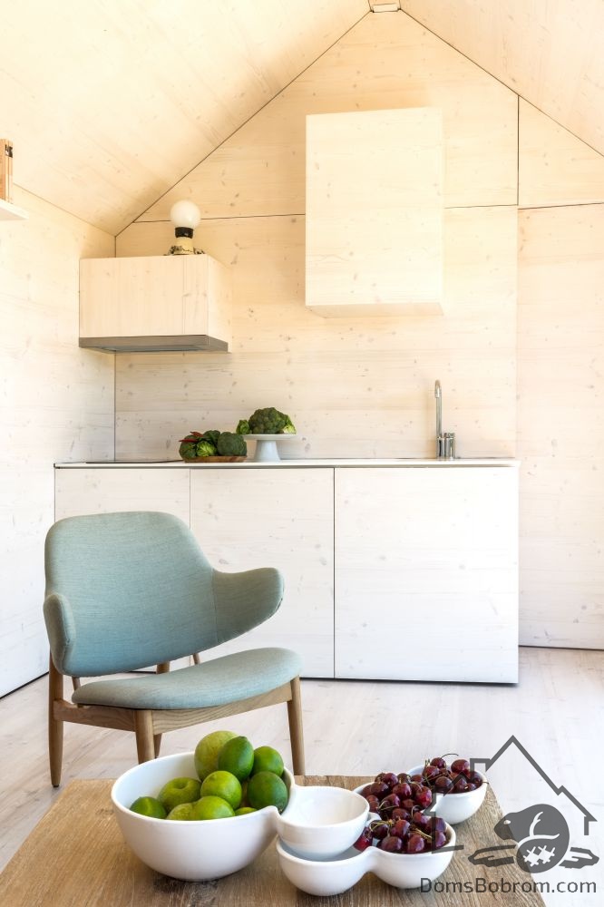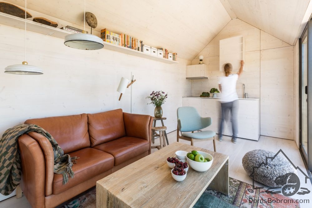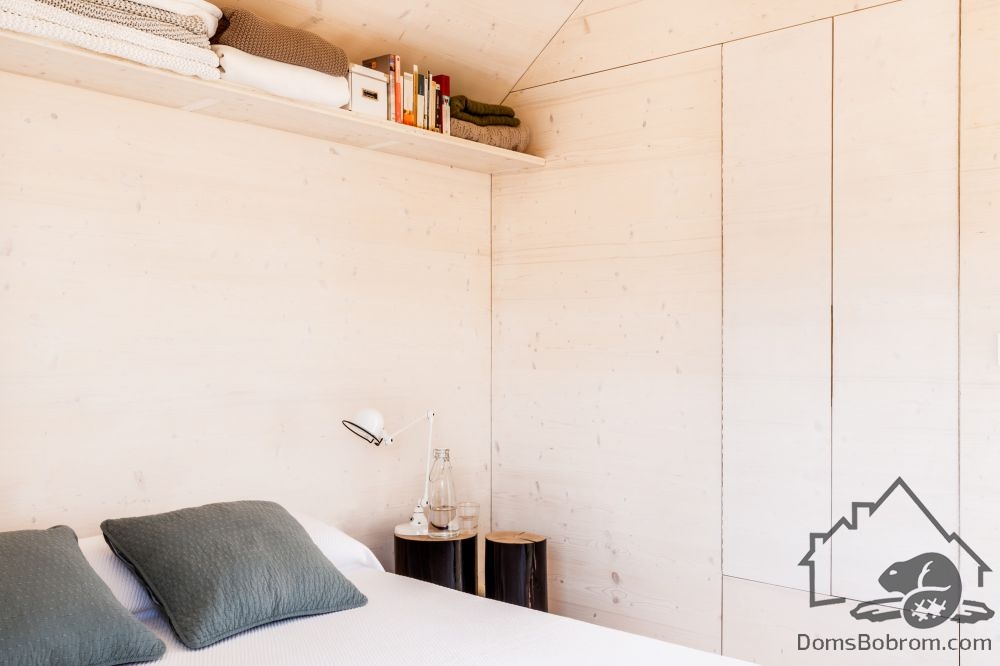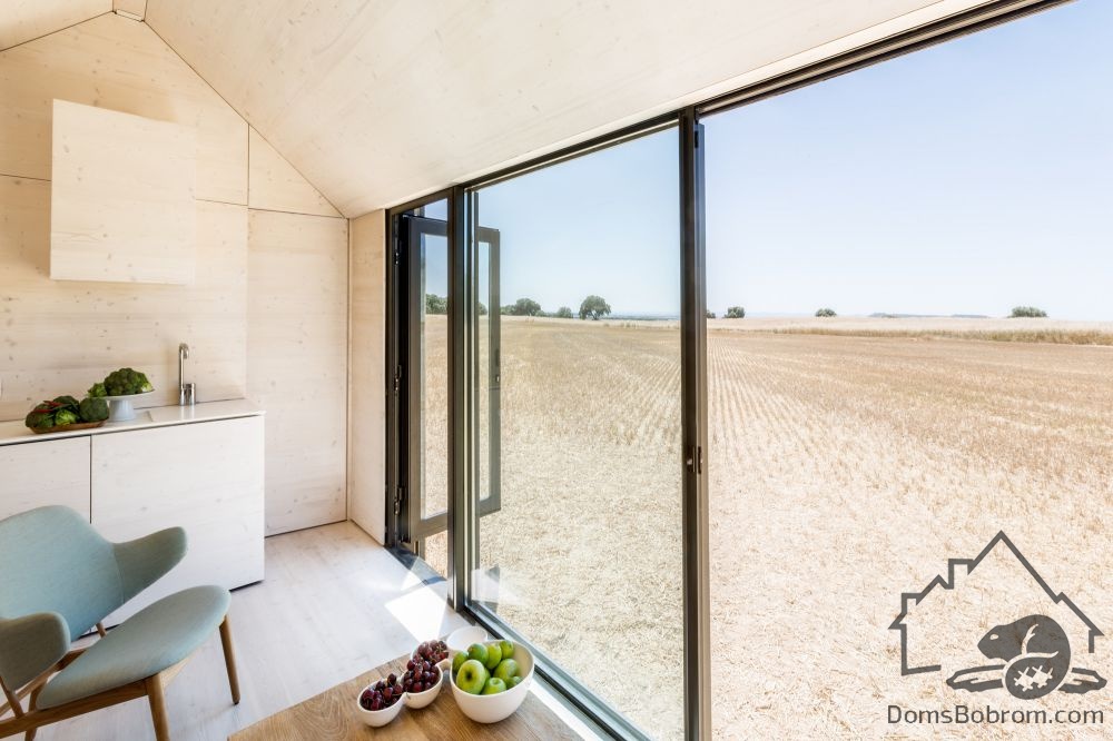 Размеры и пропорции постройки тщательно продумывались. Все устроено предельно функционально: здесь имеются изолированные зоны — кухня-гостиная, ванная комната и спальня.