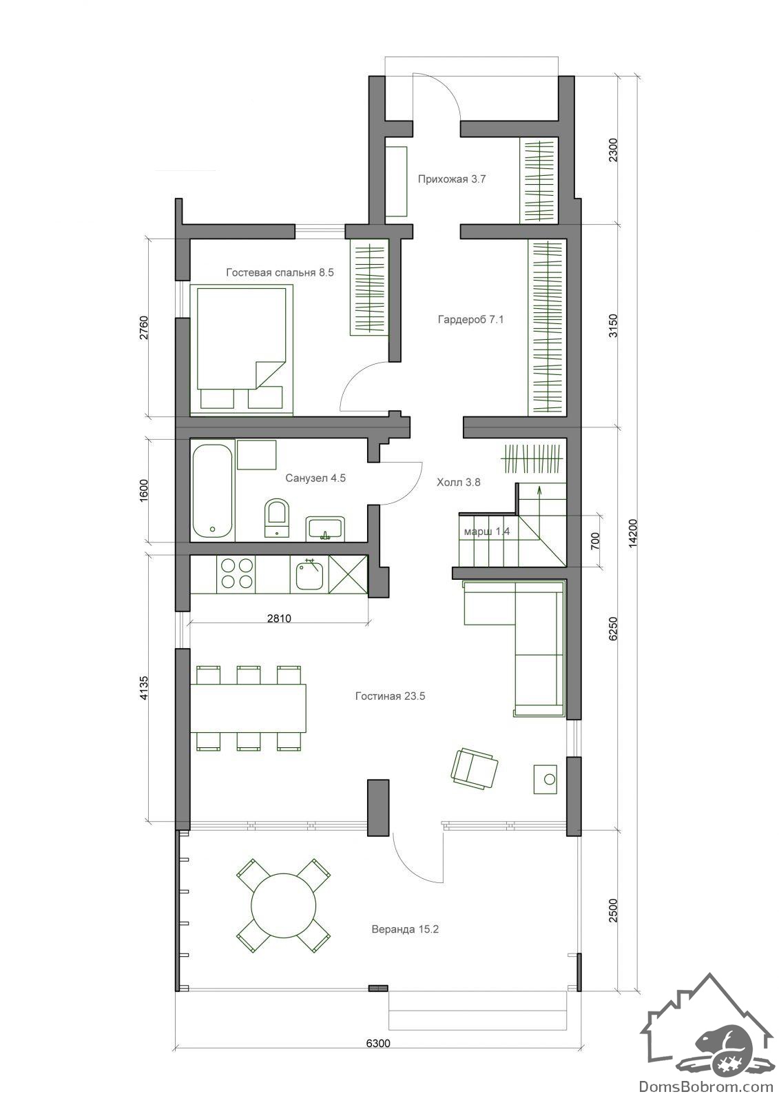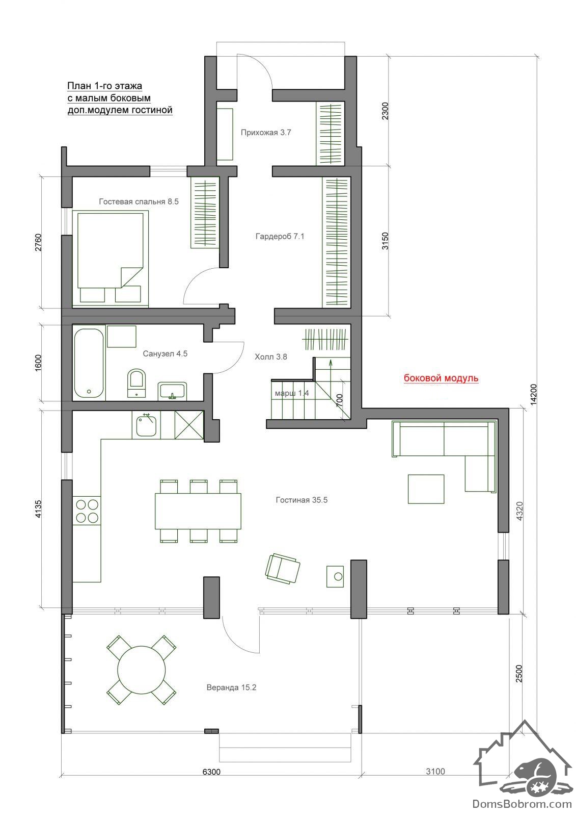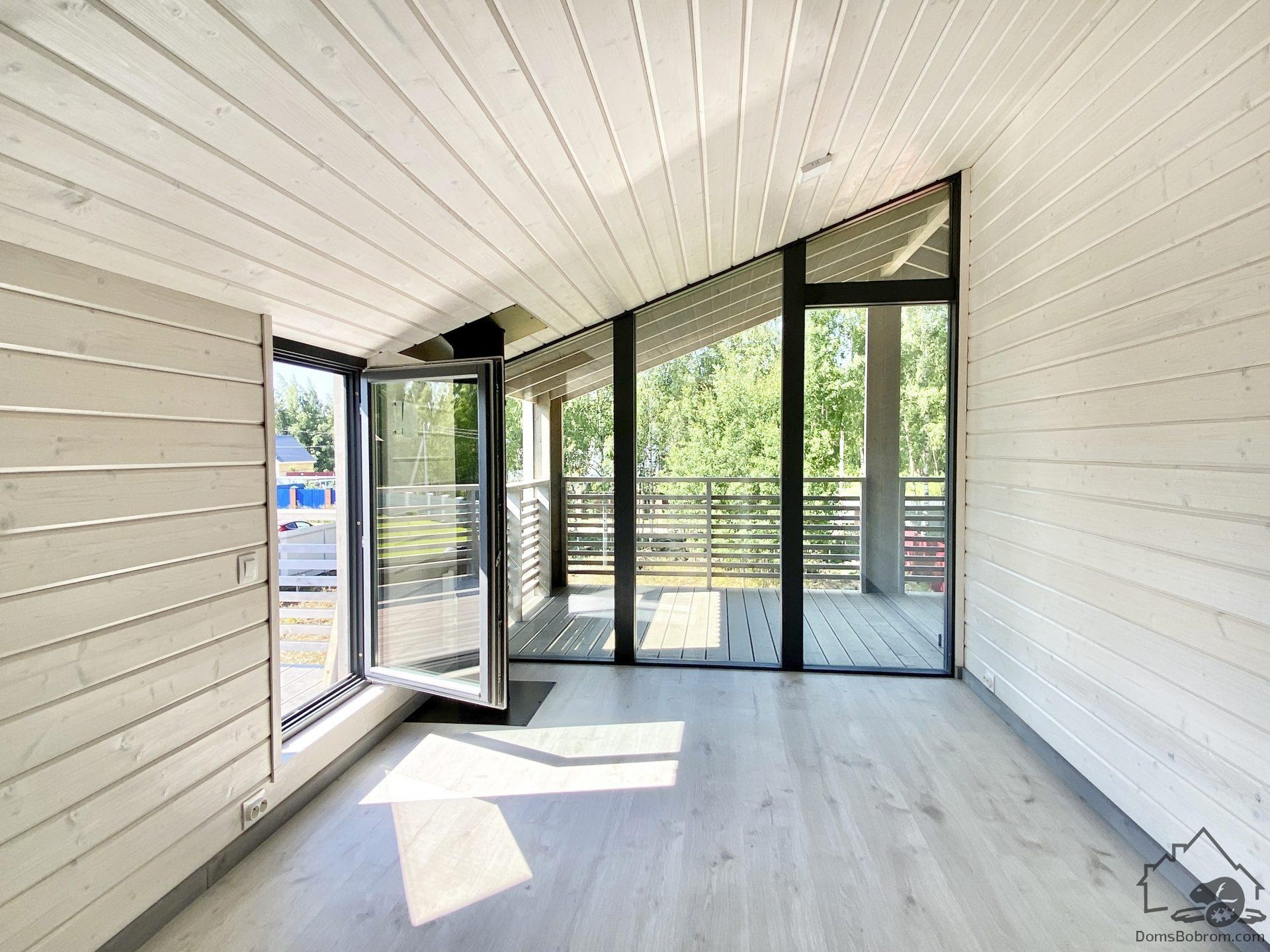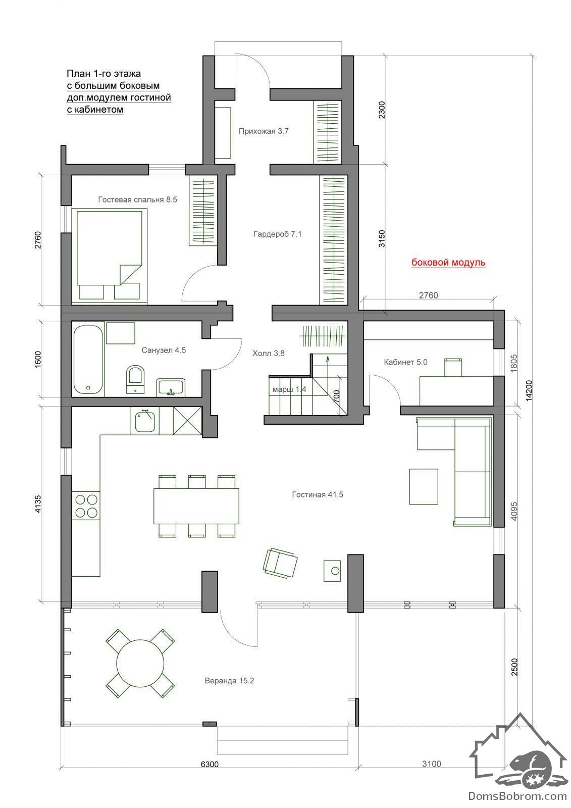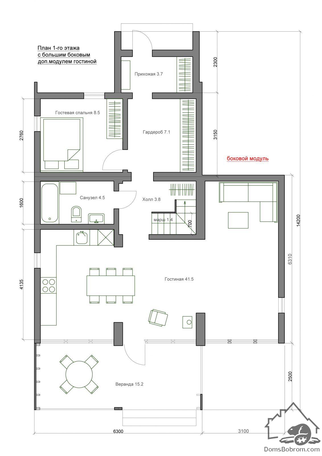 Возможно изменение площади и планировки под необходимые параметры, например габариты дома (ВхШхД): 6.2 × 6.3 × 14.2, жилая площадь: от 103 м2, общая площадь (включая террасу): от 133 м2.