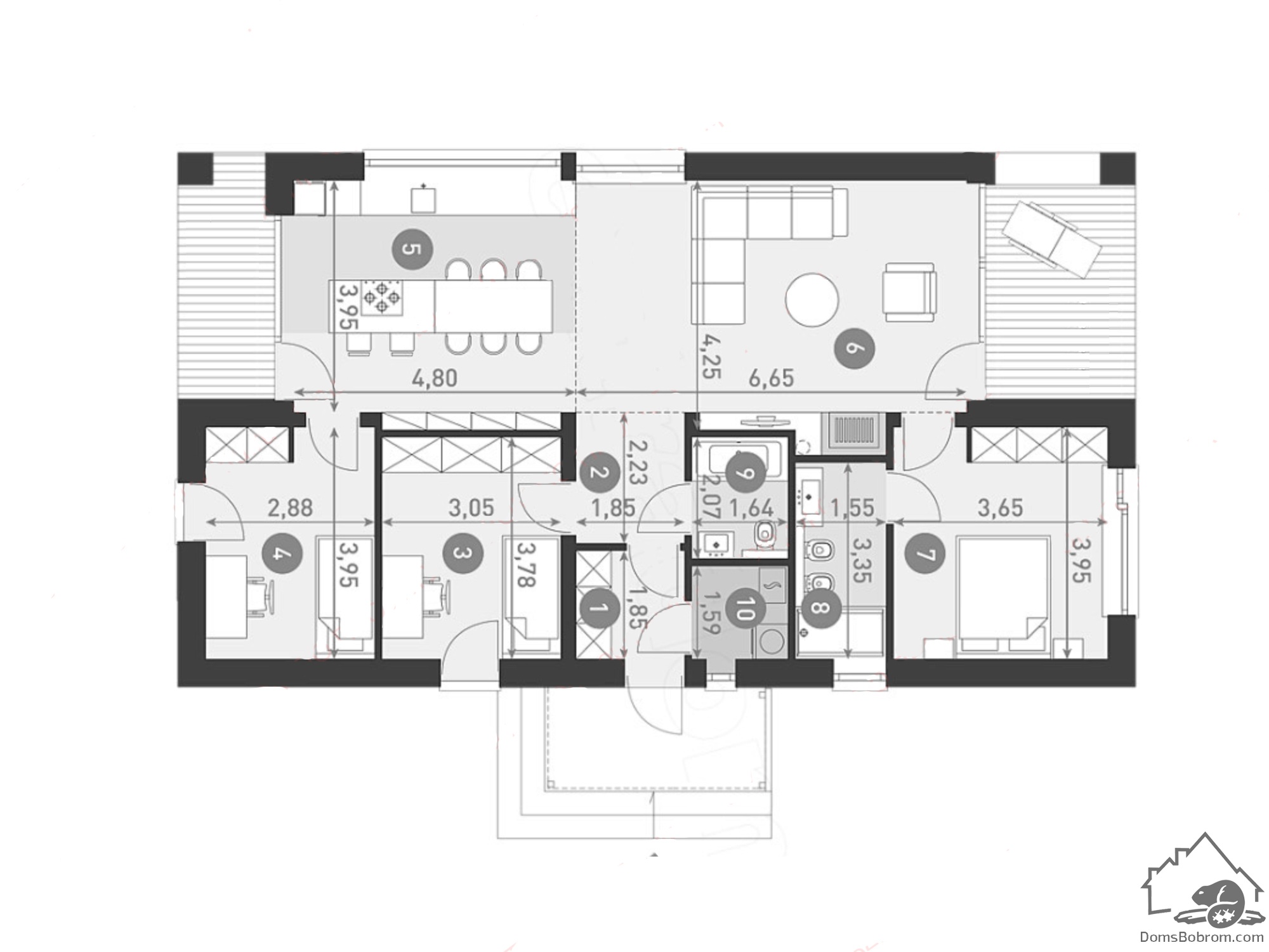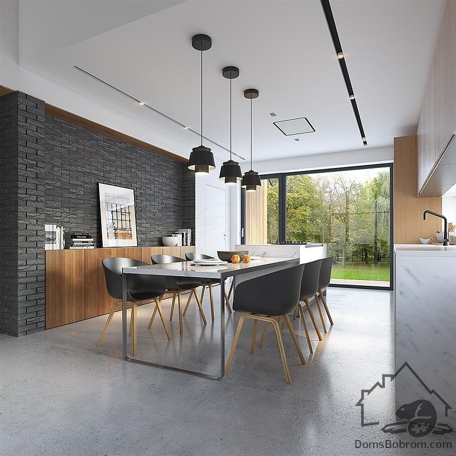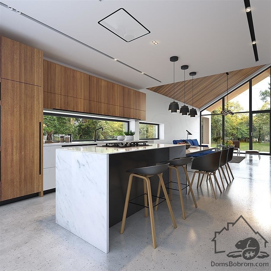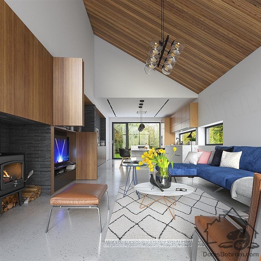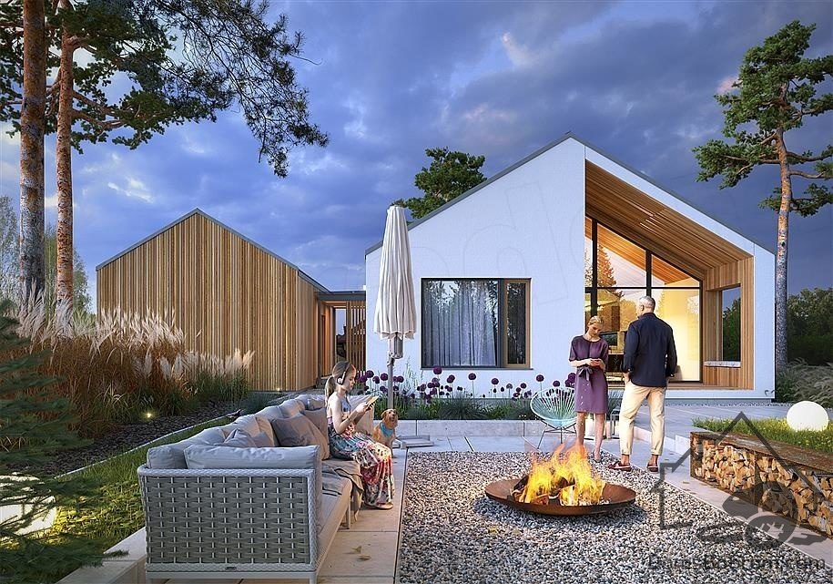 Барнхаус Tuuna - это небольшой современный одноэтажный дом для семьи из 3-4 человек. Дневная зона состоит из холла с высоким потолком и кухни, примыкающей к столовой. Благодаря большим окнам и открытому потолку в гостиной, интерьер намного просторнее.