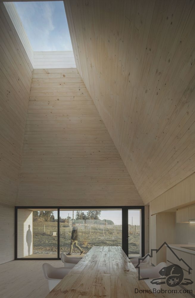 Из общественной зоны можно увидеть геометрию крыши, которая создает более высокую комнату, усиливая идею помещения для встреч. Конструкция потолка увенчана световым люком, который обеспечивает естественный свет и вид на небо.