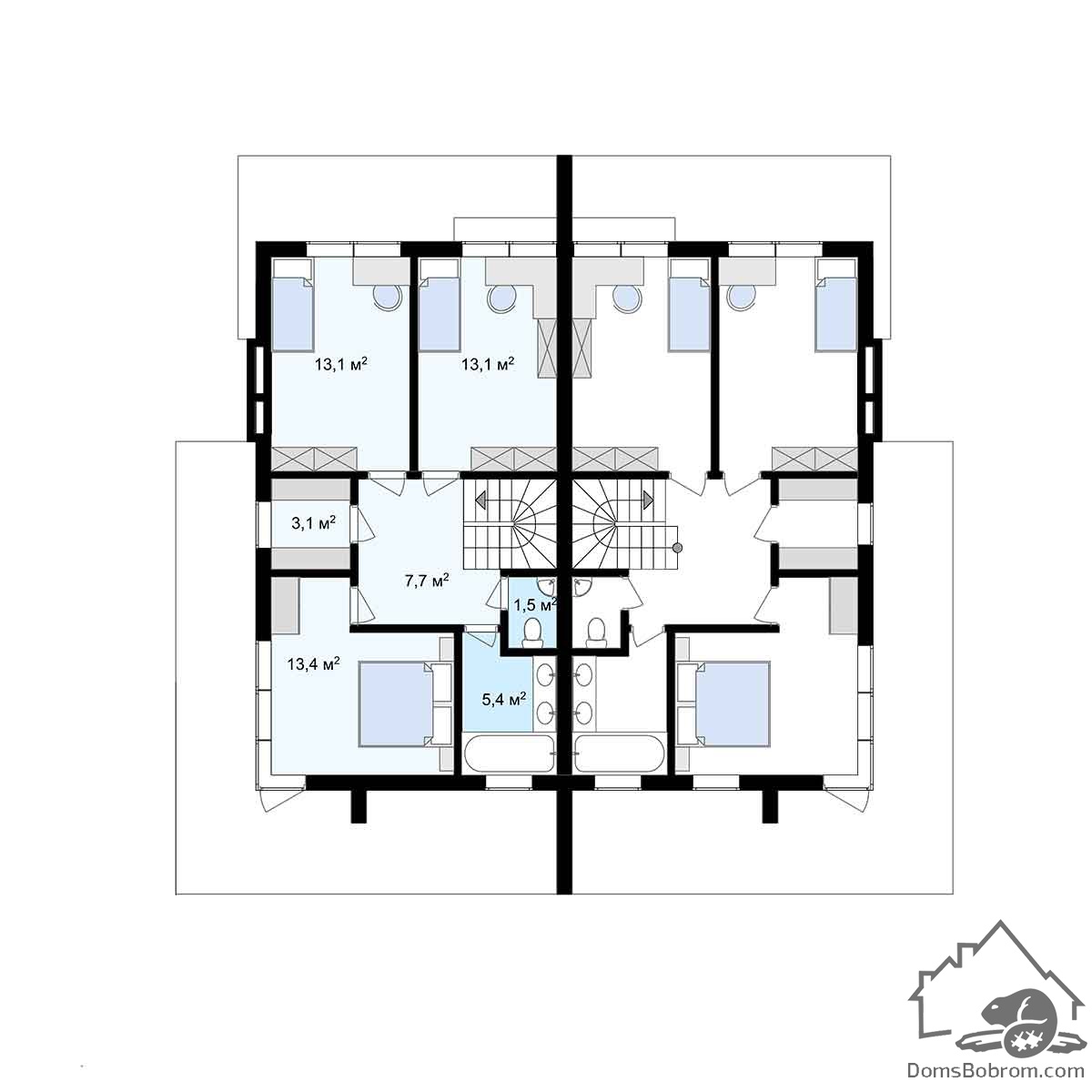В двухуровневом доме REdup-3 в каждой половине есть по 3 спальни. Все они расположены на втором этаже. На первом этаже находятся общие помещения: гостиная, кухня-столовая.