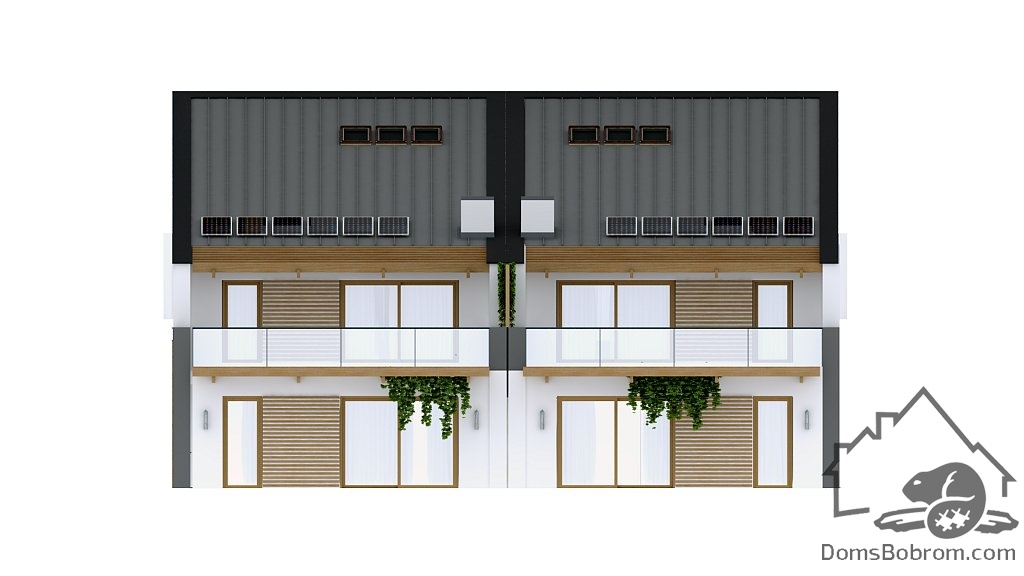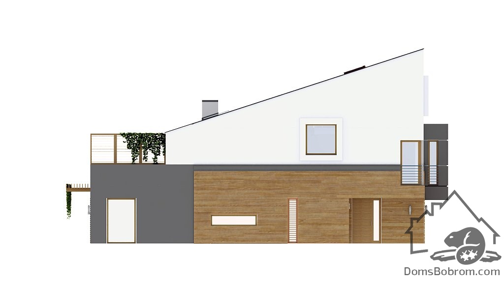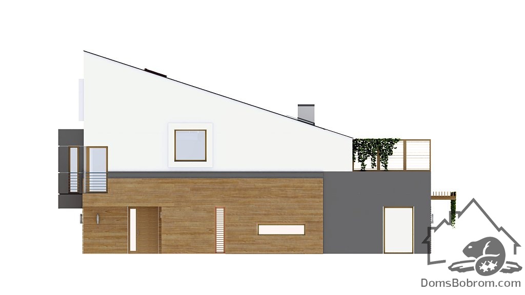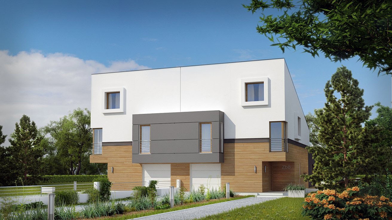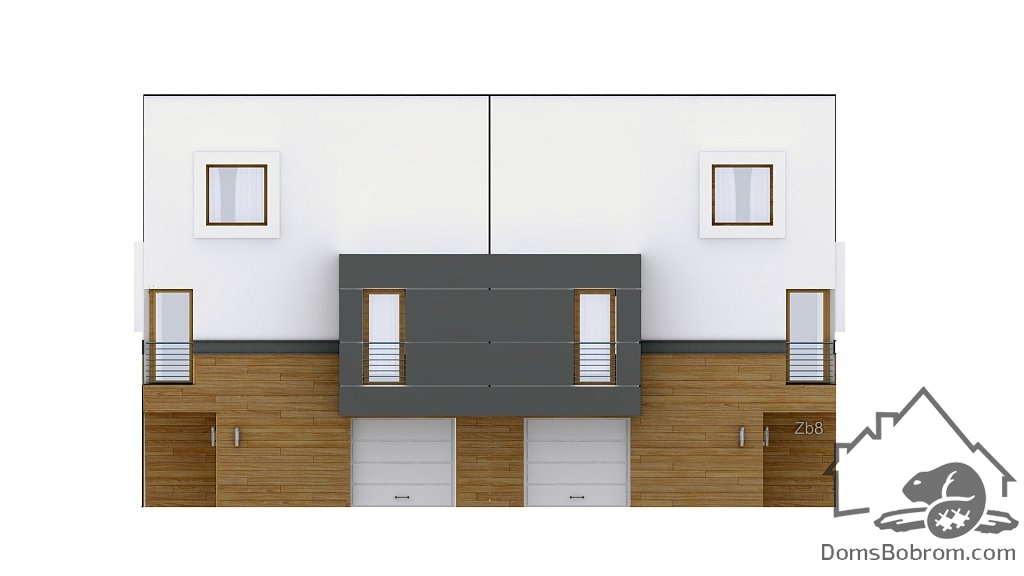 Дом дуплекс Zb8 имеет простые геометрические формы. На фасаде не присутствуют элементы классической архитектуры, весь декор заключается в сочетании текстур отделочных материалов. Скромный фасад этого дома скрывает всю красоту дизайнерского решения, зато тыльная сторона дома, где расположена зона отдыха, поражает своей красотой. Оформление стеклом просторного балкона, больше похожего на террасу, придает легкость конструкции дома, а небольшая пергола, оформленная вьющимися растениями как кружевом, украшает дом. Элегантная односкатная крыша с мансардными окнами позволяет свету проникать в комнаты на втором этаже
