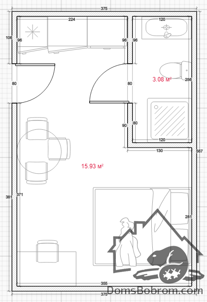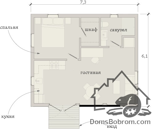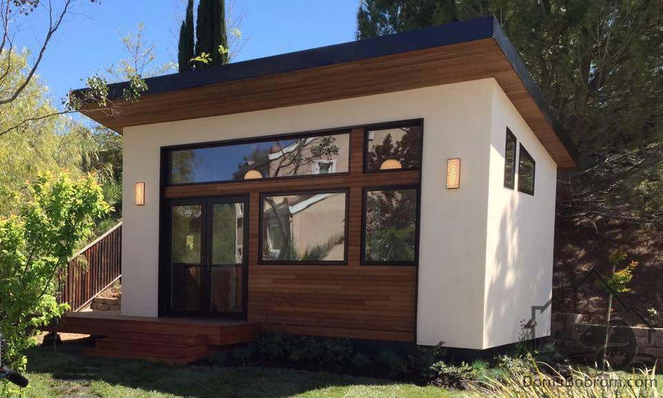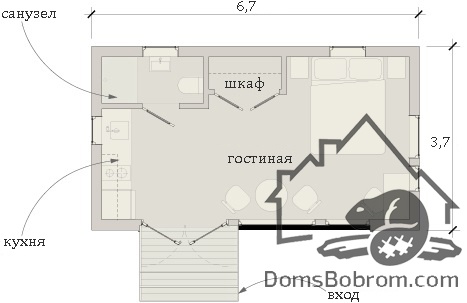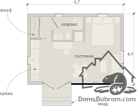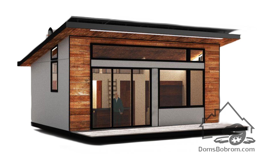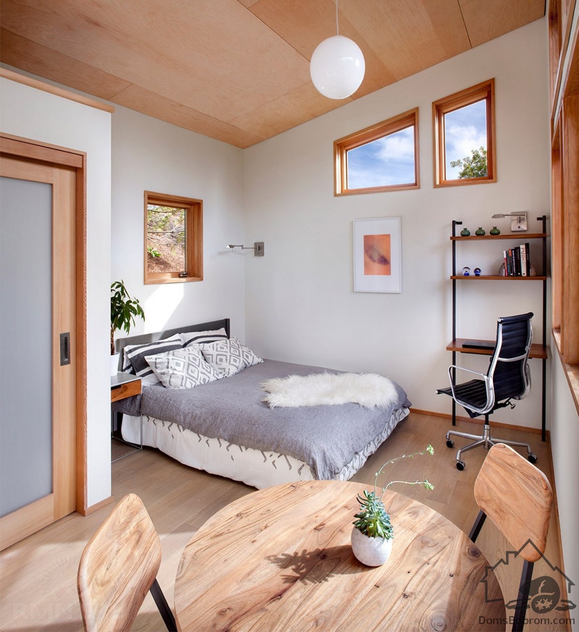 Внутреннее пространство дома разделено на функциональные зоны: кухню, гостиную, спальню и санузел. В варианте 1 (на 16 кв.м.) нашлось место для компактного рабочего места в углу спальни и маленького обеденного стола. Ванная комната может показаться тесноватой, но там найдется все, что нужно для комфортной жизни.