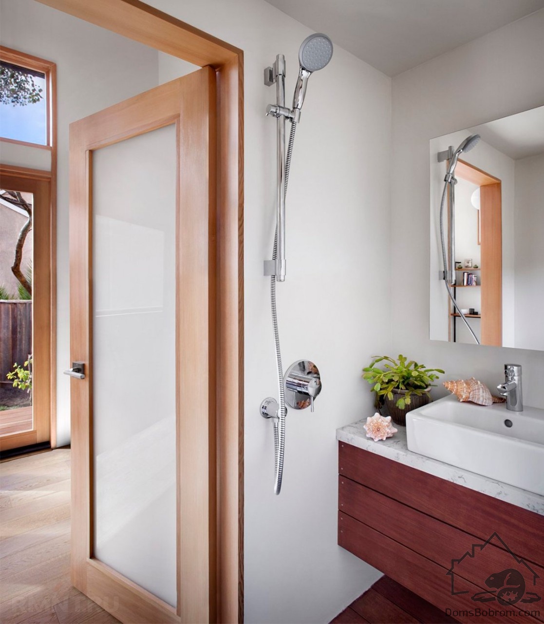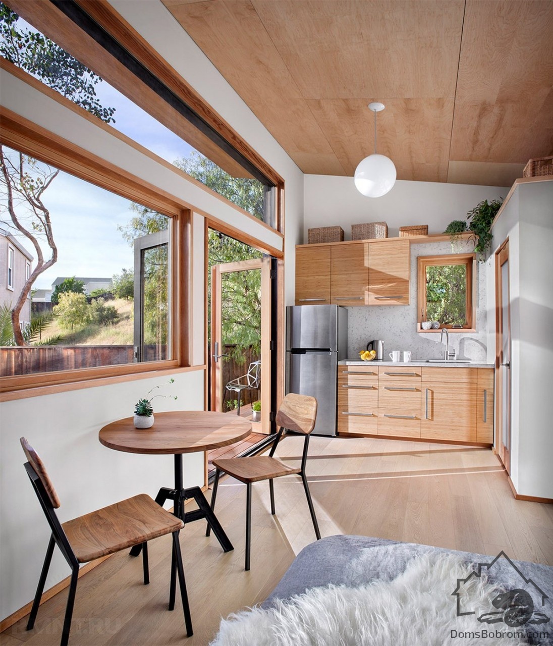 Входная дверь из стекла и несколько окон разного размера впускают в это небольшое пространство максимум света. А отсутствие внутренних перегородок делает помещение просторным и воздушным.