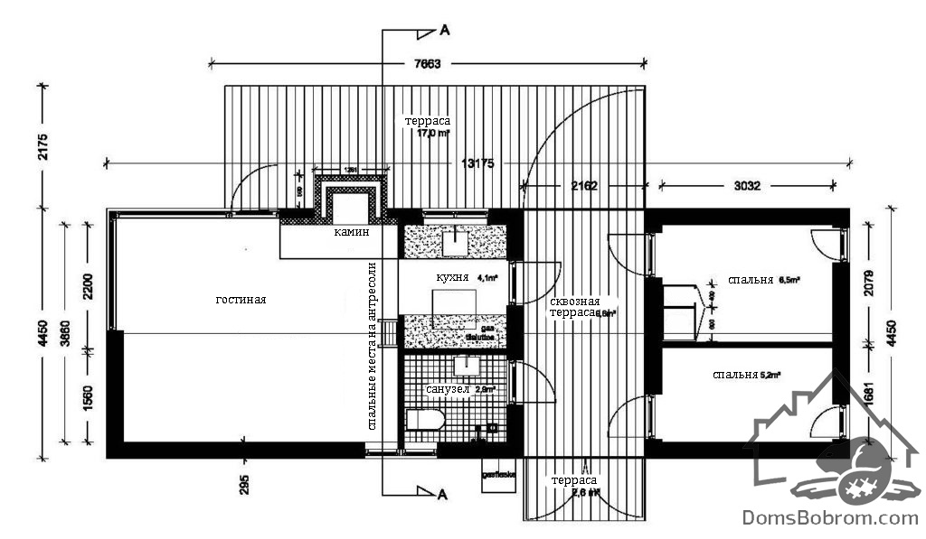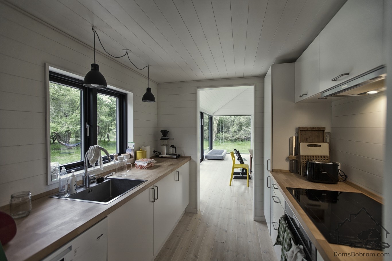 Благодаря террасе внутри дома активная и пассивная зоны получаются соединены проходом, который можно открывать в обе стороны по мере необходимости. Кухня расположена так, что она хорошо подходит как для приема пищи в помещении, так и на открытом воздухе.