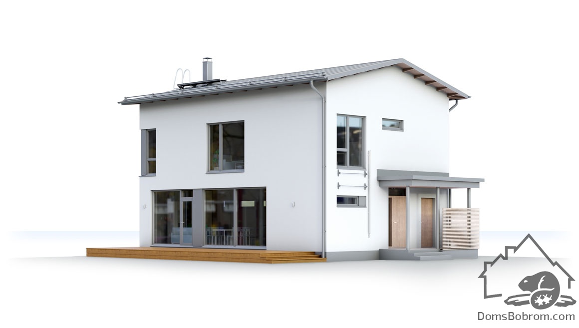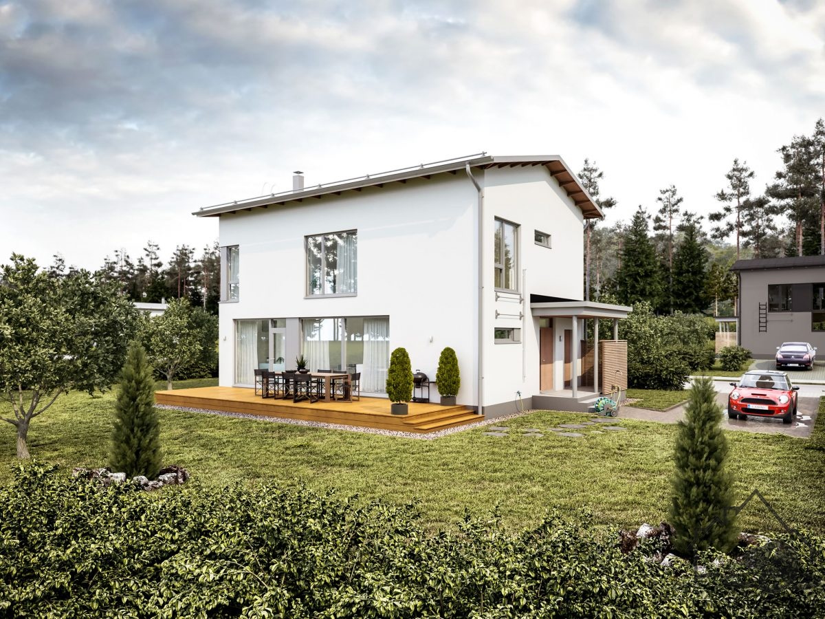 Alpi - это довольно просторный дом для семьи. Базовый проект может быть дополнен по вашему желанию балконами или террасами. В плане учтены места для хранения вещей и уход за одеждой: в подсобное помещение есть отдельный вход. Холл наверху служит второй гостиной. Даже большая семья и друзья по достоинству оценят просторную и уютную гостиную-кухню-столовую и террасу вокруг дома.