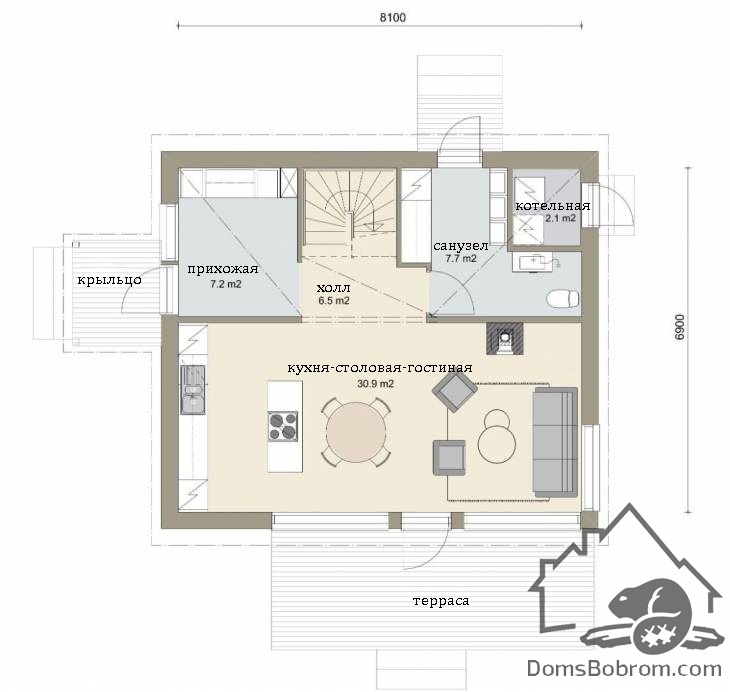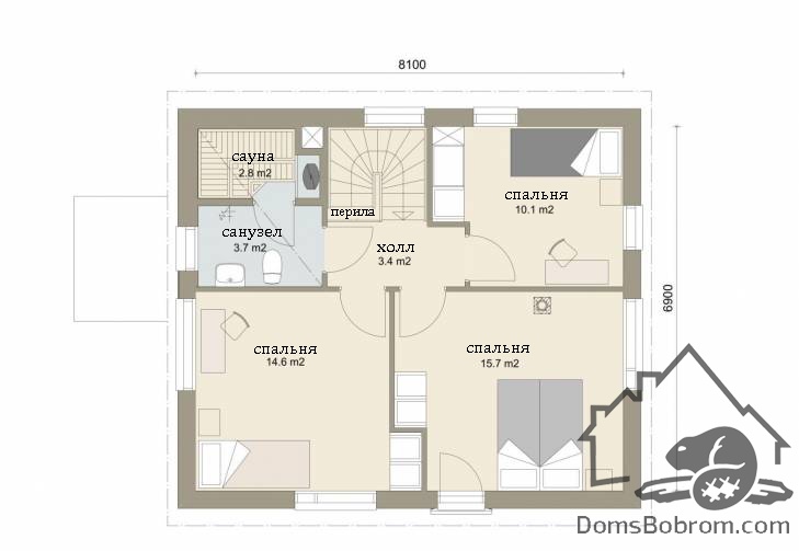 На первом этаже расположены общие зоны и хозяйственные зоны. Второй этаж полностью отведен под приватную зону спален. Здесь же можно сделать сауну.