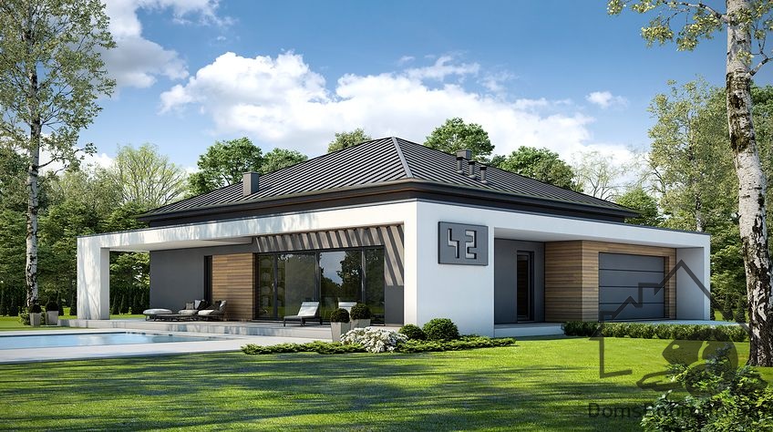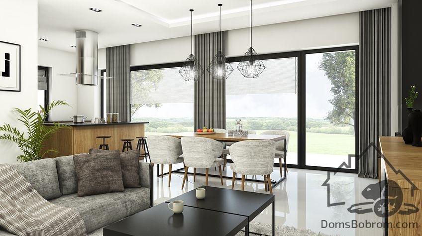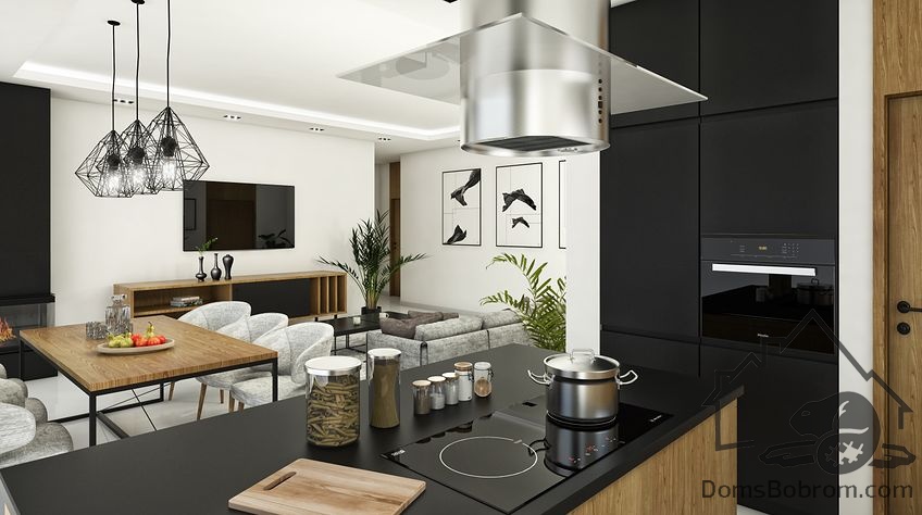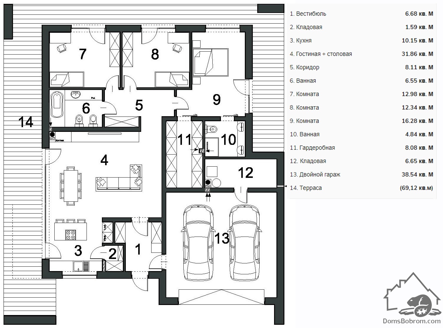 Планировка дома состоит из 3-х отдельных зон: дневная зона в виде гостиной и открытой кухни с кладовой, ночная зона с 3 спальнями, из которых главная спальня имеет свою ванную и гардеробную, санузел для остальных домочадцев, а также техническая зона с гаражом на две машины, котельная и техническое помещение с выходом извне.