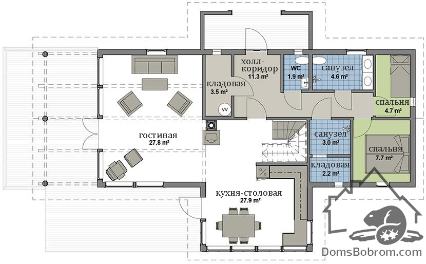 Дом Asen - это просторный дом, где есть достаточно места для всех. Внутри есть 3 гостиные и 4 больших спальни. Центральный дымоход позволяет установить камин или дровяную печь во всех гостиных, а также на кухне. Дом Asen очень уютный и эргономичный, в нем также предусмотрено пространство для хранения вещей.