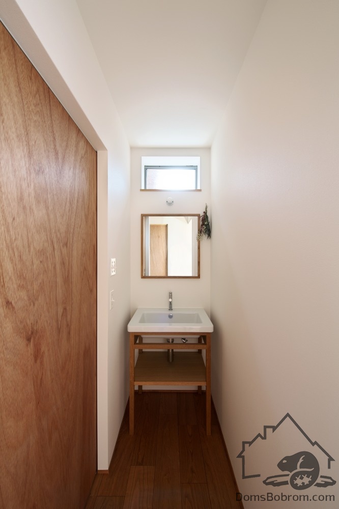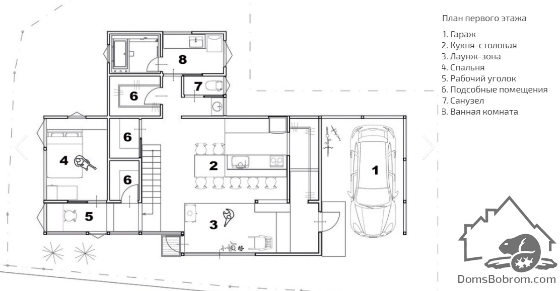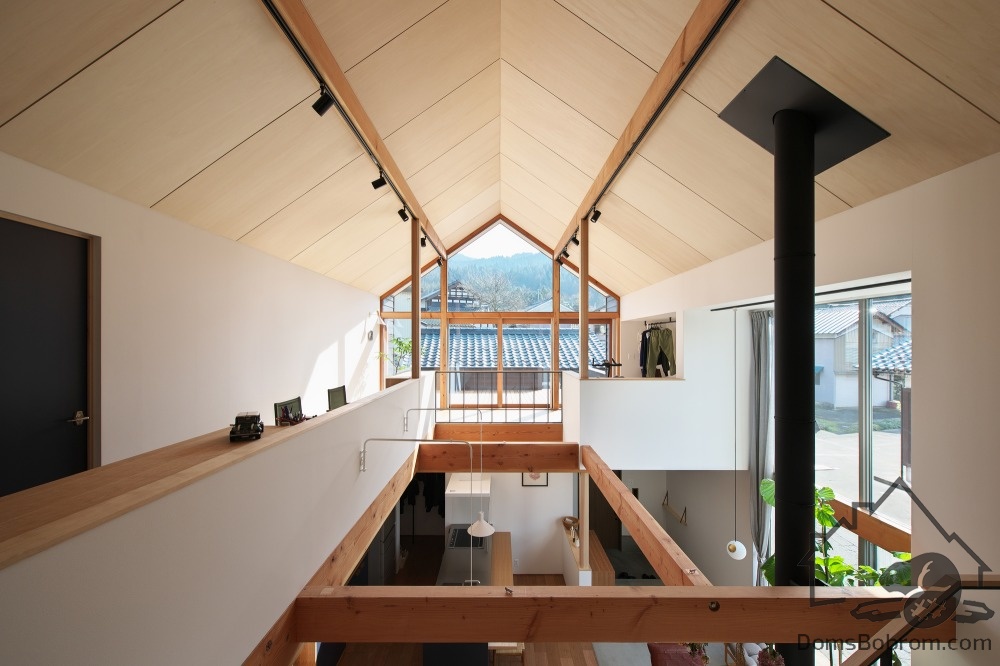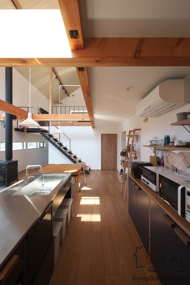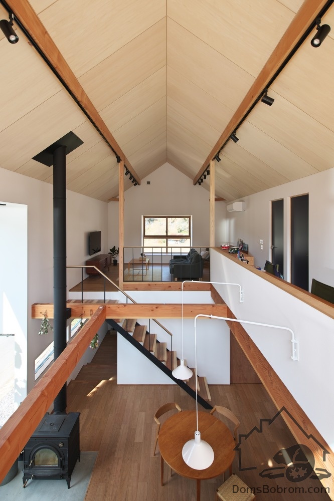 На первом этаже дома центральную часть занимают зоны для общения и дневной активности: лаунж-зона у дровяной печи, столовая и кухня. Рядом расположены спальня, рабочий уголок, а также подсобные помещения, ванная и санузел.
