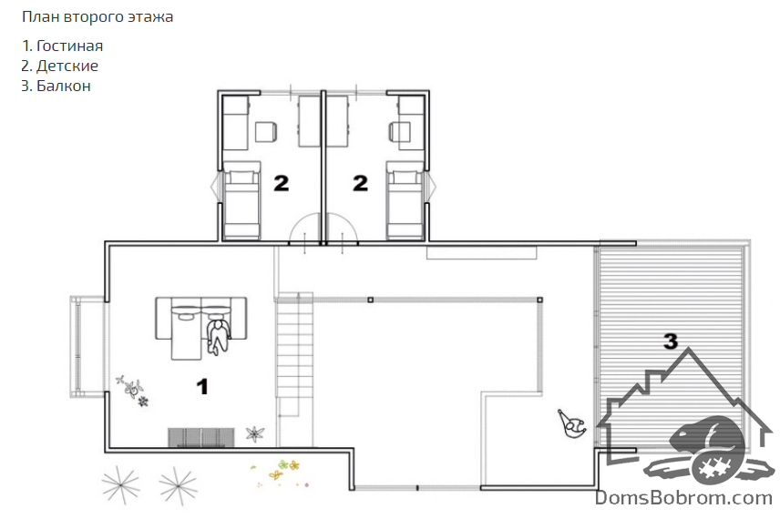 Просторную гостиную вынесли на второй этаж. По соседству с ней еще две комнаты.