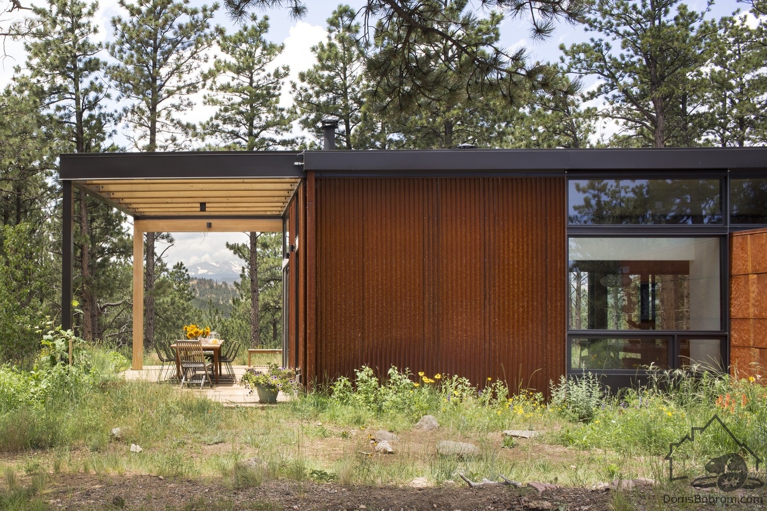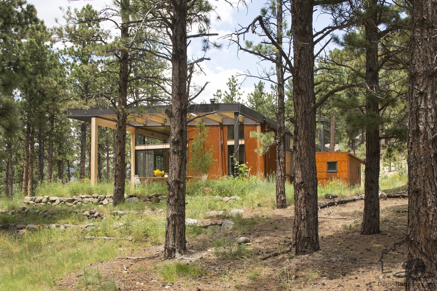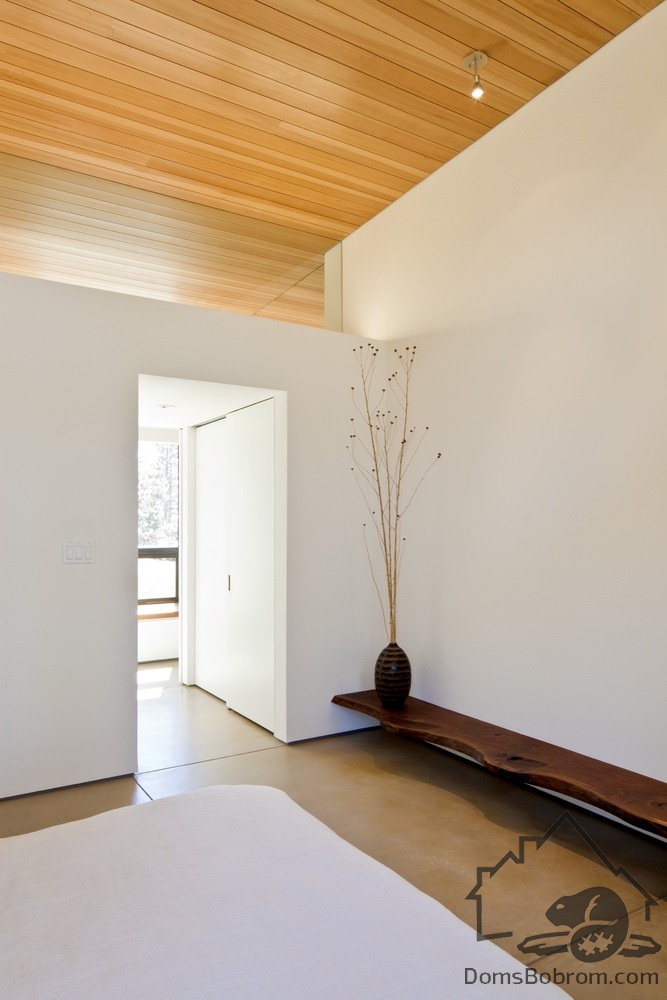 Для дома BoulderCabin очень важны простота и сдержанность. Свес крыши обеспечивает защиту от солнца для стекла, выходящего на запад, и навес для террасы. Бетонная плита внутреннего пола выходит наружу, создавая зону для развлечений на открытом воздухе, окруженную густым лесом. Эффектный выступ из дерева и стали на крыше делает эту комнату на открытом воздухе органичным продолжением дома.