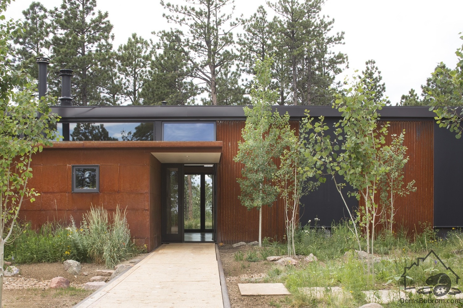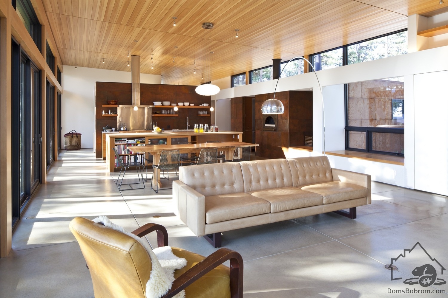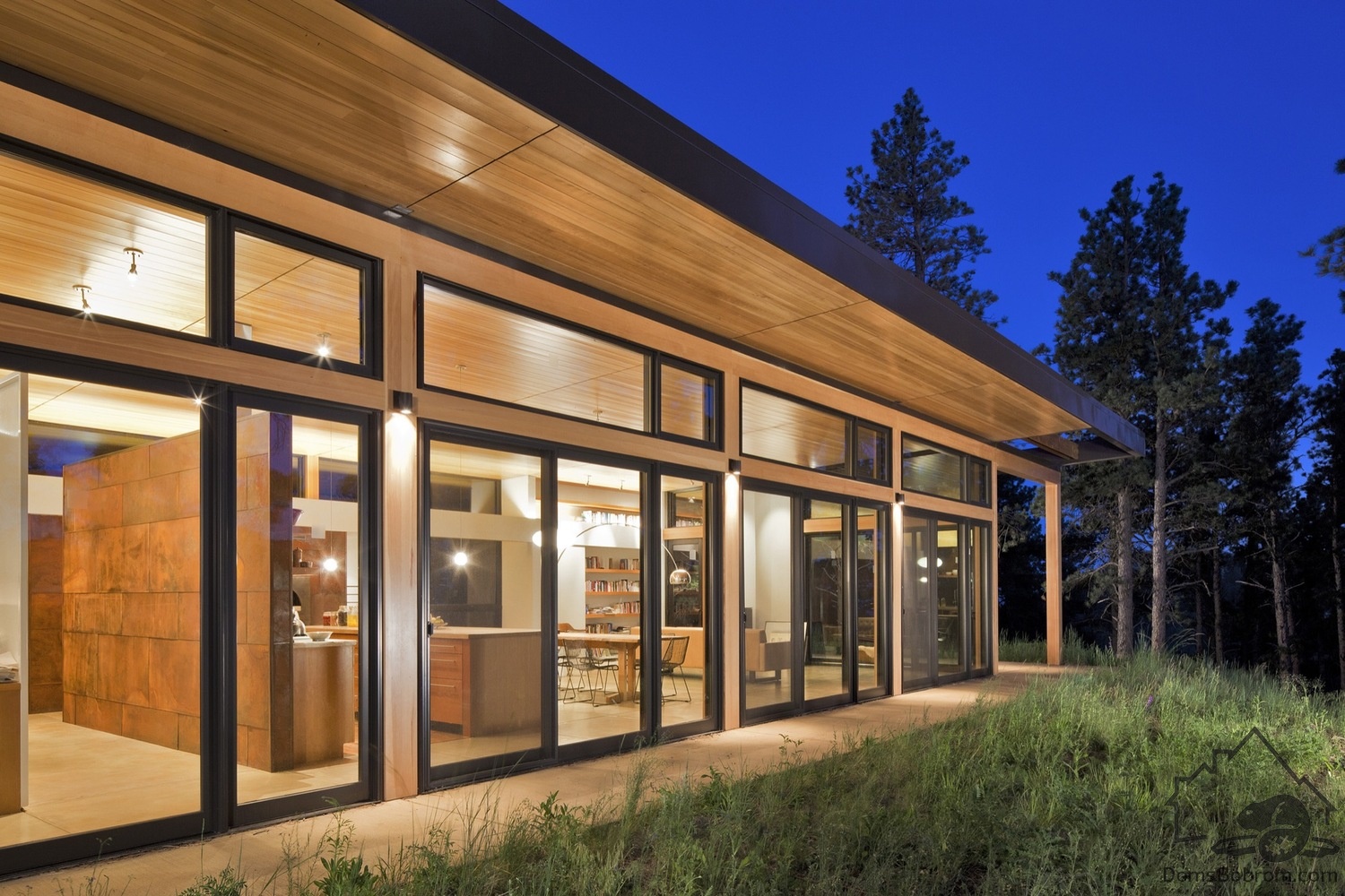 Для дома BoulderCabin очень важны простота и сдержанность. Свес крыши обеспечивает защиту от солнца для стекла, выходящего на запад, и навес для террасы. Бетонная плита внутреннего пола выходит наружу, создавая зону для развлечений на открытом воздухе, окруженную густым лесом. Эффектный выступ из дерева и стали на крыше делает эту комнату на открытом воздухе органичным продолжением дома.