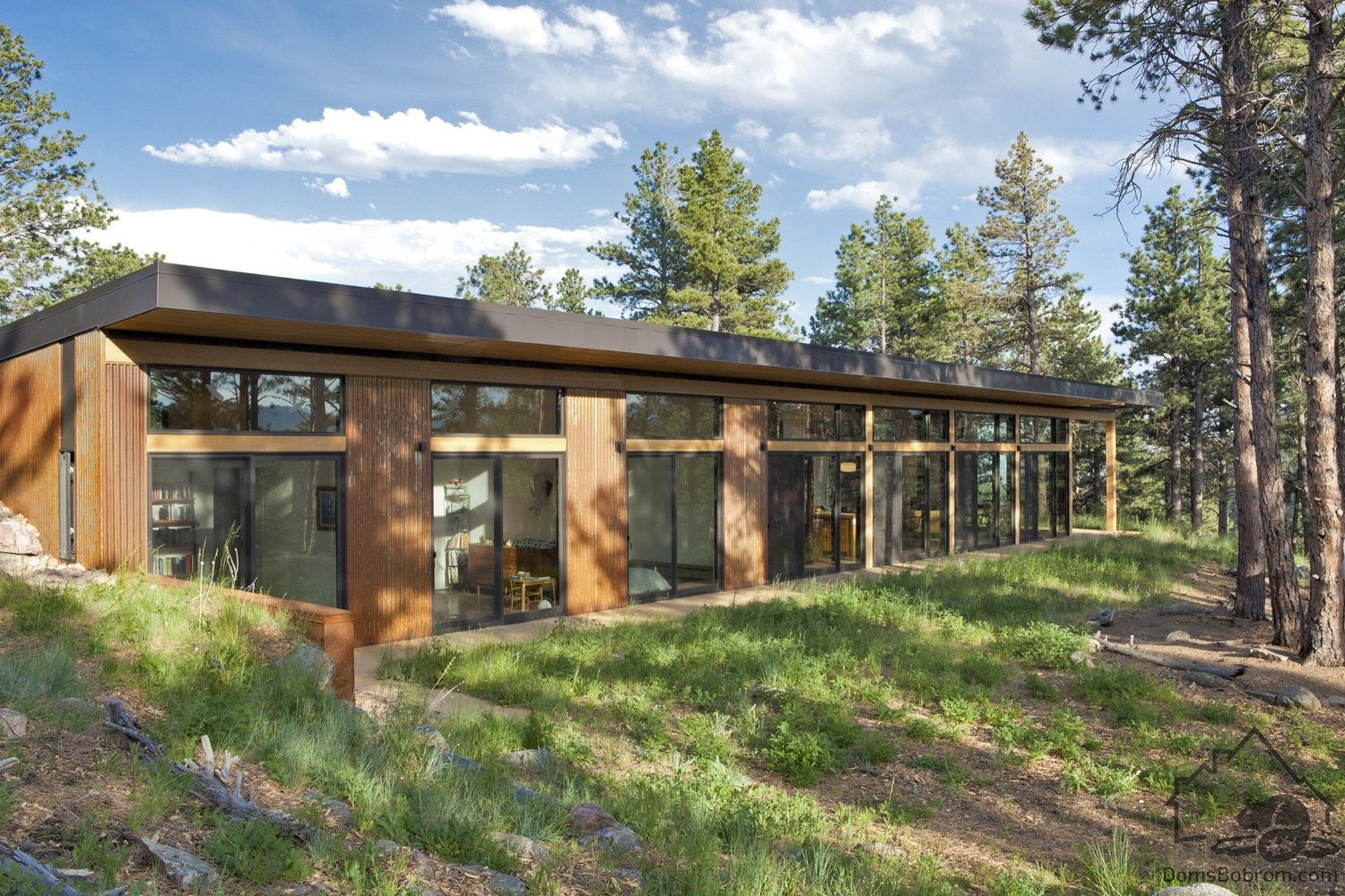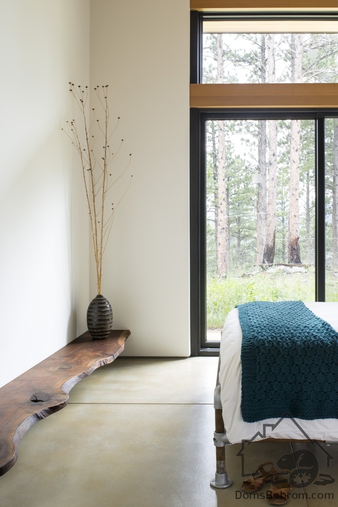 Дом BoulderCabin расположен в живописном месте. Внутренние помещения строгие, что отражает дисциплинированный образ жизни домовладельцев. На восточной стороне дома спроектированы панорамные окна для проникновения утреннего света. Раздвижные стеклянные панели увеличивают длину дома, открывая панорамный вид с западной стороны строения.