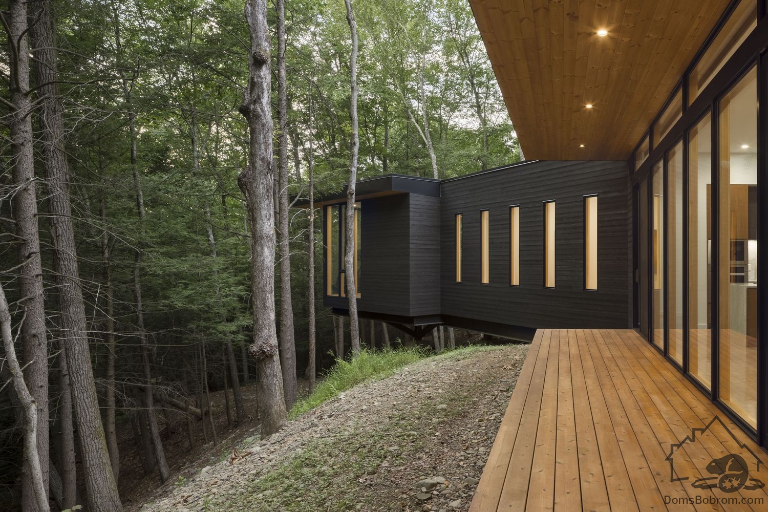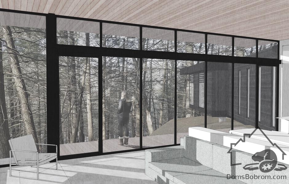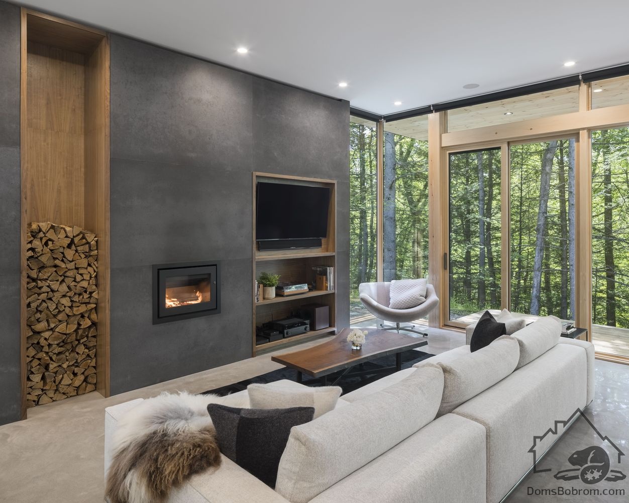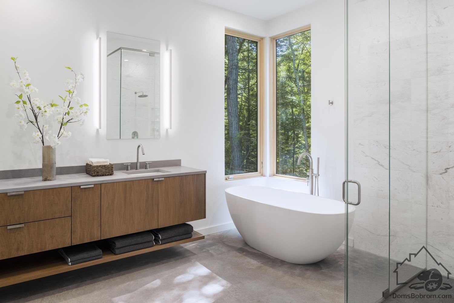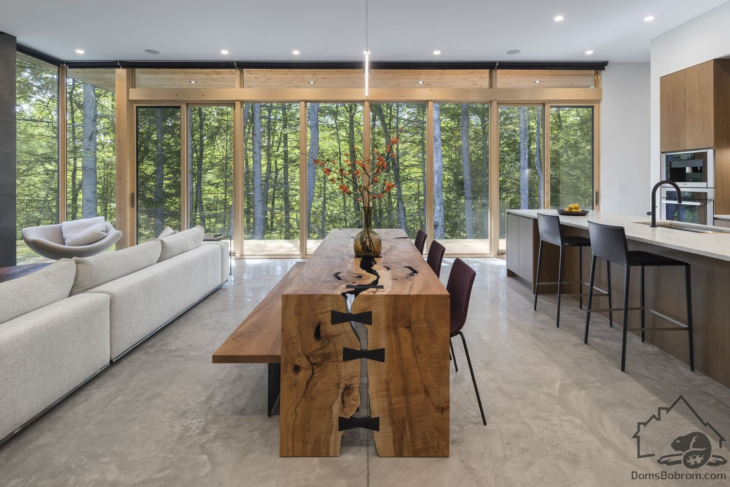 Из открытой гостиной большие панорамные окна открывают вид на лес. Одна из спален включает в себя просторную отдельно стоящую ванну - место, где можно расслабиться и отдохнуть. Ванна находится на видном месте рядом с угловым окном.