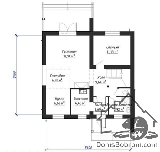 Планировка в доме продумана и очень удобна. На первом этаже располагается небольшая по площади, однако довольно вместительная гостиная, которая совмещена с кухней и столовой. Есть выход из гостиной-столовой на террасу заднего двора. Также на первом этаже запроектирована спальня, при желании её можно перепрофилировать под кабинет. Размещение топочной и кухни позволяет объединить вентиляцию и дымоход в одну трубу над коньком.