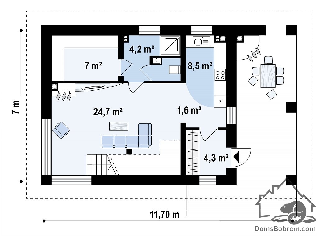 Планировка первого этажа включает баню гостиную, совмещенную со столовой зоной и отделенную от кухни. В углу гостиной располагается уютный камин. Также здесь предусмотрен выход на террасу.