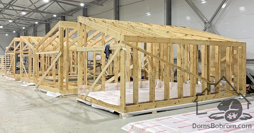 - Каркас:Каркас дома из сухой строганой доски камерной сушки: силовой каркас, хедеры, ригеля, обвязки каркаса, стропильная система, перекрытия, перегородки.