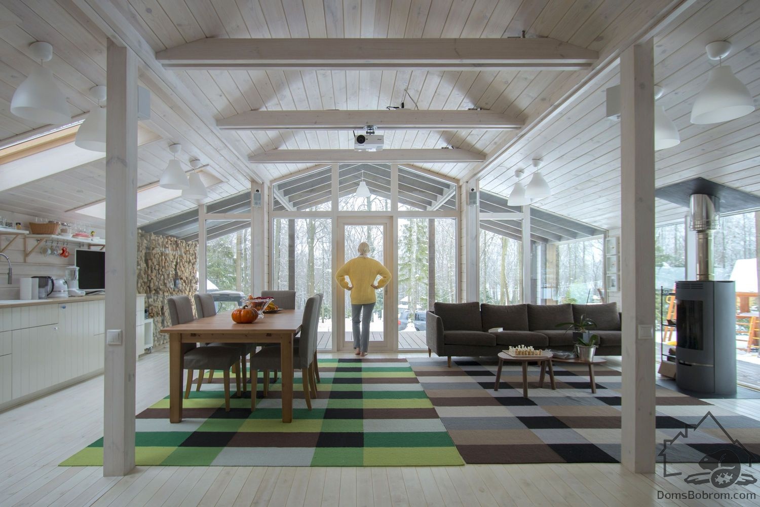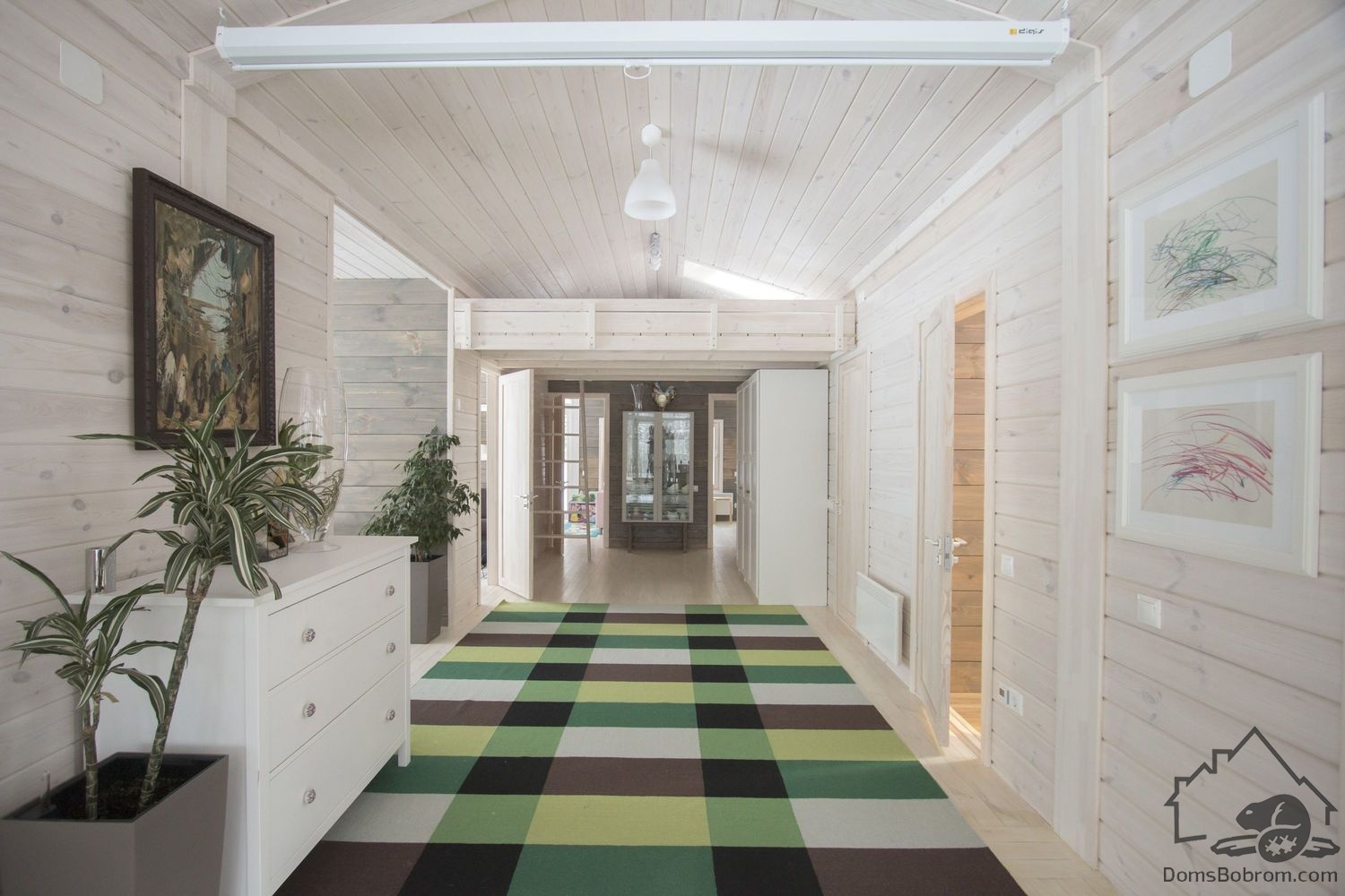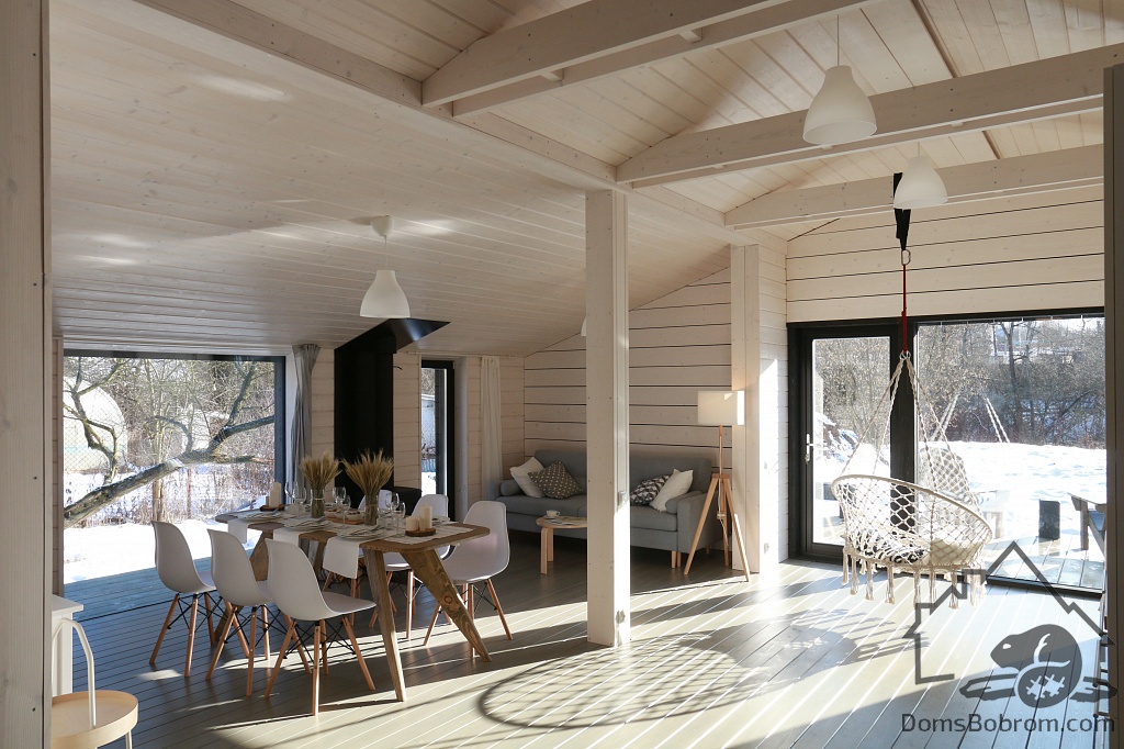 Весь интерьер выполнен из массива сосны, окрашен в белый цвет. Торцевые стены, окрашенные в темный цвет, визуально увеличивают пространство.