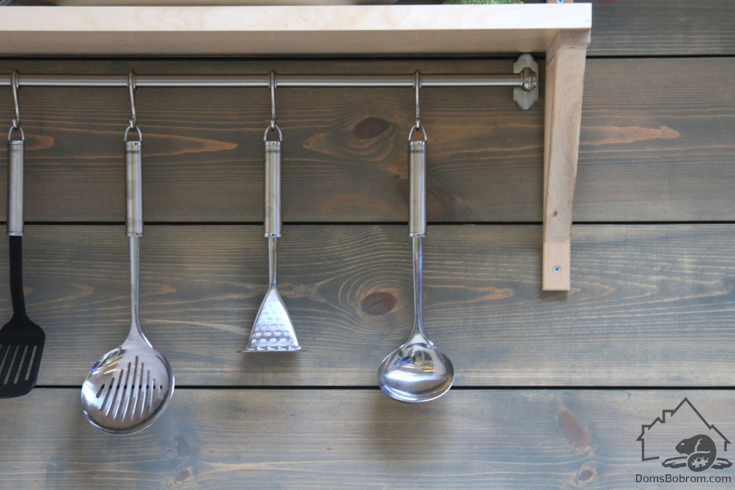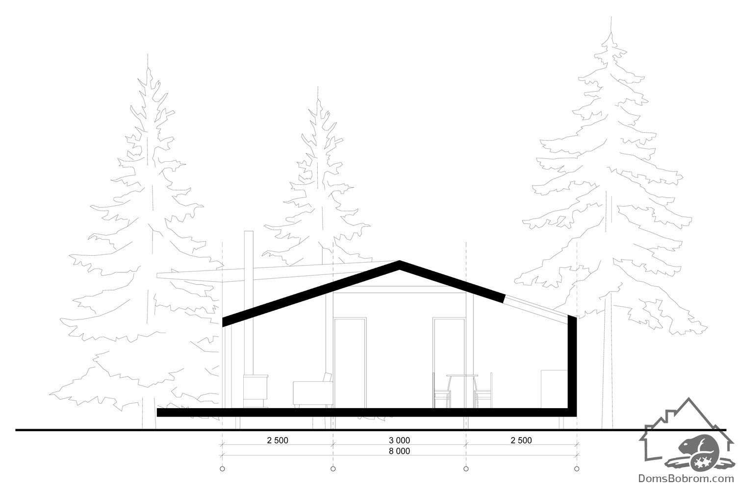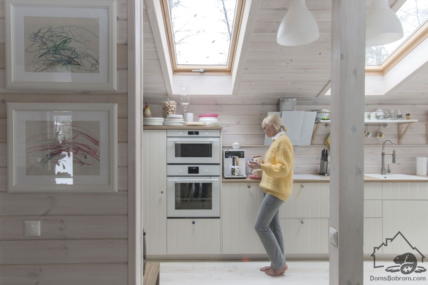 Весь интерьер выполнен из массива сосны, окрашен в белый цвет. Торцевые стены, окрашенные в темный цвет, визуально увеличивают пространство.