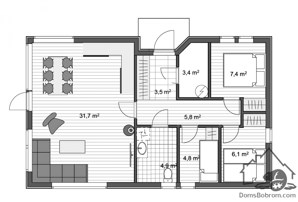 Дом Дзержинский - это дом для круглогодичного комфортного проживания семьи из 3-5 человек. Несмотря на компактные размеры, внутри поместились все необходимые комнаты, его планировка удобная и комфортная. В доме Дзержинский три спальни и гостиная-столовая-кухня, большой общий совмещенный санузел, при входе находится подсобное помещение подходящее для использования в качестве бойлерной и кладовки. В проходном тамбуре-прихожей обустроен просторный встроенный шкаф для одежды.