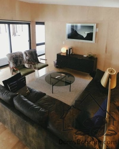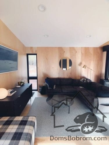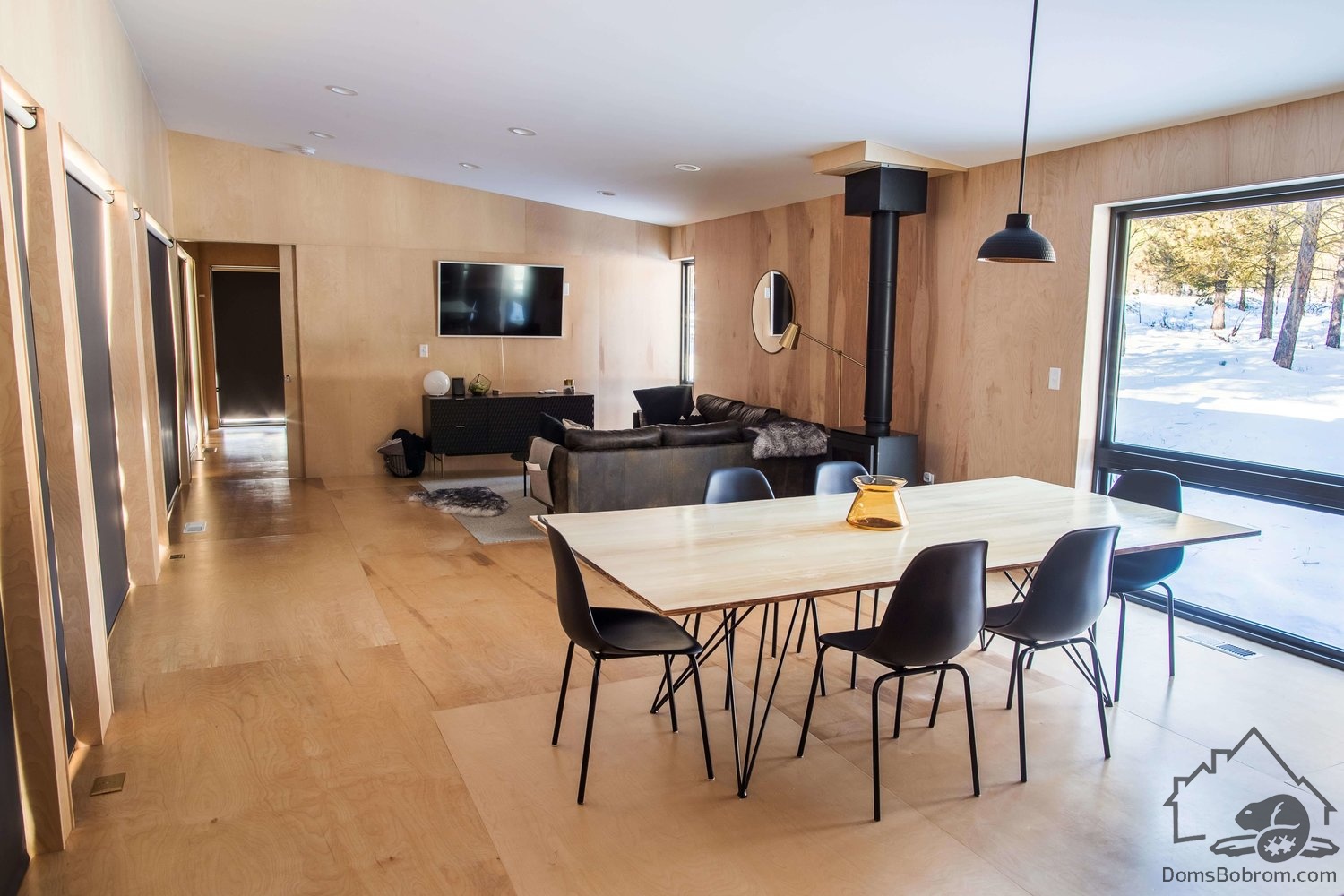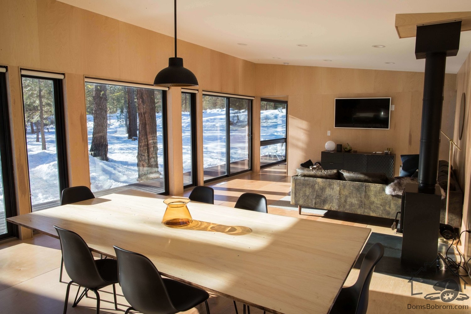 Минималистичные, но практичные внутренние поверхности в основном облицованы деревянными панелями в сочетании с современной мебелью, что создает вневременную, но утонченную атмосферу, очень уютную, но в то же время очень просторную со всеми необходимыми удобствами. Кажется, что каждая деталь дома продумана до мелочей.