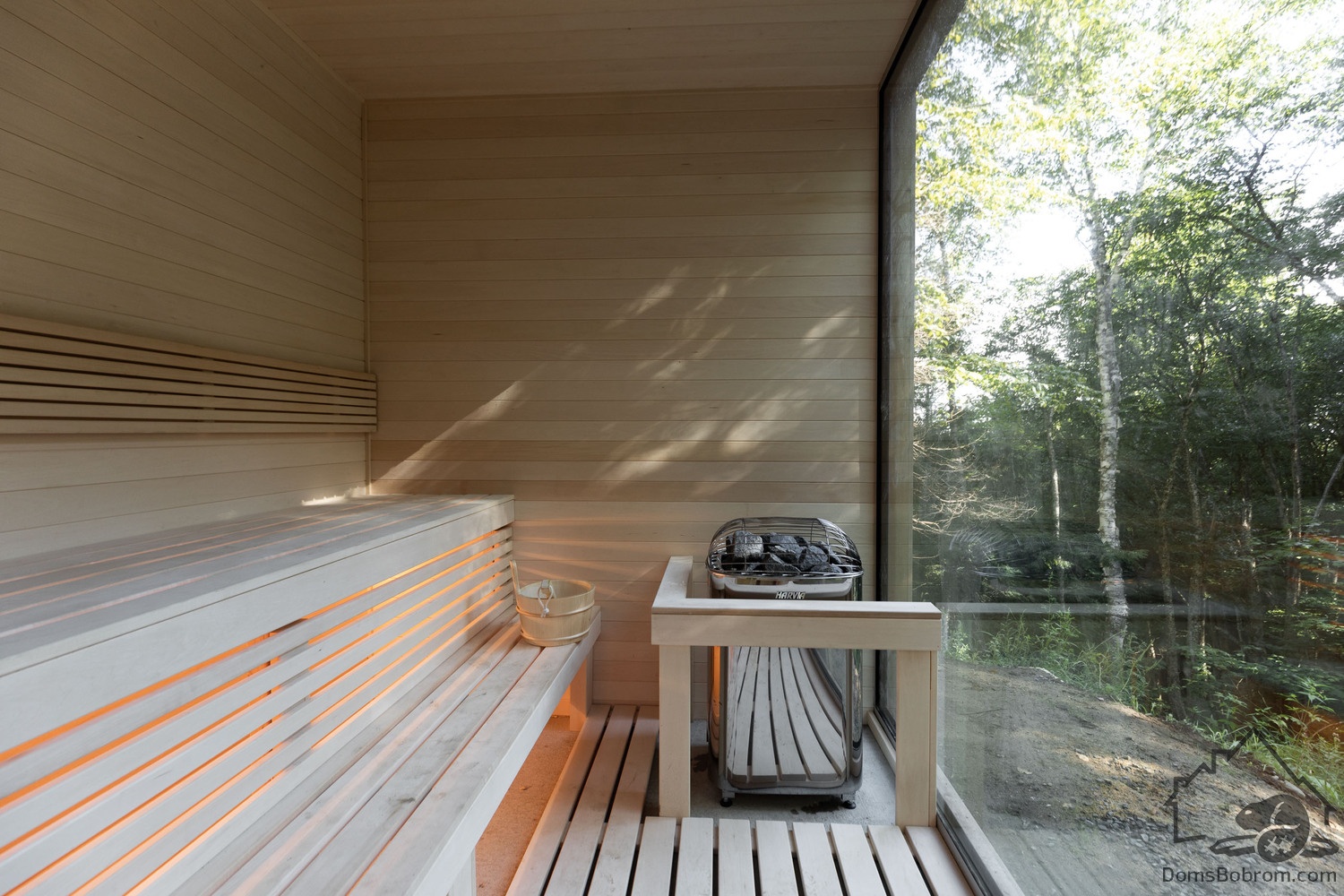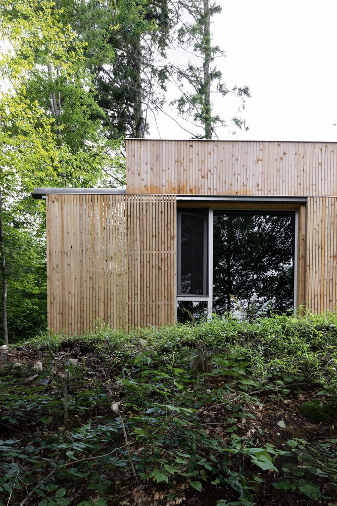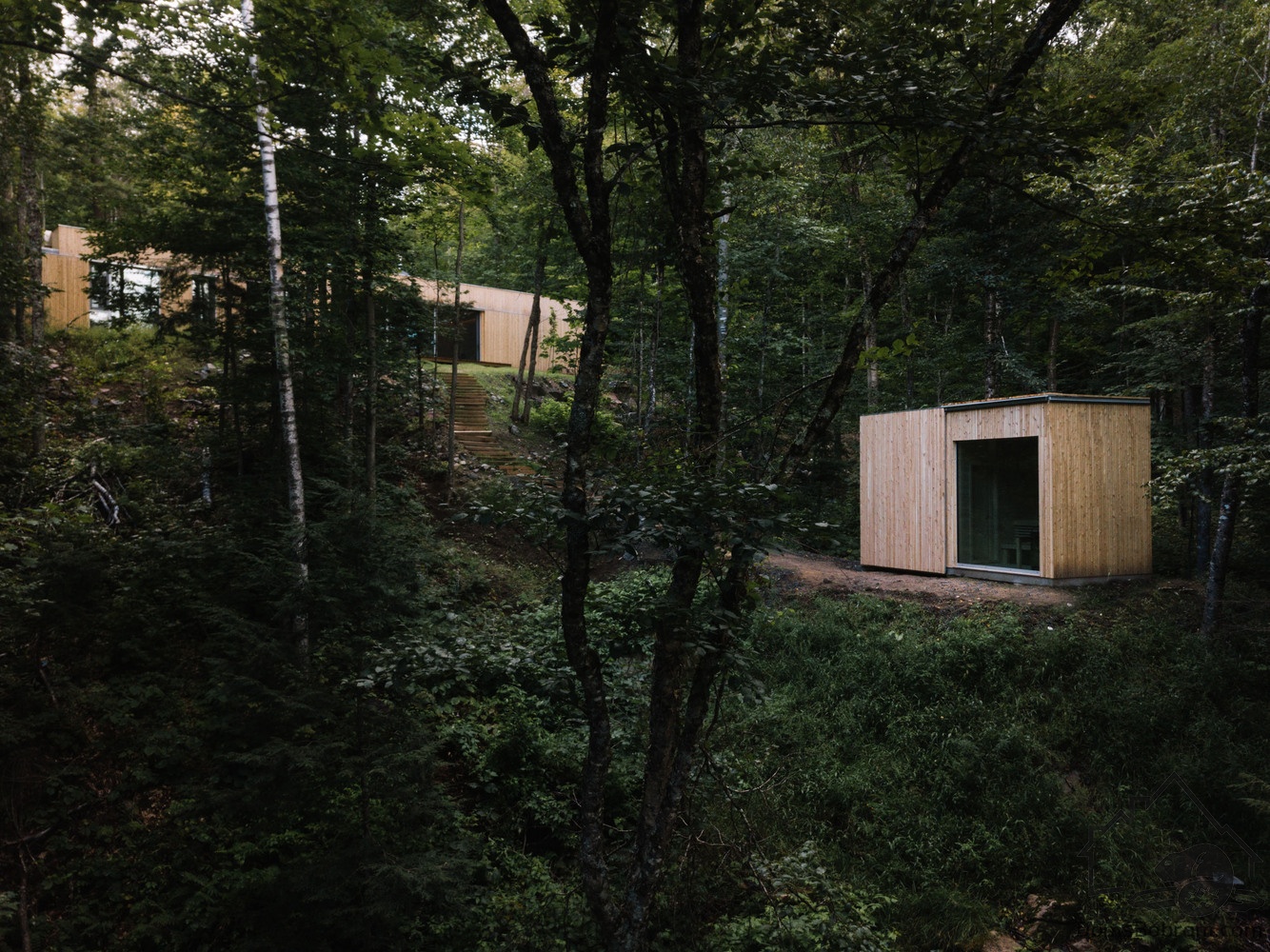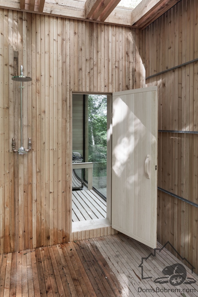 В данном варианте винтовая лестница по склону холма ведет вниз к сауне, спроектированной по подобию основного дома. Рядом с ней оборудован холодный летний душ.
