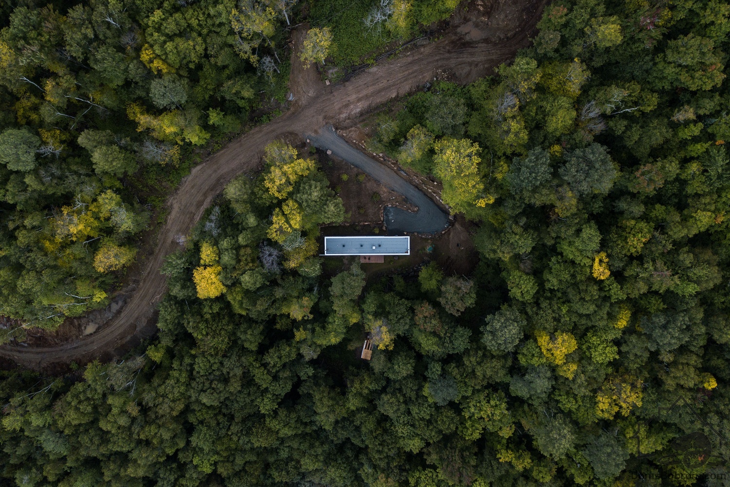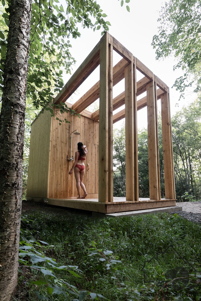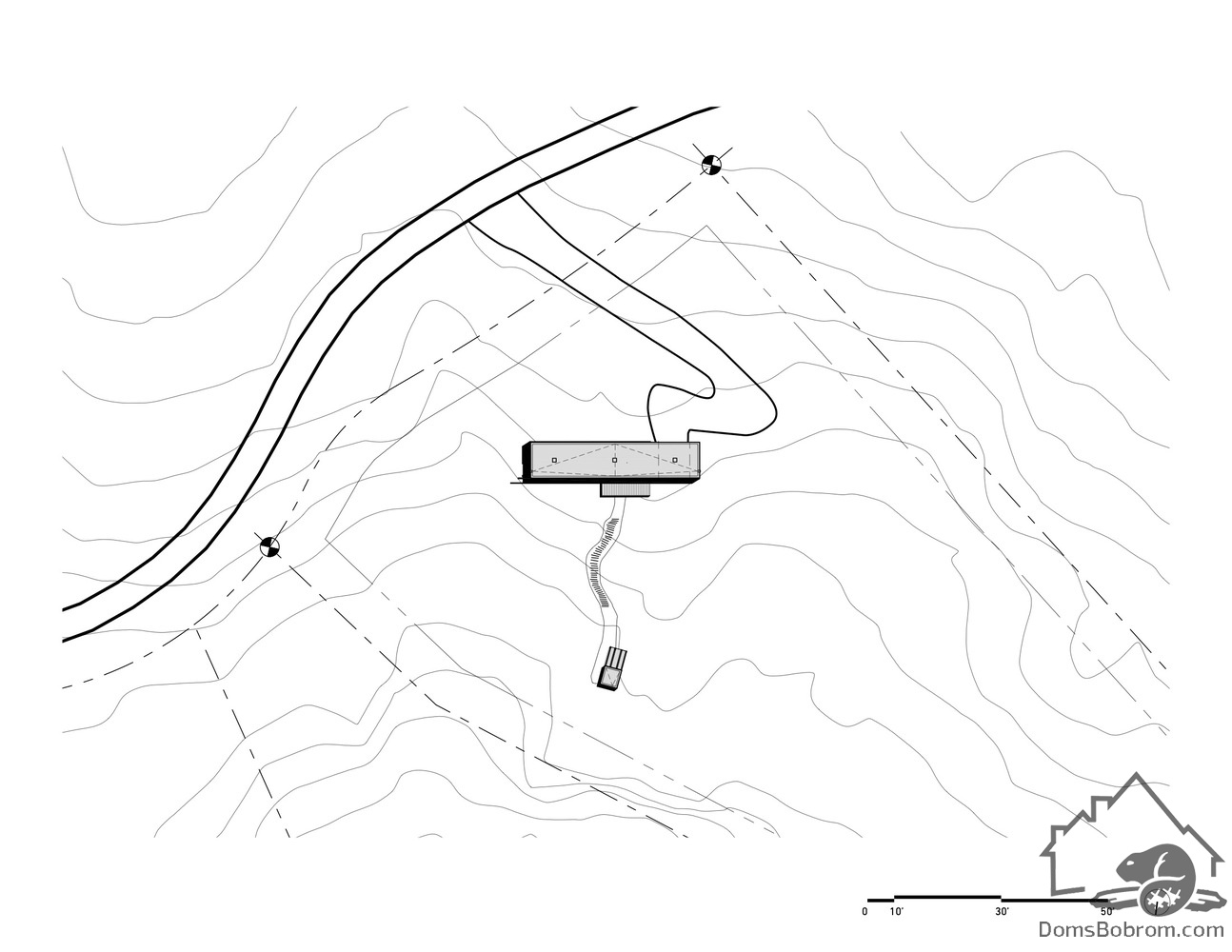 В данном варианте винтовая лестница по склону холма ведет вниз к сауне, спроектированной по подобию основного дома. Рядом с ней оборудован холодный летний душ.