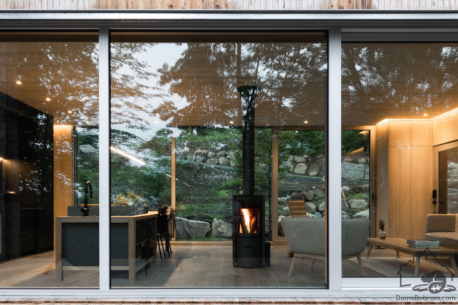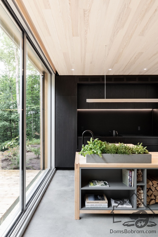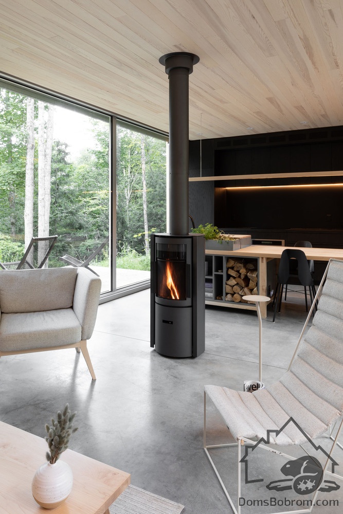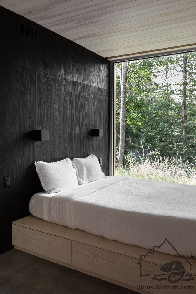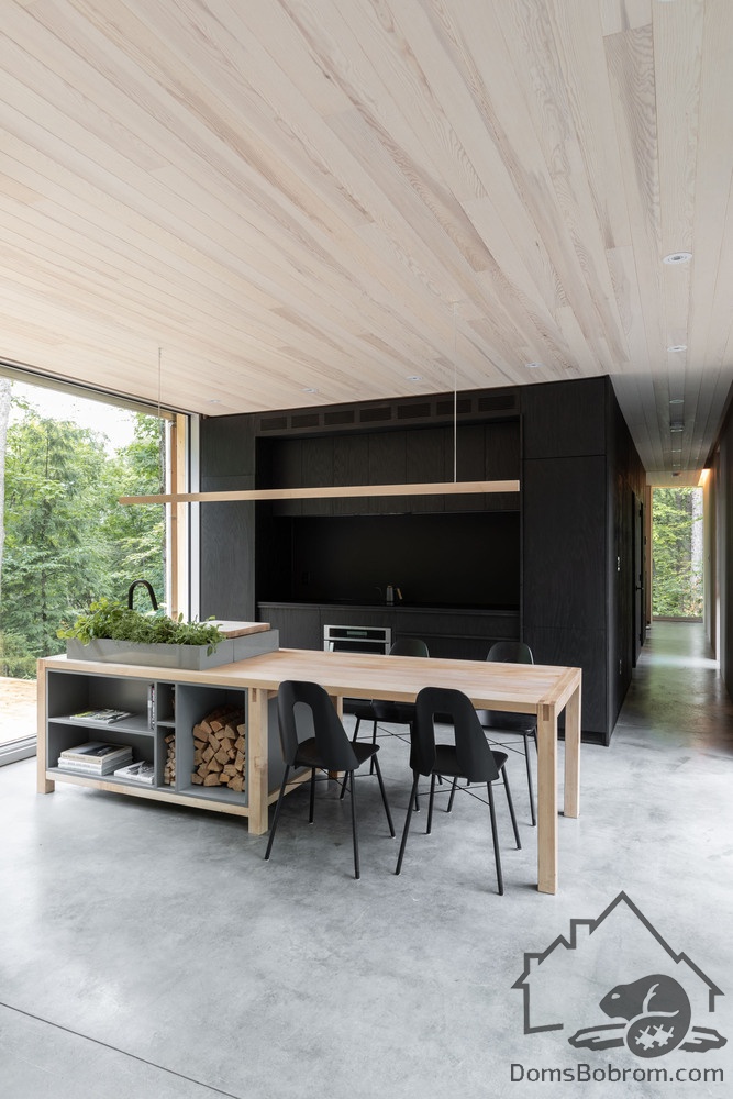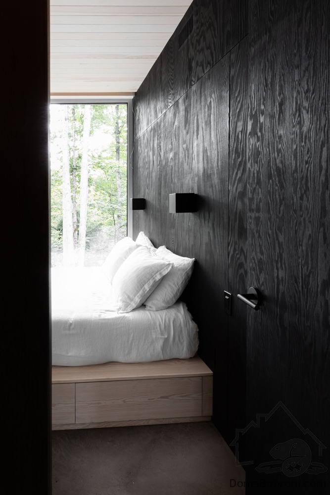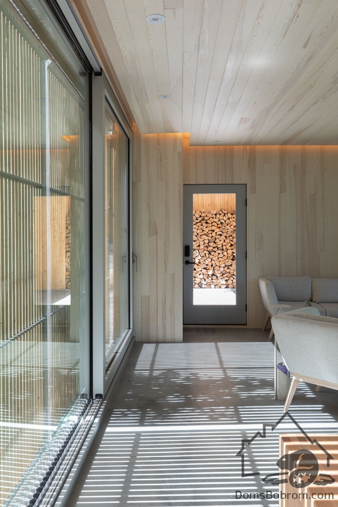 Дом Hinterhouse - это компактный дом площадью 93 м2, который вмещает две спальни, одну ванную комнату и жилую площадь открытой планировки. Жилое пространство, окруженное окнами от пола до потолка с обеих сторон, организовано вокруг центральной дровяной печи, которая вращается на 360 °, обеспечивая вид на огонь со всех сторон. Обеденный стол служит кухонным островком, что является одним из способов экономии места в доме. В спальнях установлены кровати размера «queen-size» от стены до стены. Раздвижные панели скрывают телевизор в конце каждой кровати, позволяя вам просматривать фильмы, или сосредоточиться на видах из окна - по желанию.