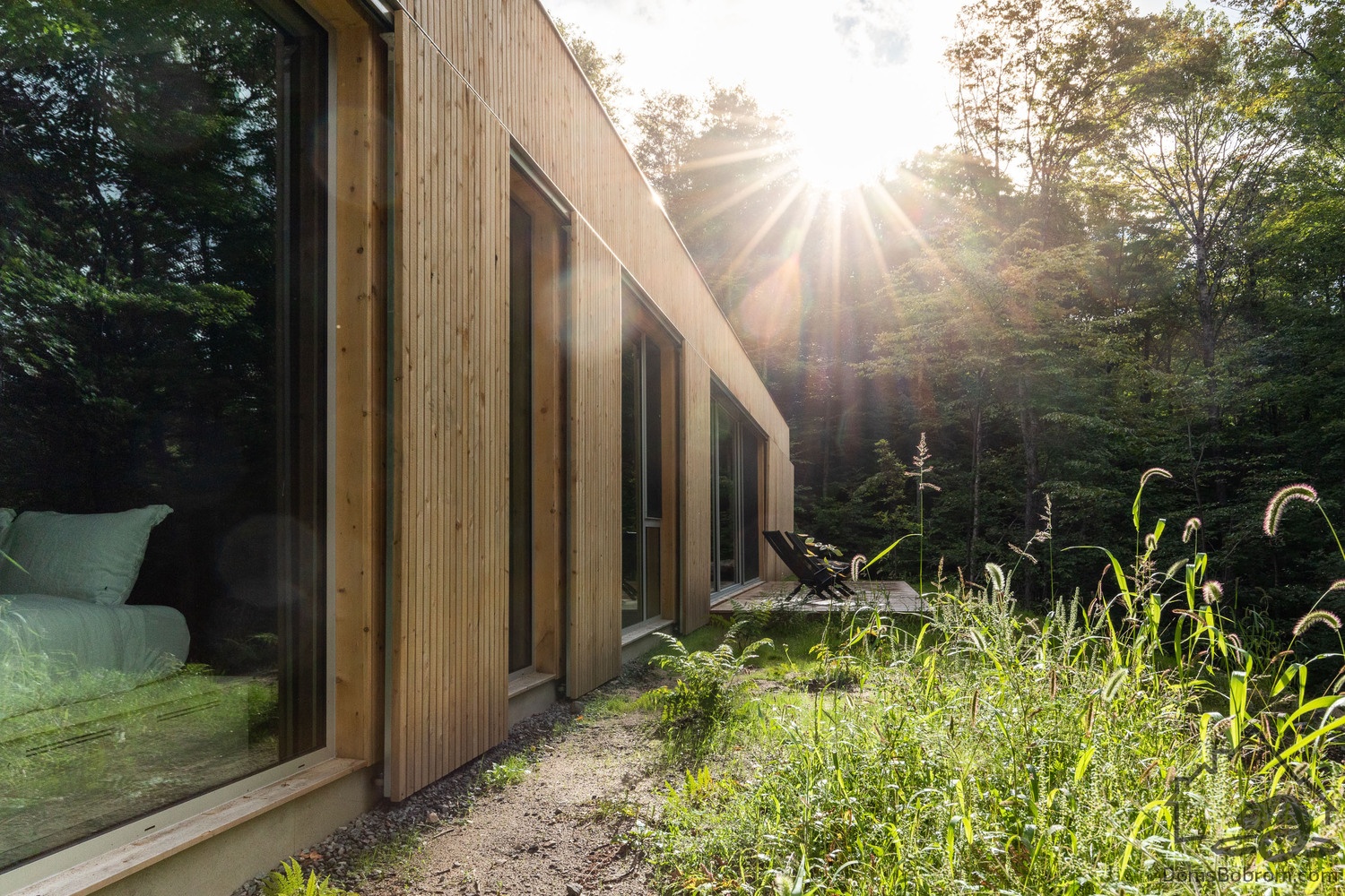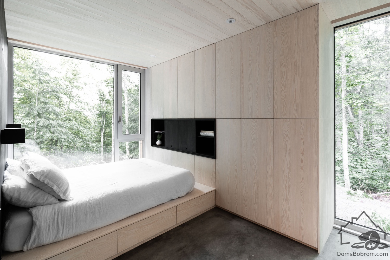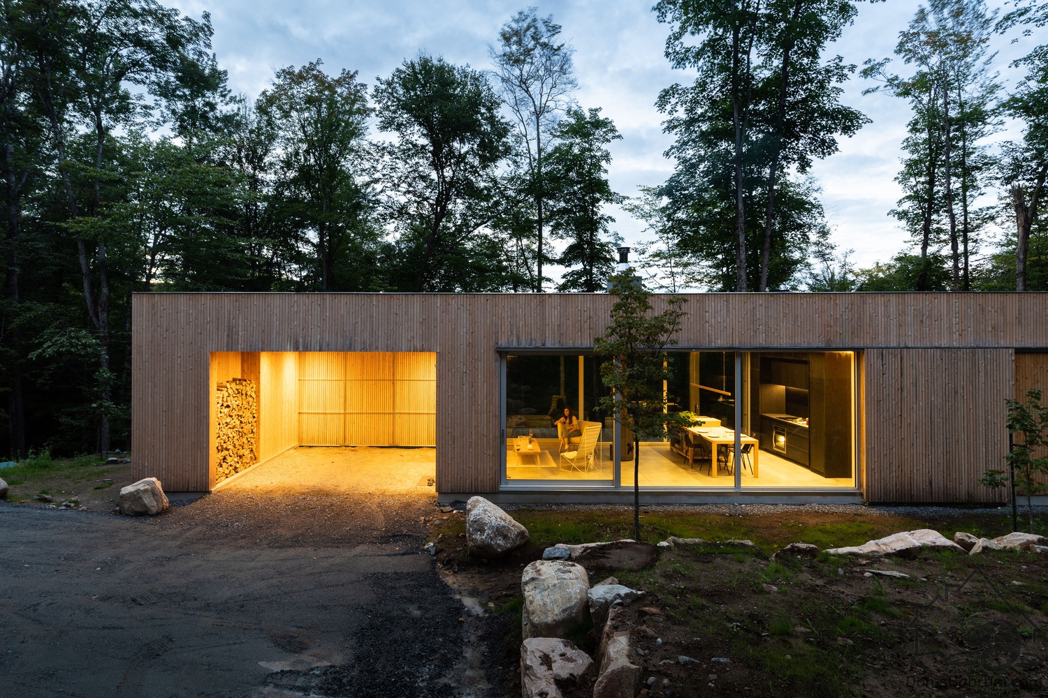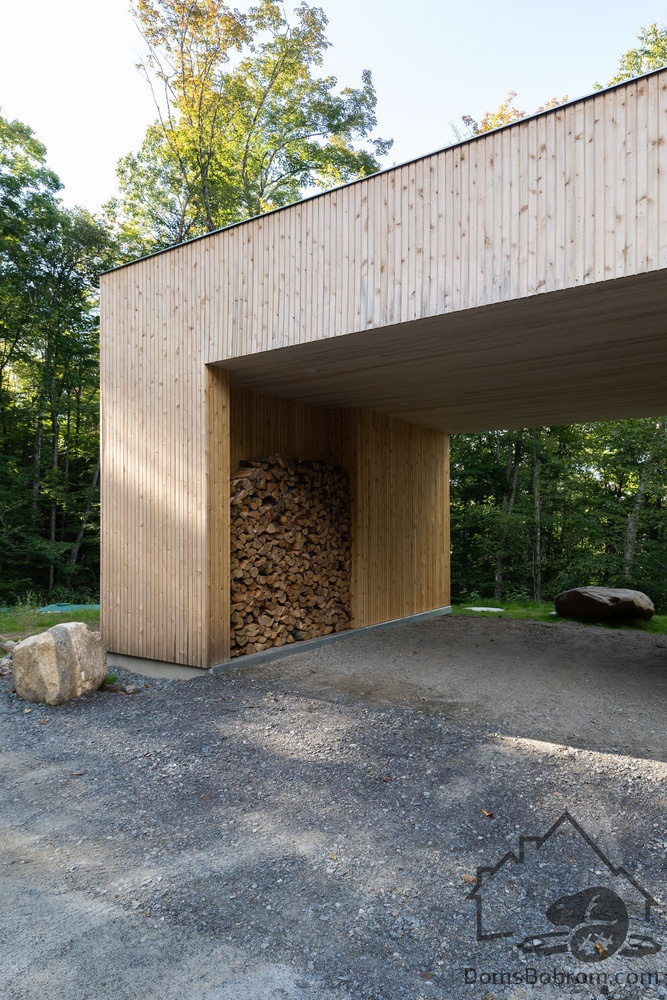 Дом Hinterhouse - это компактный дом площадью 93 м2, который вмещает две спальни, одну ванную комнату и жилую площадь открытой планировки. Жилое пространство, окруженное окнами от пола до потолка с обеих сторон, организовано вокруг центральной дровяной печи, которая вращается на 360 °, обеспечивая вид на огонь со всех сторон. Обеденный стол служит кухонным островком, что является одним из способов экономии места в доме. В спальнях установлены кровати размера «queen-size» от стены до стены. Раздвижные панели скрывают телевизор в конце каждой кровати, позволяя вам просматривать фильмы, или сосредоточиться на видах из окна - по желанию.