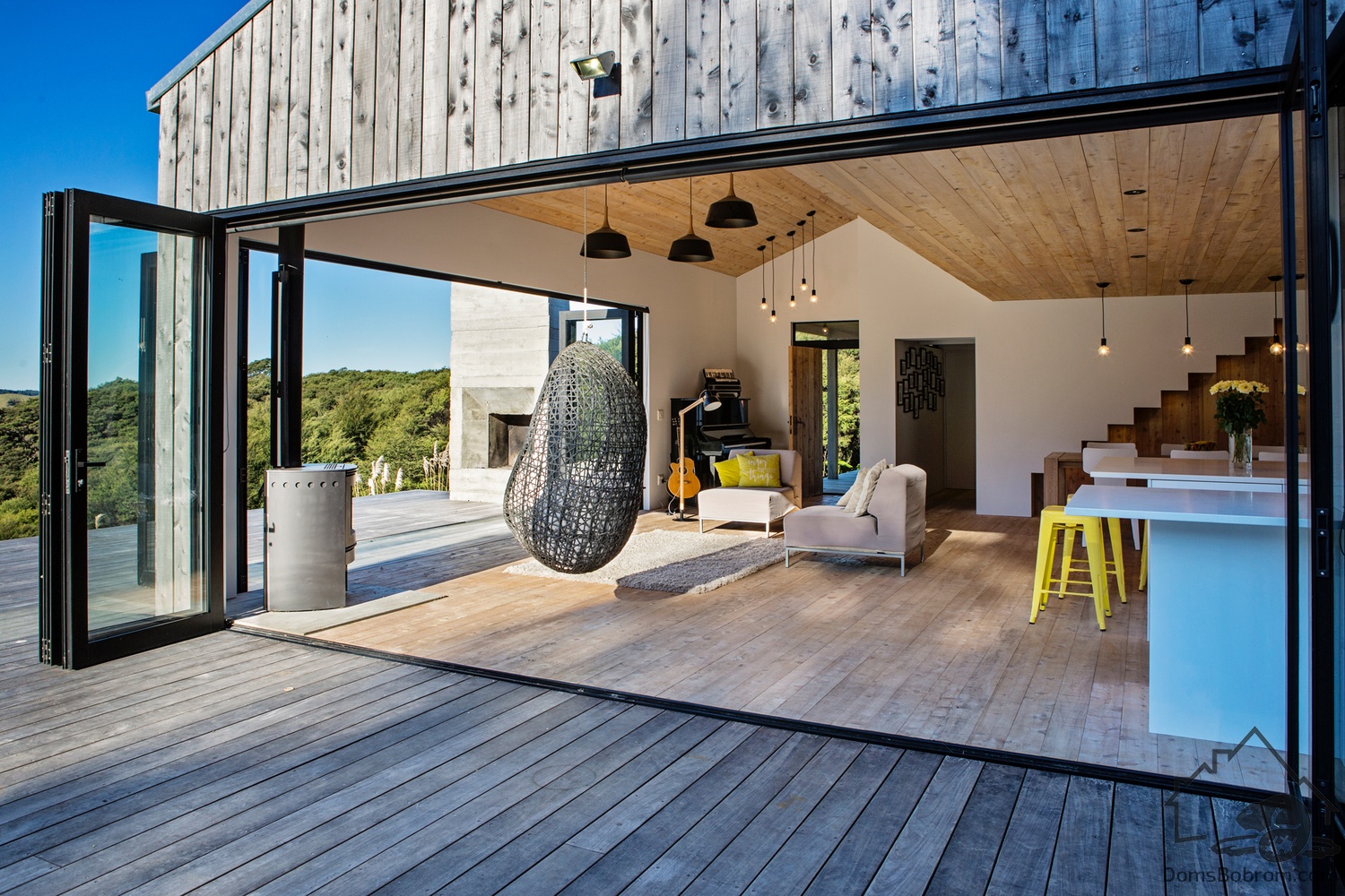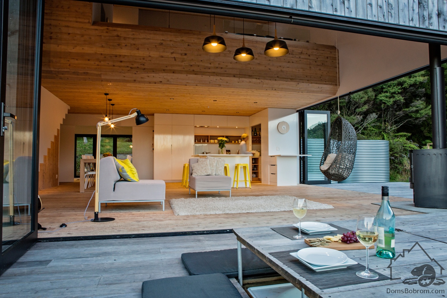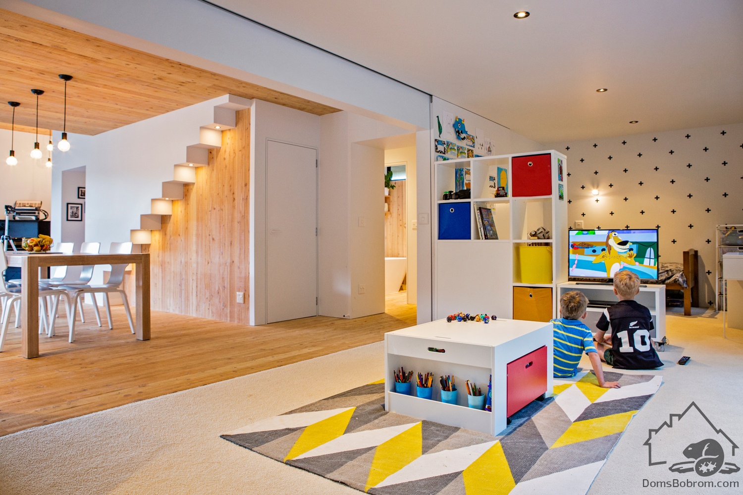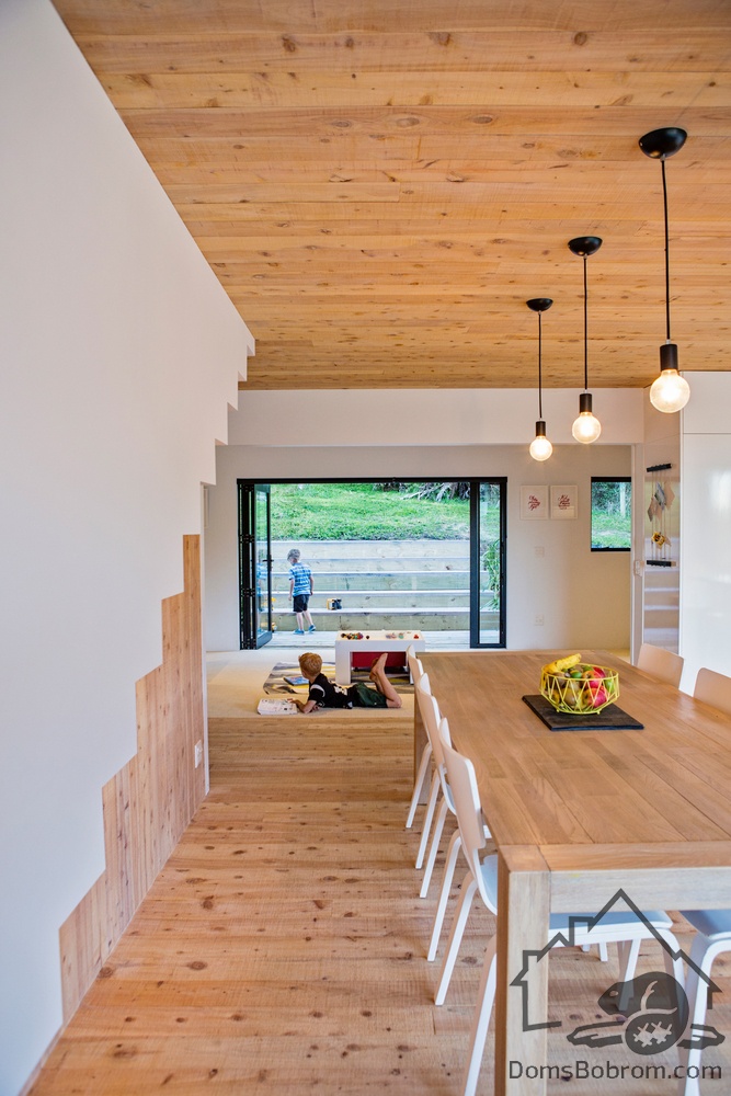 Сразу за террасой находится панорамное окно-дверь в гостиную. Далее за гостиной находится кухня и столовая. Минималистичные белые кухонные шкафы и обеденные стулья дополняют белые стены. Рядом со столовой расположена раздвижная стена, которая открывает доступ к общей детской спальне (или двум спальням) и игровой зоне открытой планировки.
