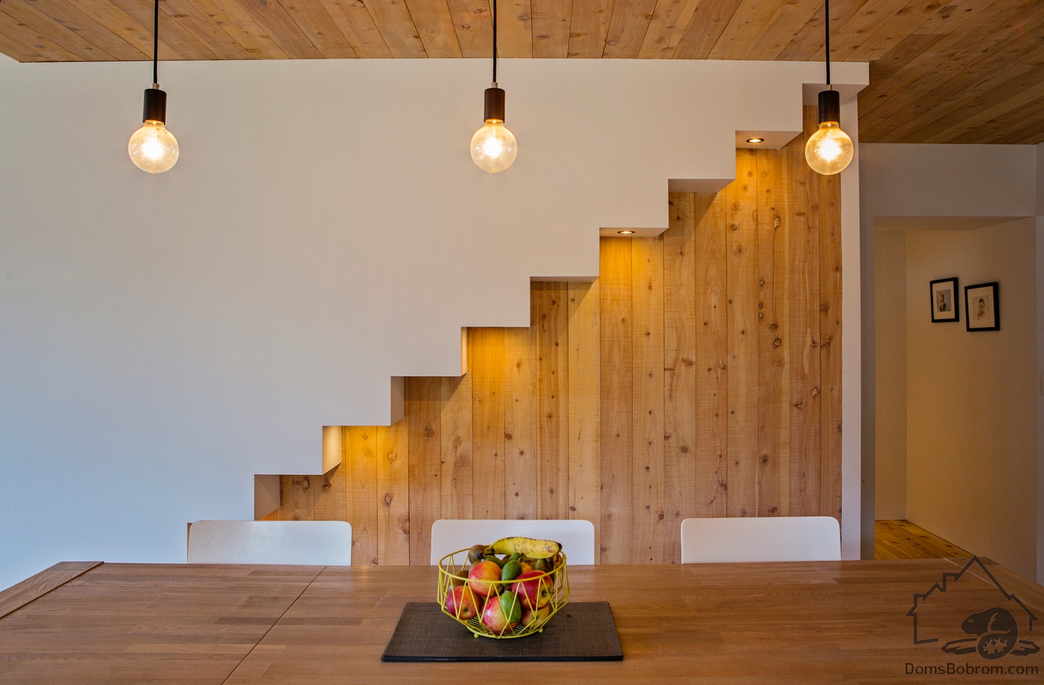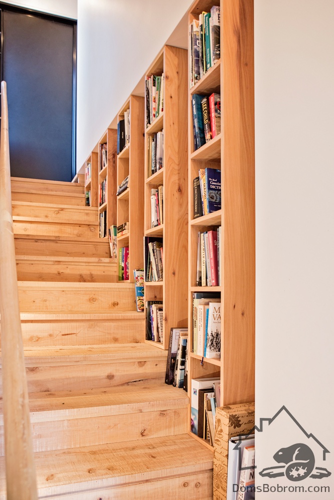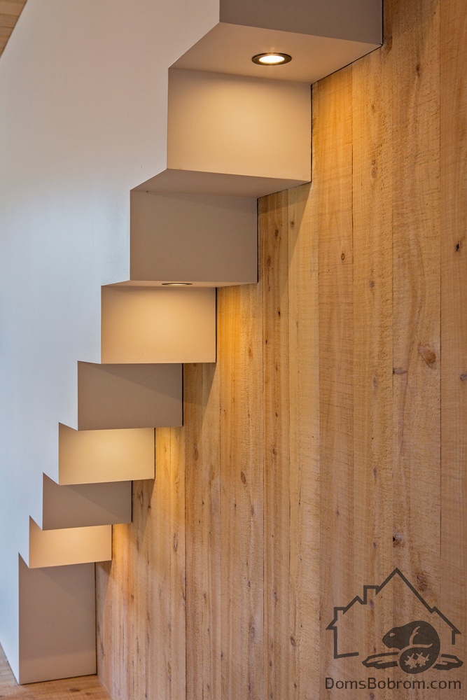 Рядом с обеденным столом расположена лестница со скрытым освещением, подчеркивающим ее дизайн. Вдоль нее навешены деревянные книжные полки.