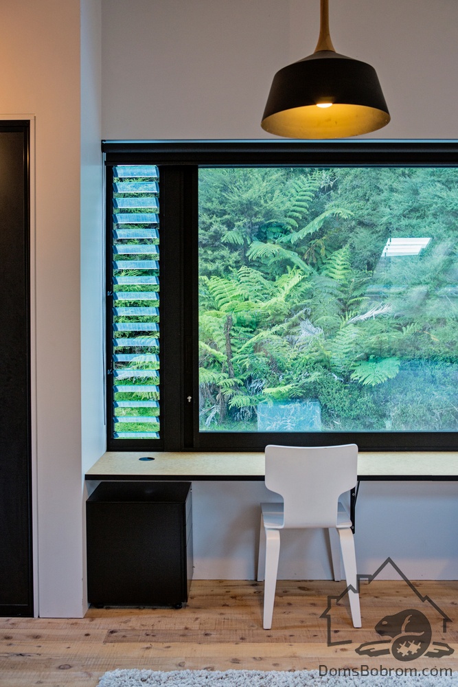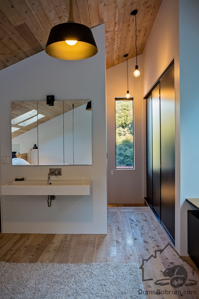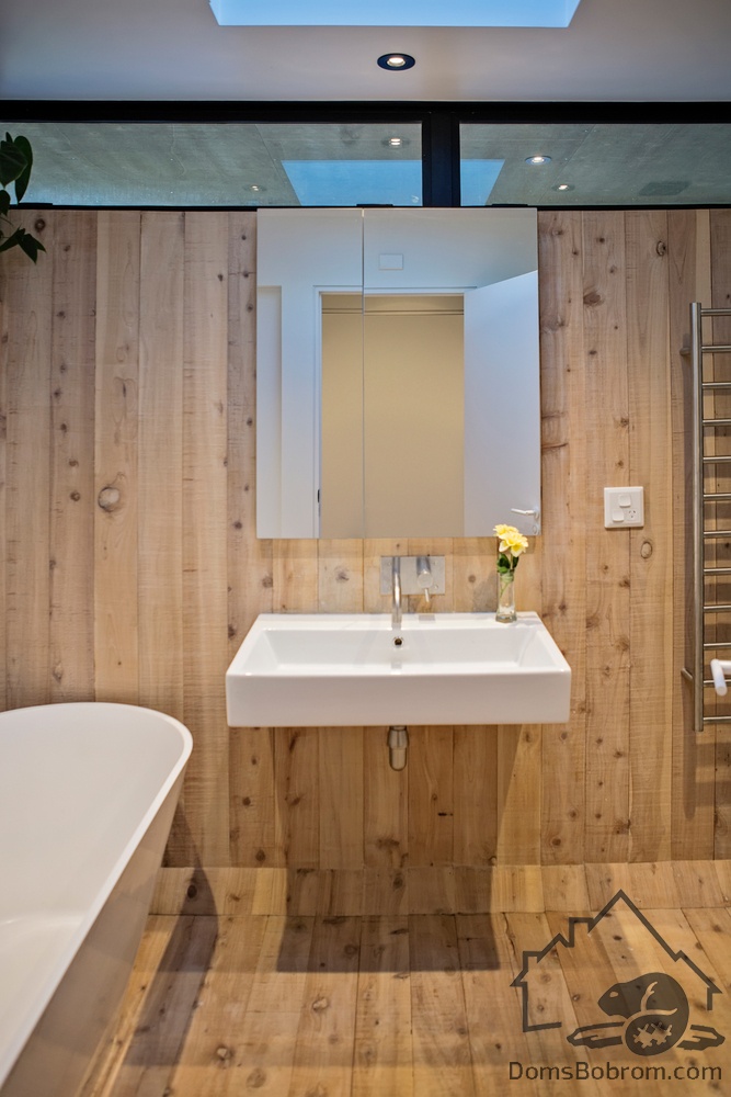Основной санузел дома находится между столовой и детской спальней. Простая цветовая палитра из дерева и белого была использована при его отделке, также добавлено окно в крыше для увеличения количества естественного света в дневное время.