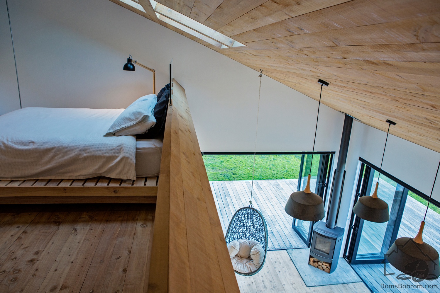 Наверху, на антресоли находится встроенный шкаф и небольшая туалетная зона и спальня. Над кроватью, частично подвешенной к наклонному потолку, расположены четыре световых люка. Из-за изголовья кровати видна гостиная внизу. Напротив кровати стоит простой письменный стол для двух человек, расположенный под большими окнами.