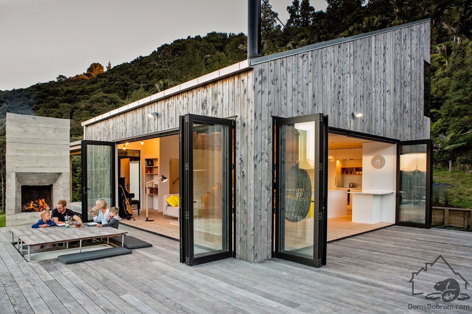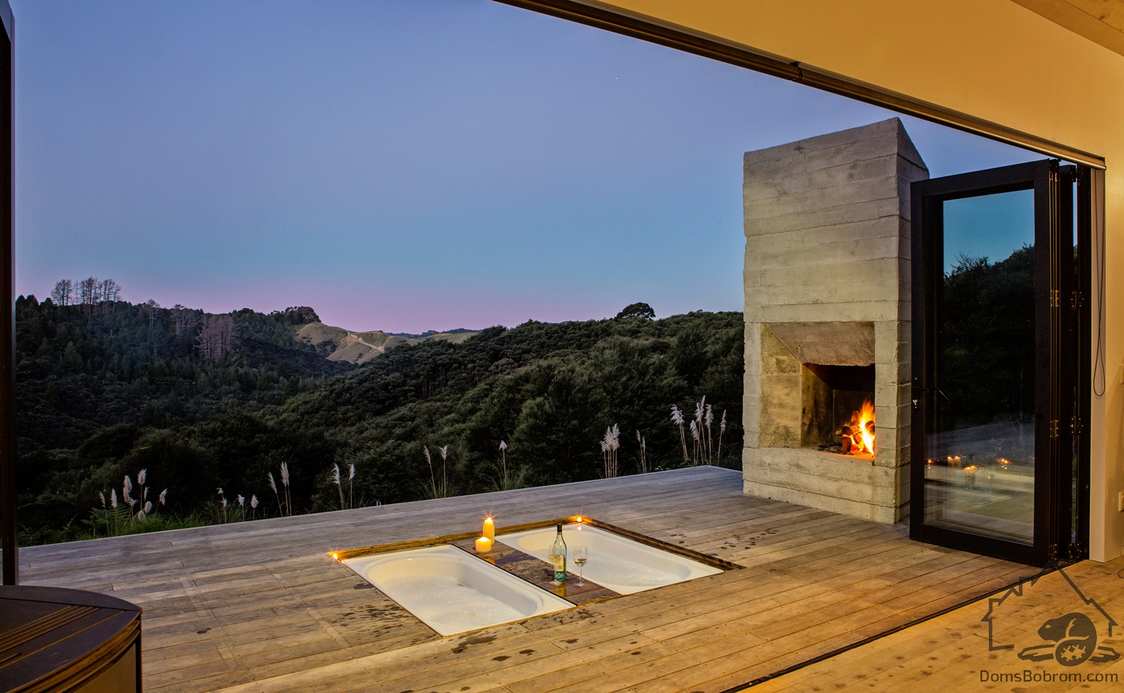 В передней части дома есть терраса с камином-барбекю и утопленными вниз ваннами. Когда ванны не используются, их закрывают крышкой. Это покрытие также можно поставить и использовать в качестве обеденного стола на открытом воздухе, когда люди сидят прямо на террасе с подушками и ногами в пустых ваннах.