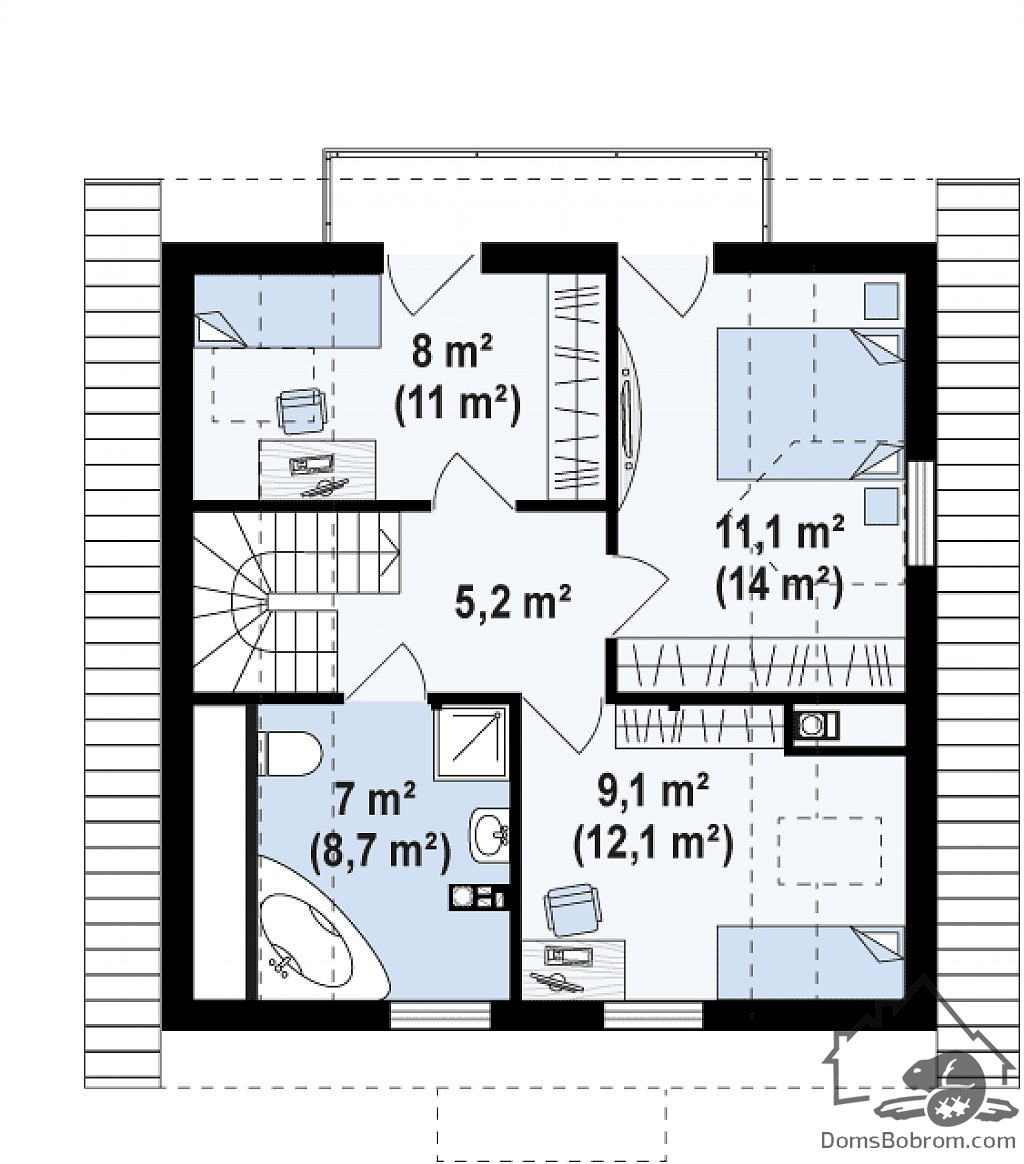 На втором этаже дома по проекту предусмотрены три спальни и ванная комната. Все помещения очень эргономичны, здесь нет лишних углов и ненужной площади.