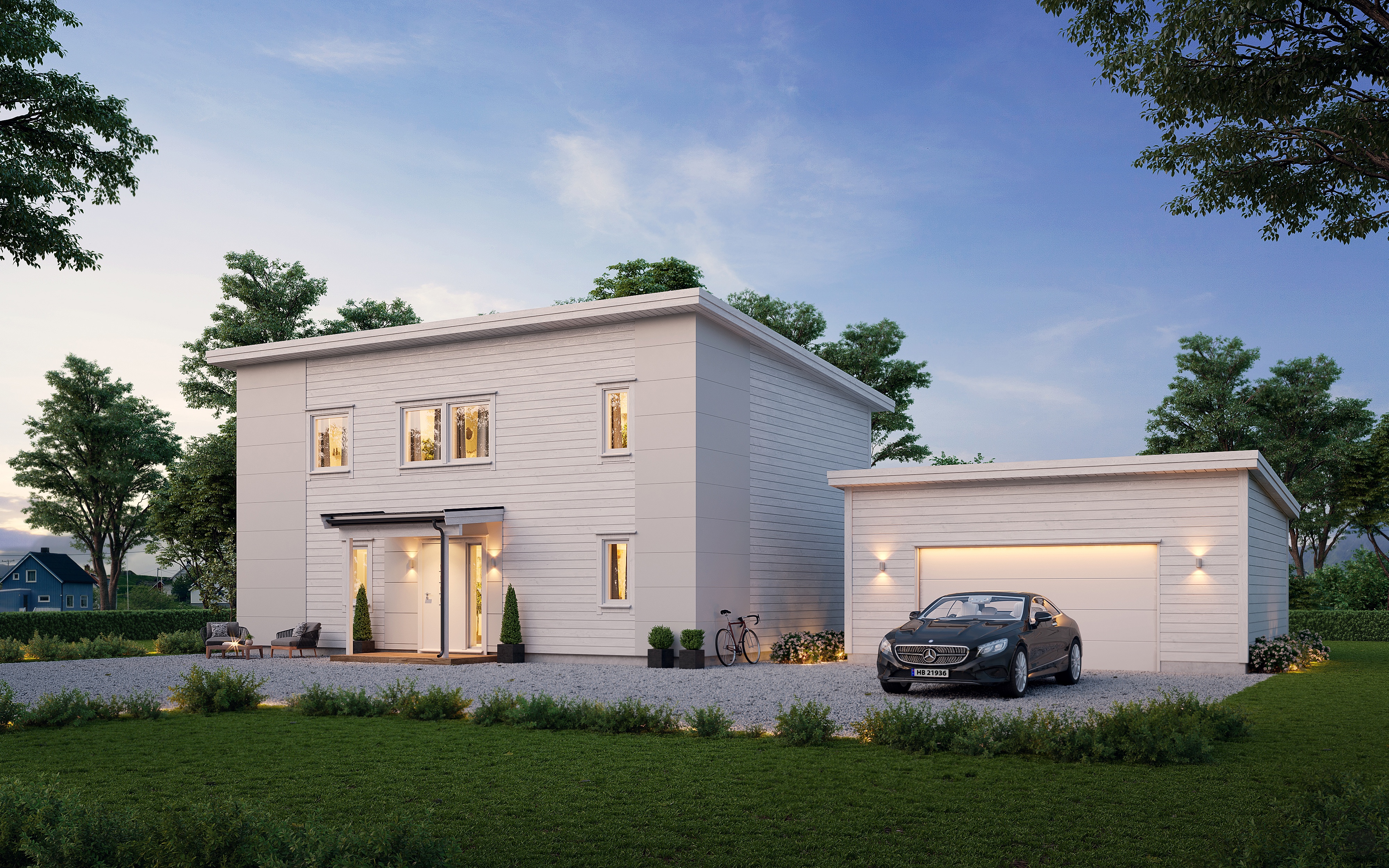 Дома Kvadrat - это компактный и функциональный дом, в котором может разместиться вся большая семья. Дом имеет современный вид, в отделке фасада преобладают узкие линии. Преимуществом является крытый вход. Внутри дома 5 спален, к главной спальне примыкает гардеробная. Есть 2 ванные комнаты, прачечная и открытая кухня и гостиная. Второй этаж отведен под приватную зону спален.