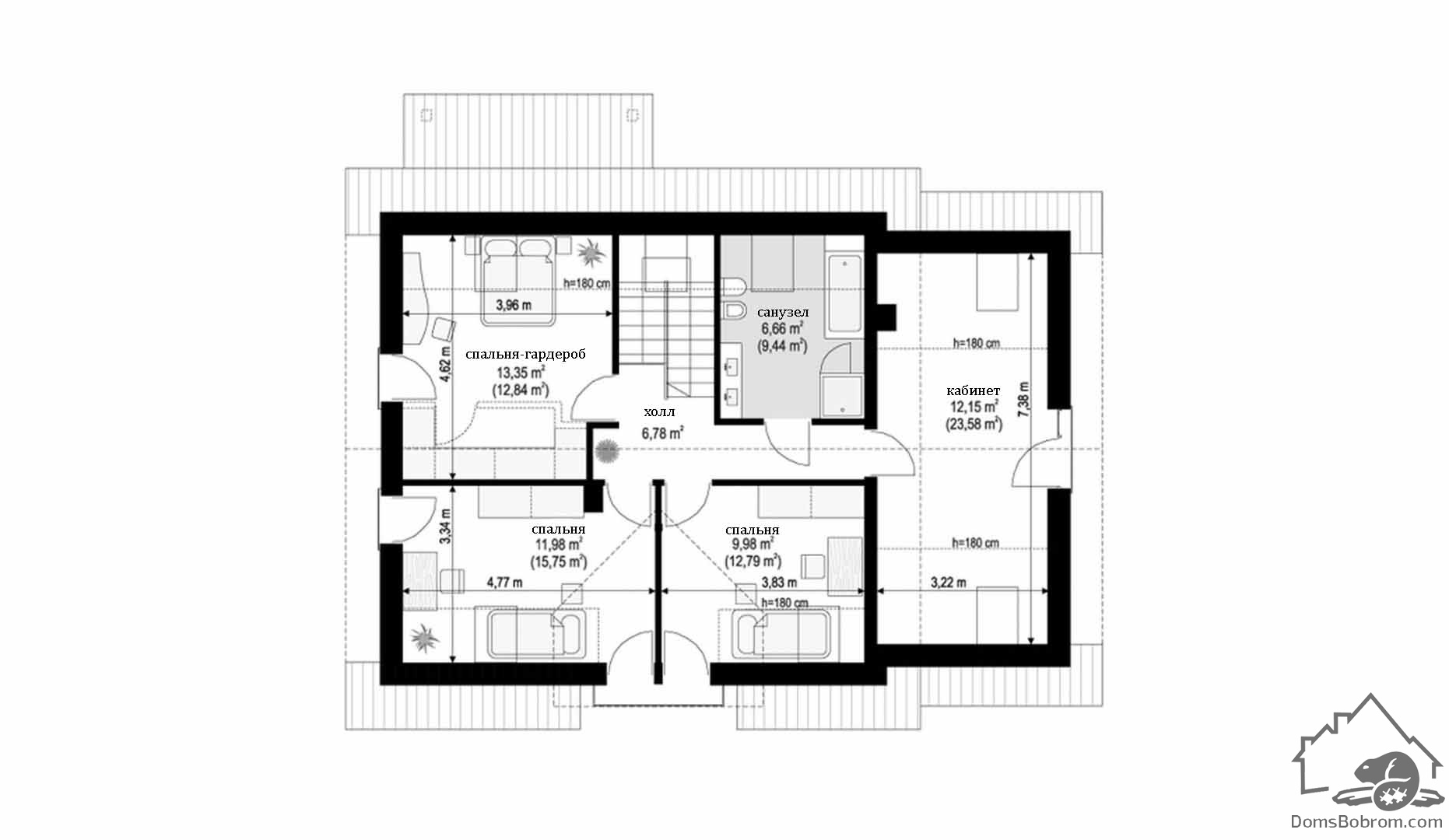 На мансардном этаже, несмотря на покатую крышу, расположено четыре уютных комнаты и большая ванная. В одной из спален есть большой шкаф-гардероб. Мансардный этаж можно увеличить, немного приподняв стены.