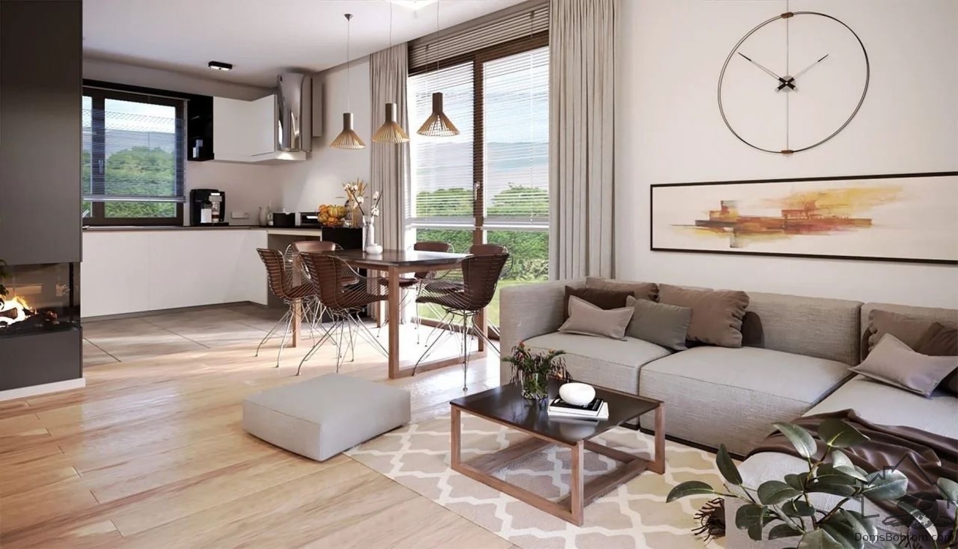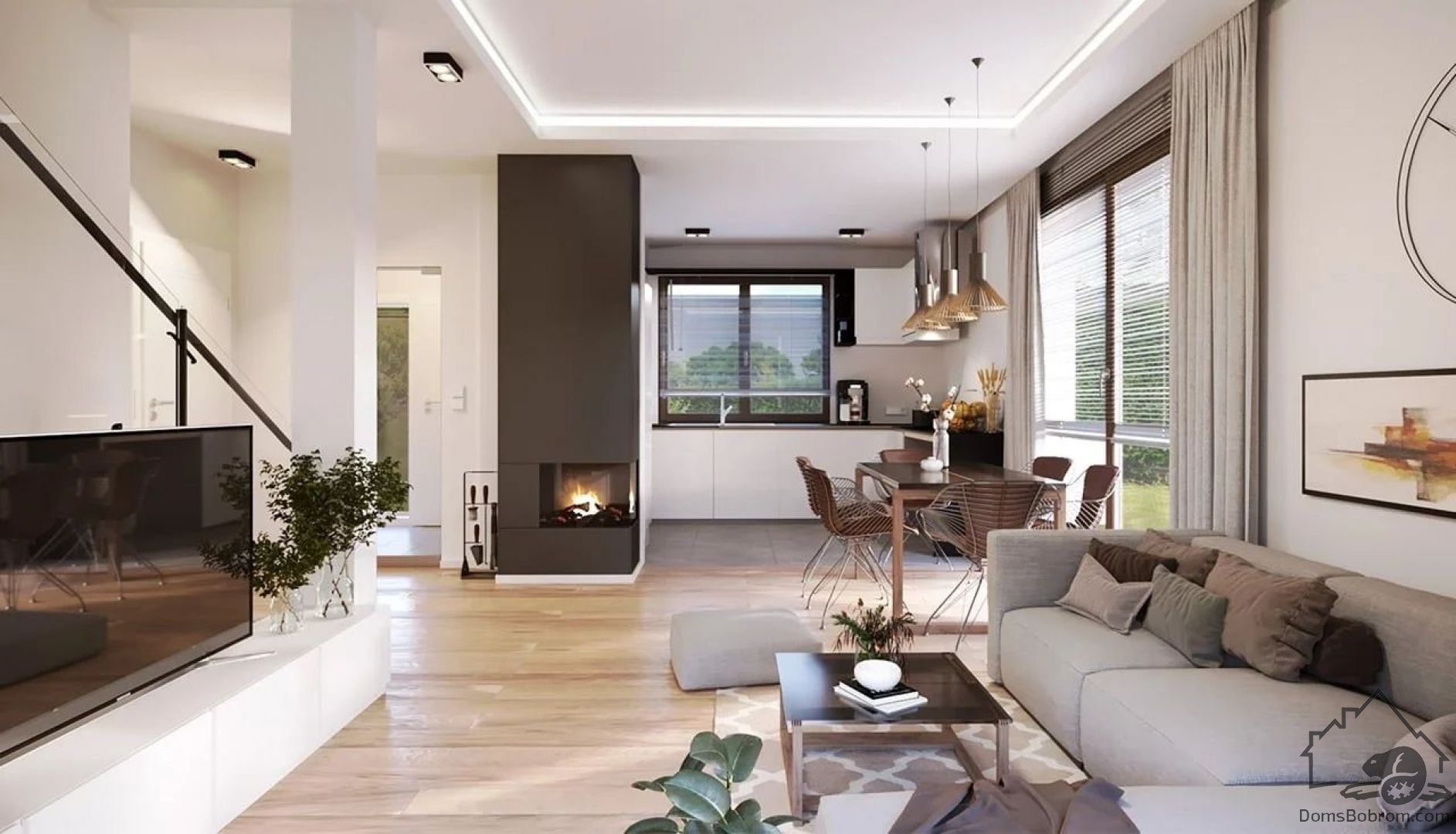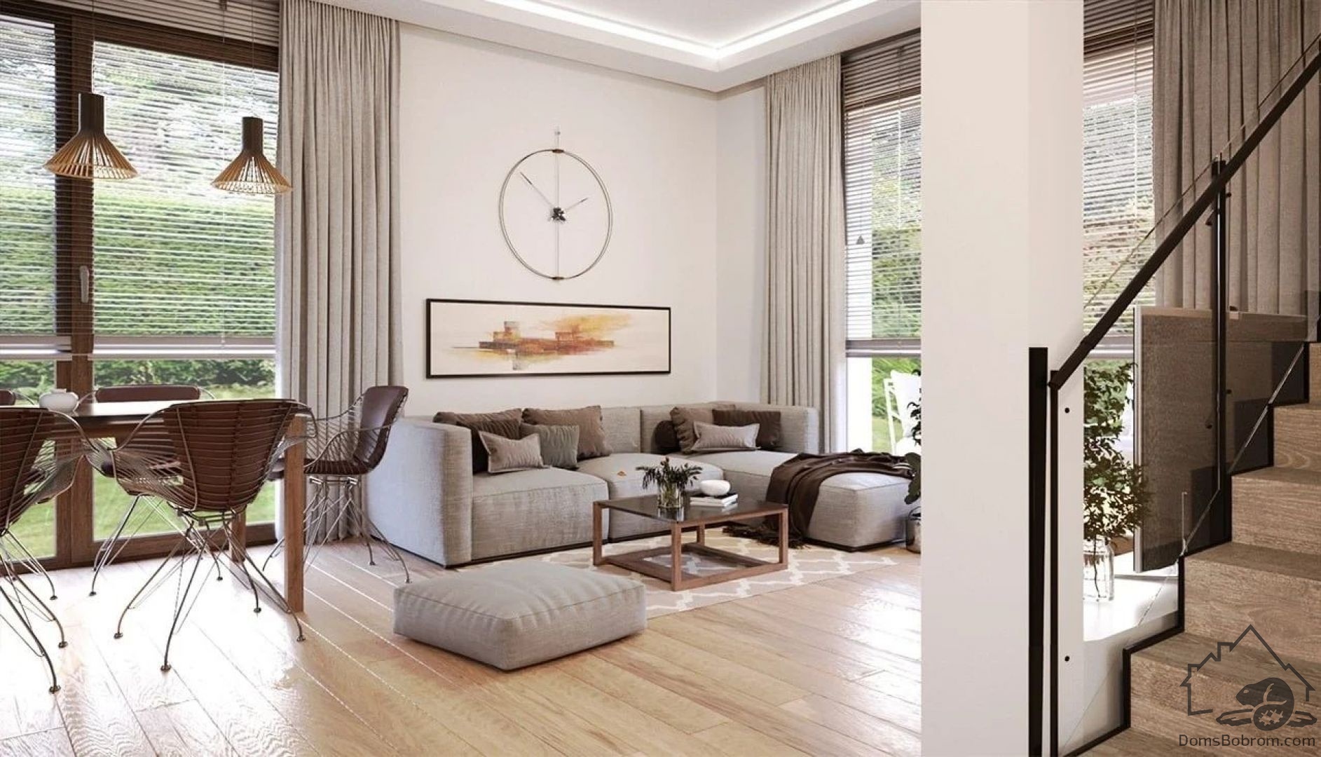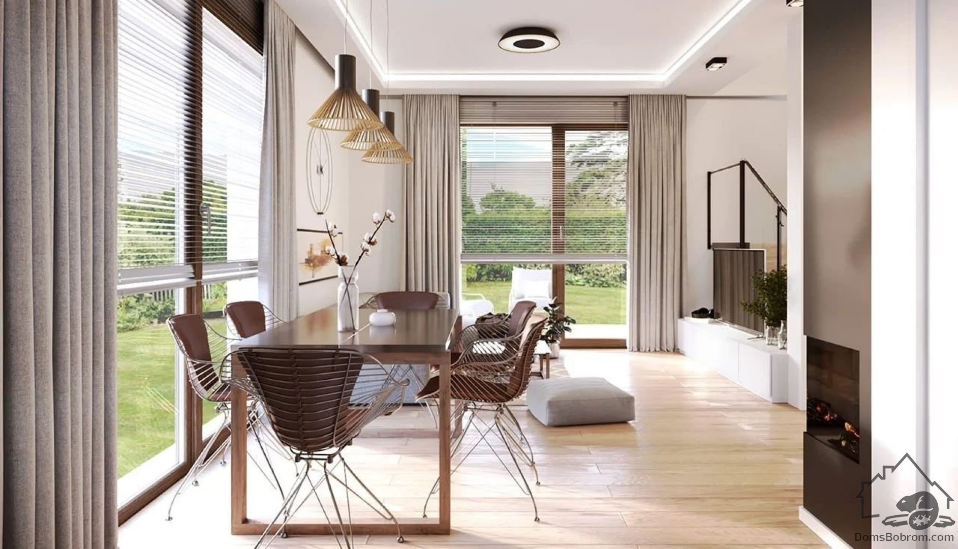 Интерьер дома Narciss оформлен в теплых бежевых и коричневых тонах с добавлением серого. Благодаря большим окнам дневная зона очень светлая.